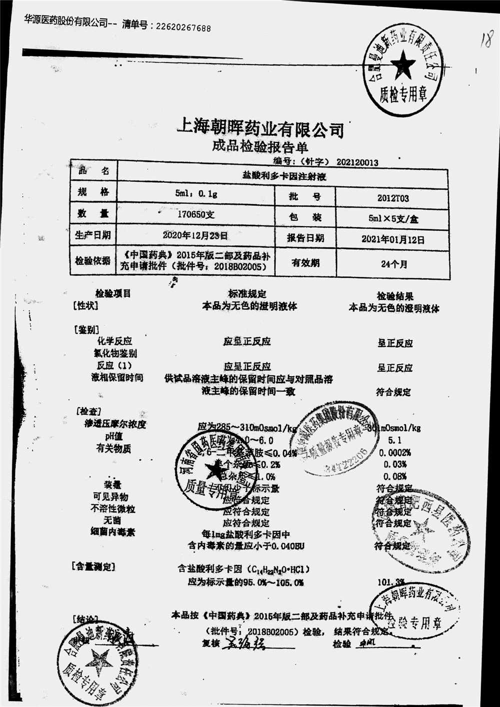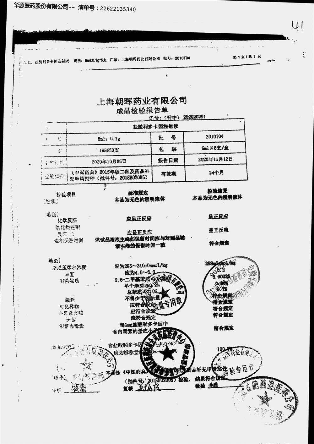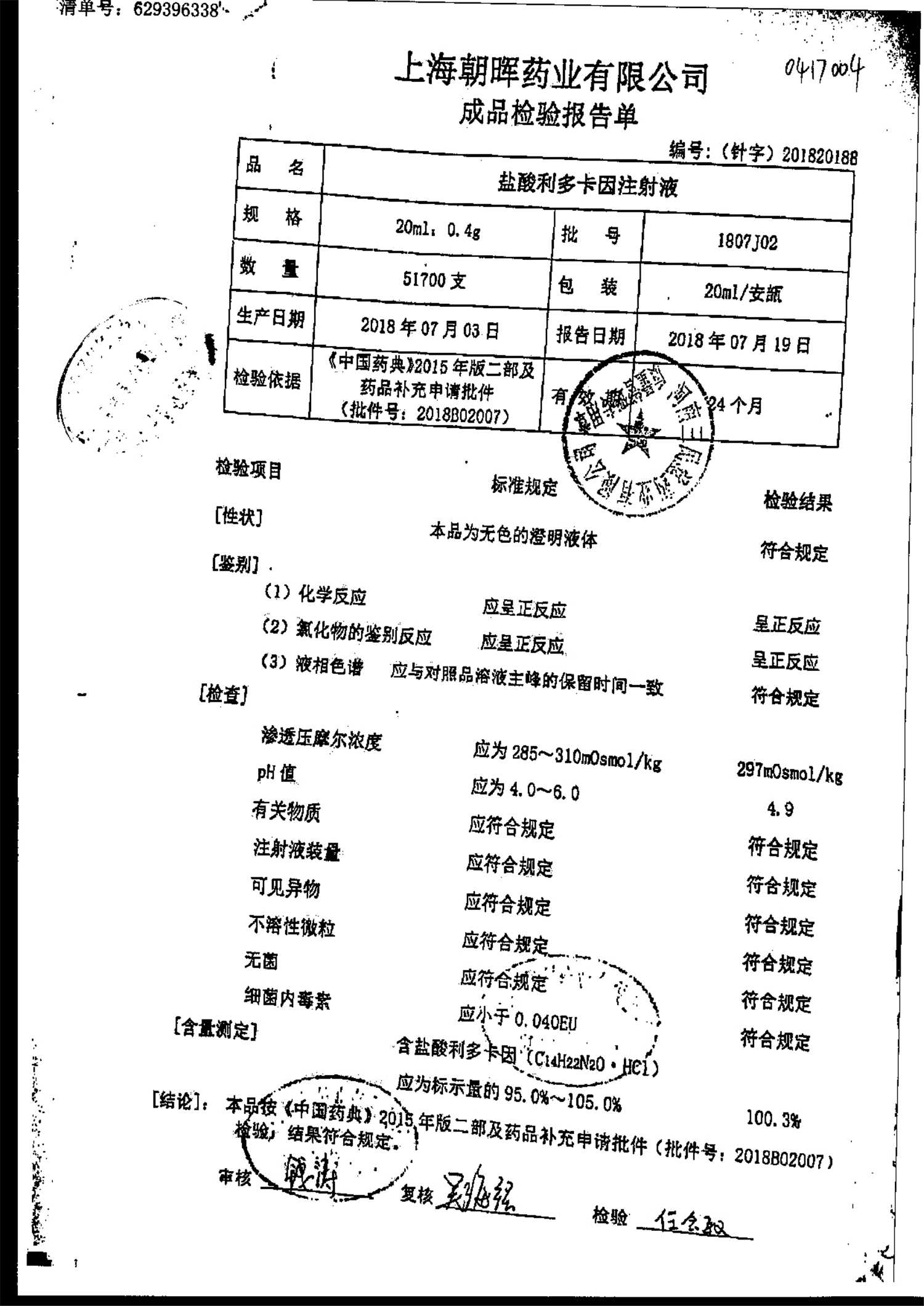 盐酸利多卡因注射液 | 20ml:0.4g | 1807J02 | 查看详情 |