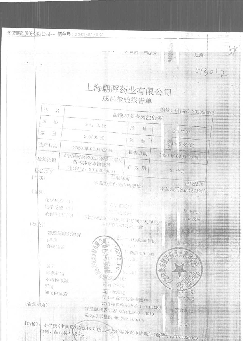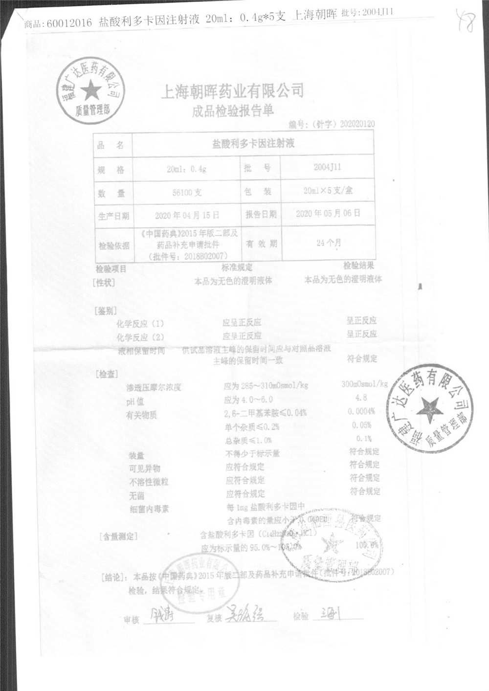 盐酸利多卡因注射液 | 20ml:0.4g | 2007J06 | 查看详情 |
