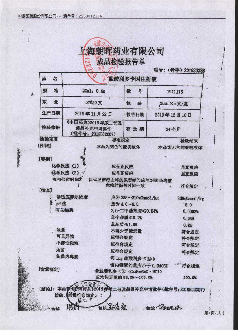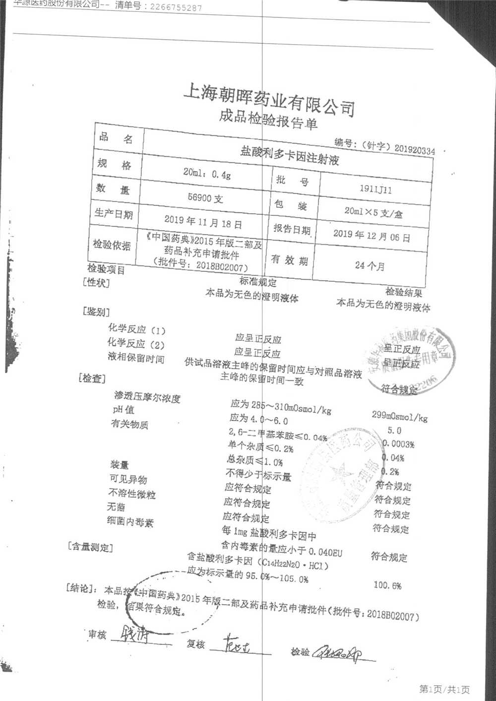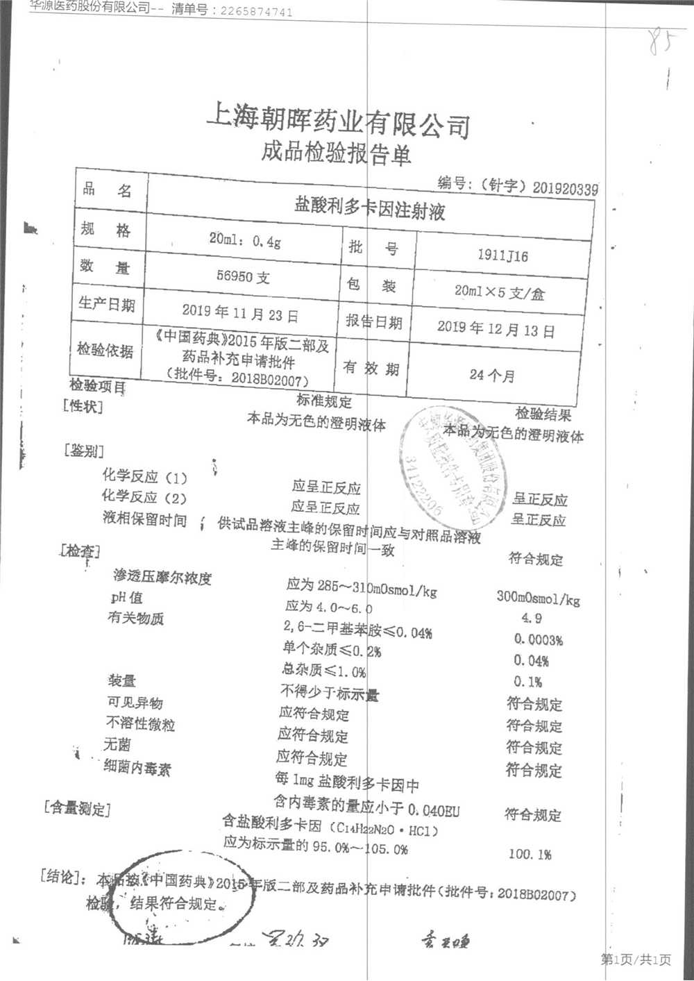 盐酸利多卡因注射液 | 20ml:0.4g | 1911J16 | 查看详情 |