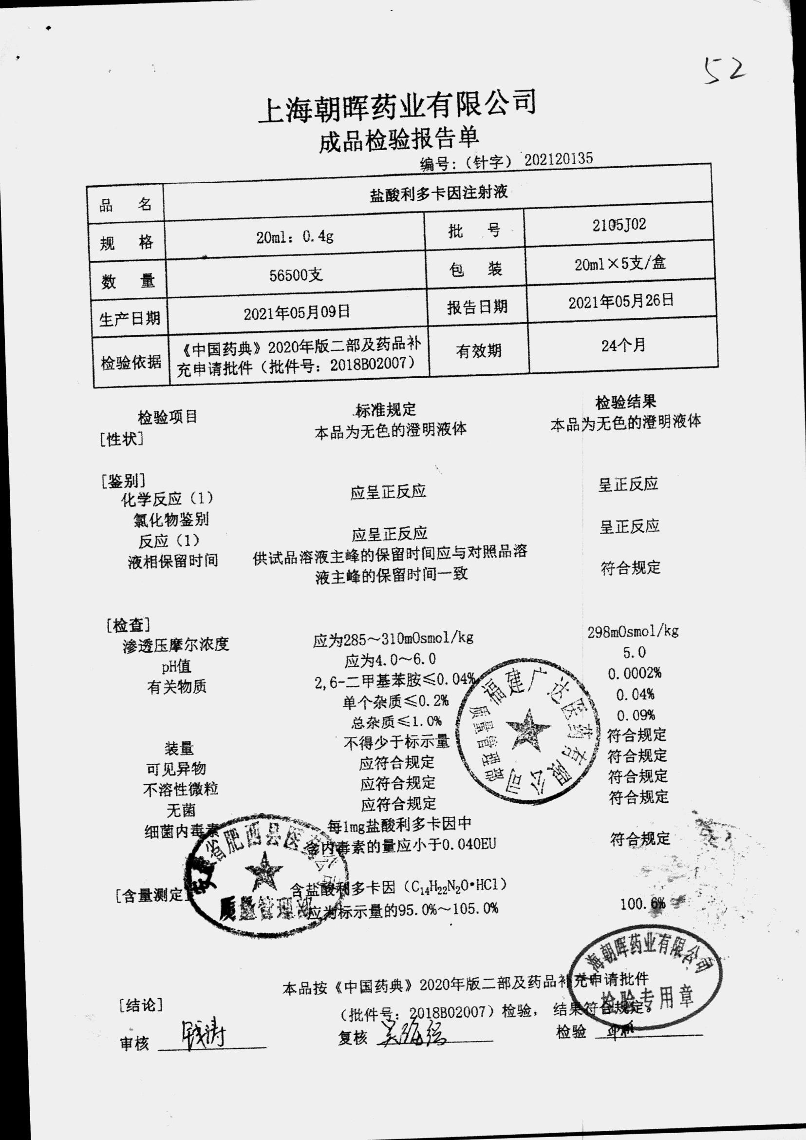 盐酸利多卡因注射液 | 20ml:0.4g | 2105J02 | 查看详情 |