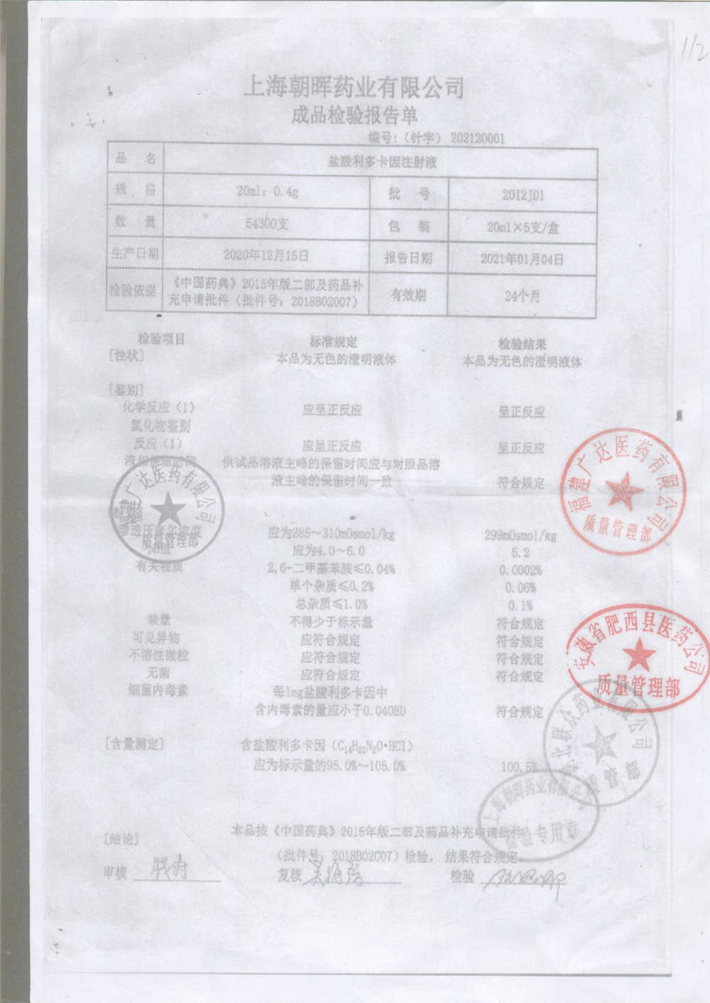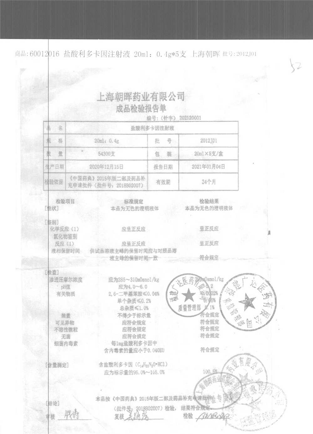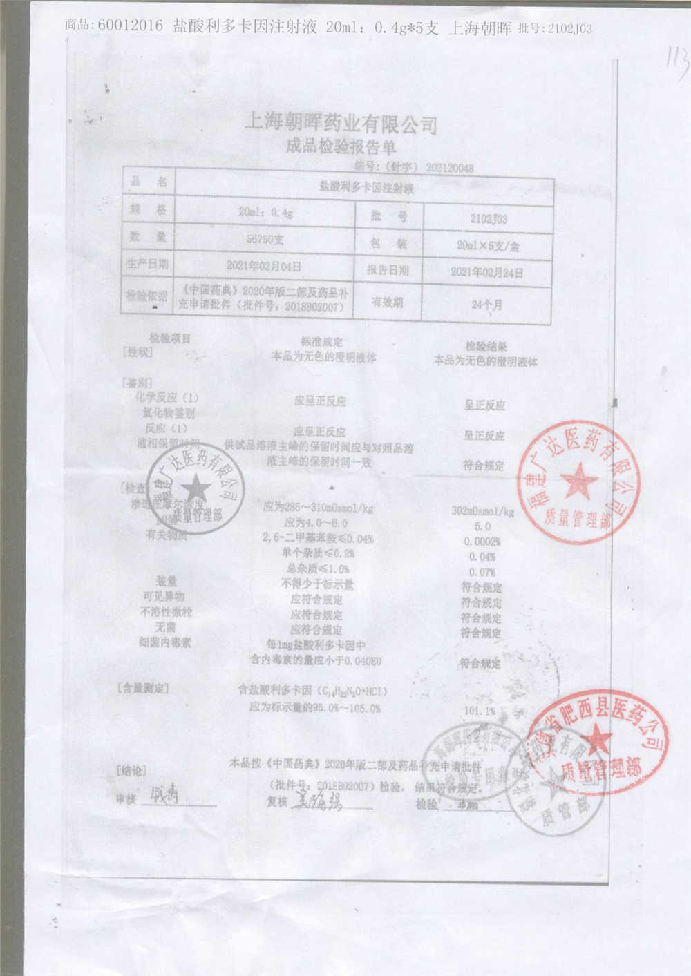 盐酸利多卡因注射液 | 20ml:0.4g | 2012J01 | 查看详情 |