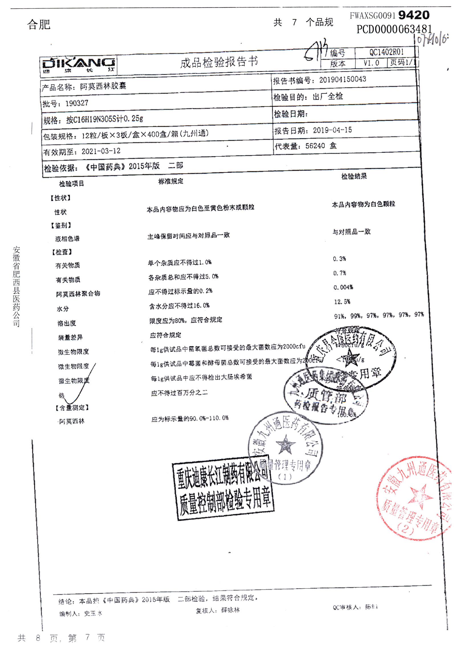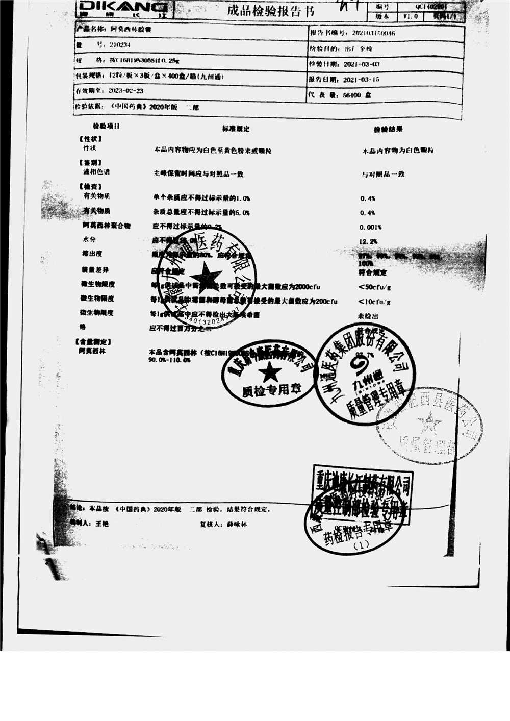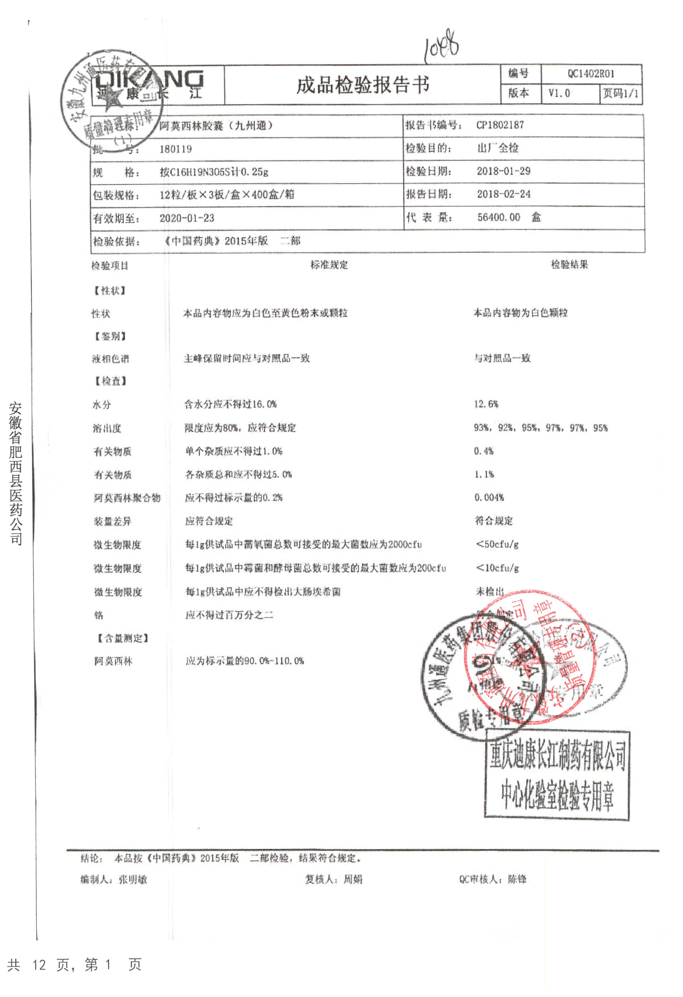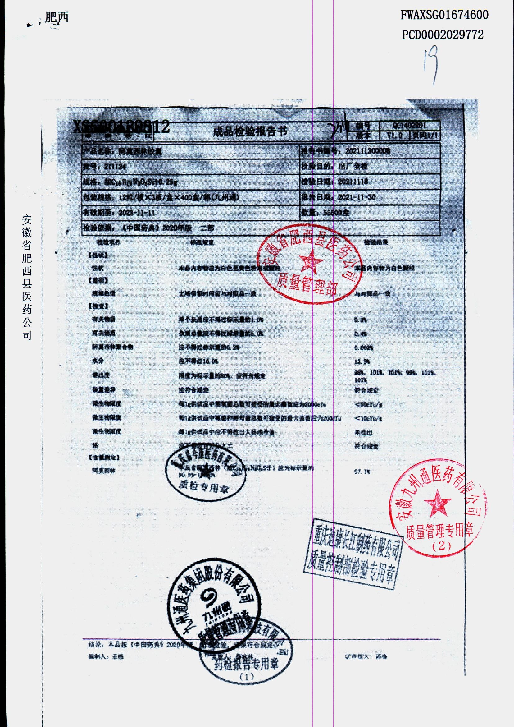 阿莫西林胶囊 | 0.25g*36粒 | 190510 | 查看详情 |
