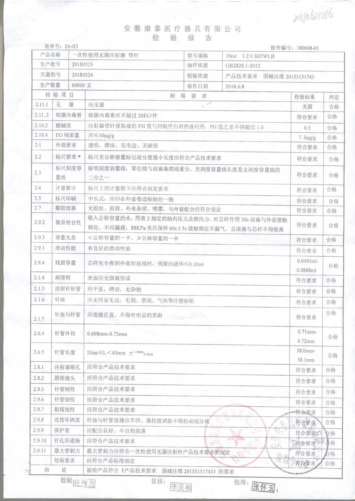 一次性使用无菌注射器 带针 | 10ml 1.2*30TWLB | 20180523 | 查看详情 |