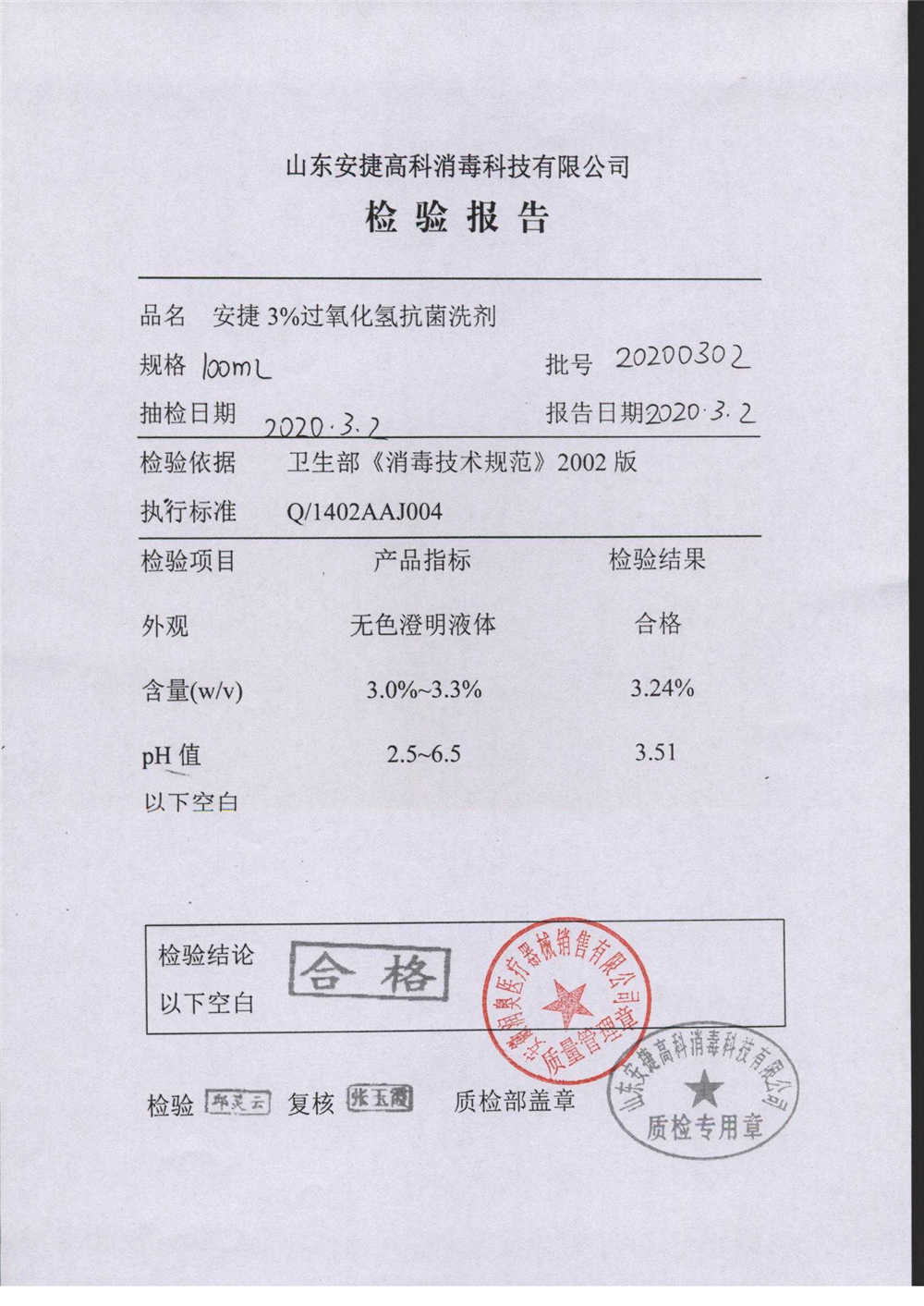 安捷3%过氧化氢抗菌洗剂 | 100ml | 20200302 | 查看详情 |