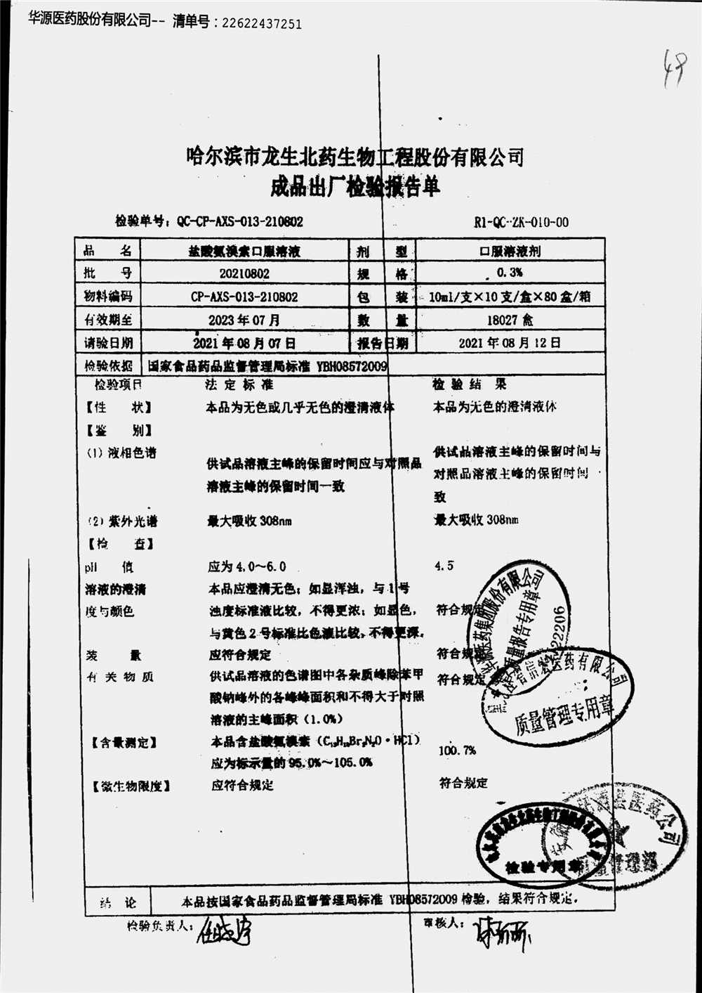 盐酸氨溴索口服溶液 | 10ml | 20210802 | 查看详情 |