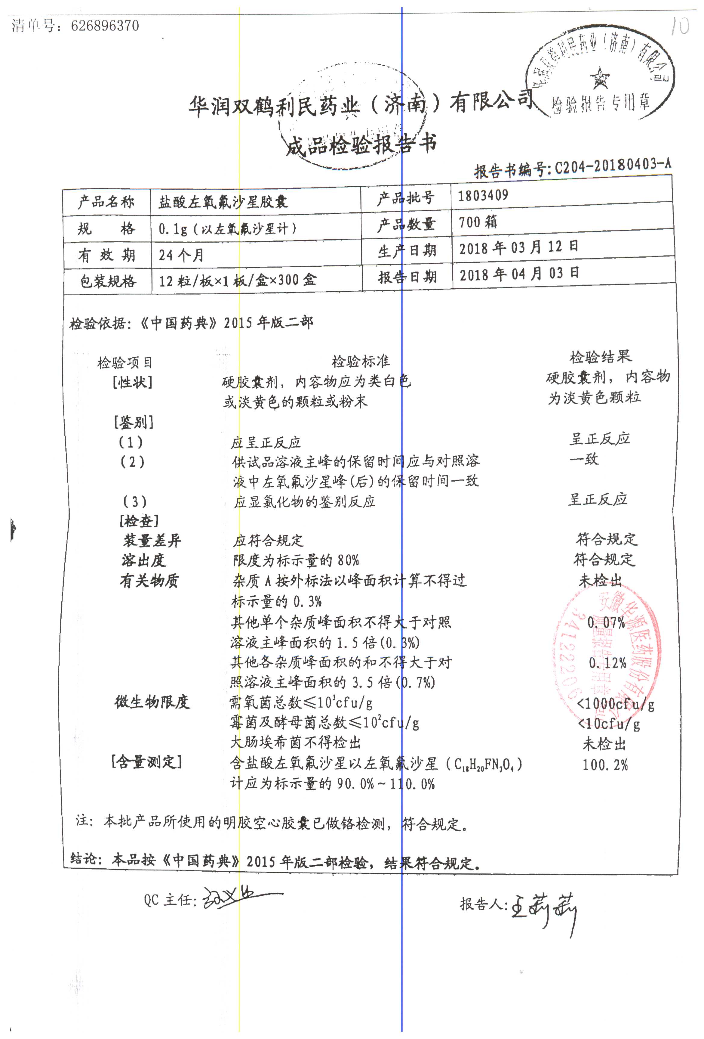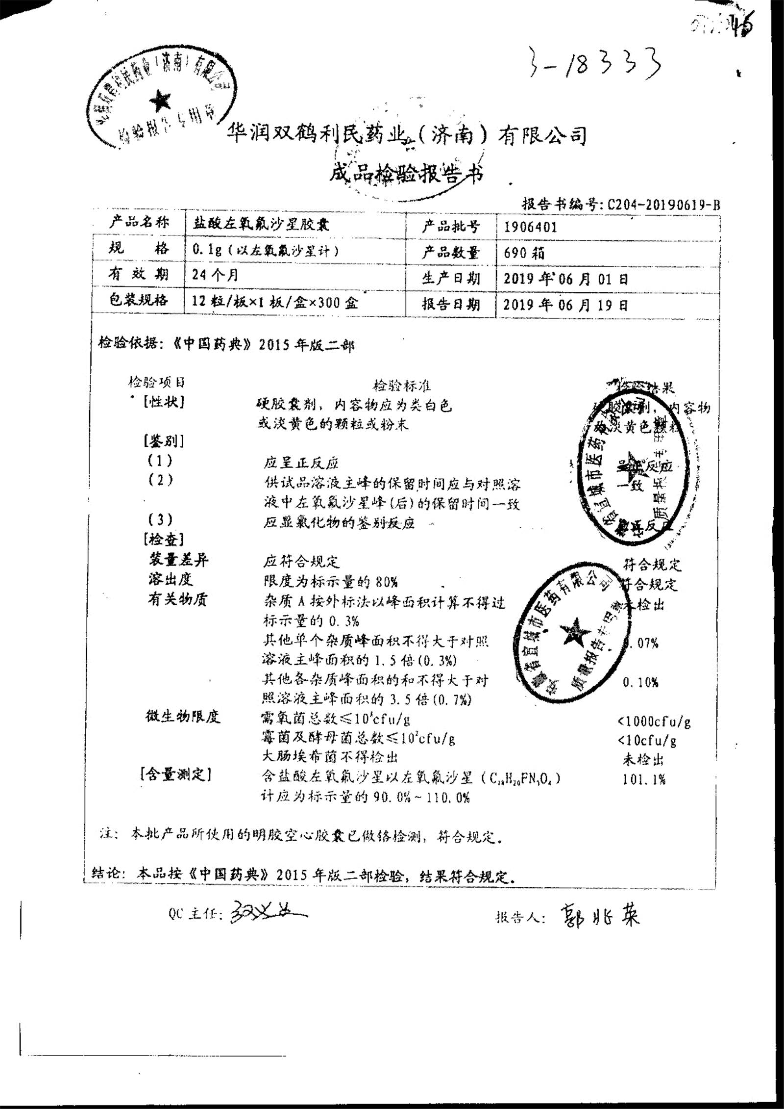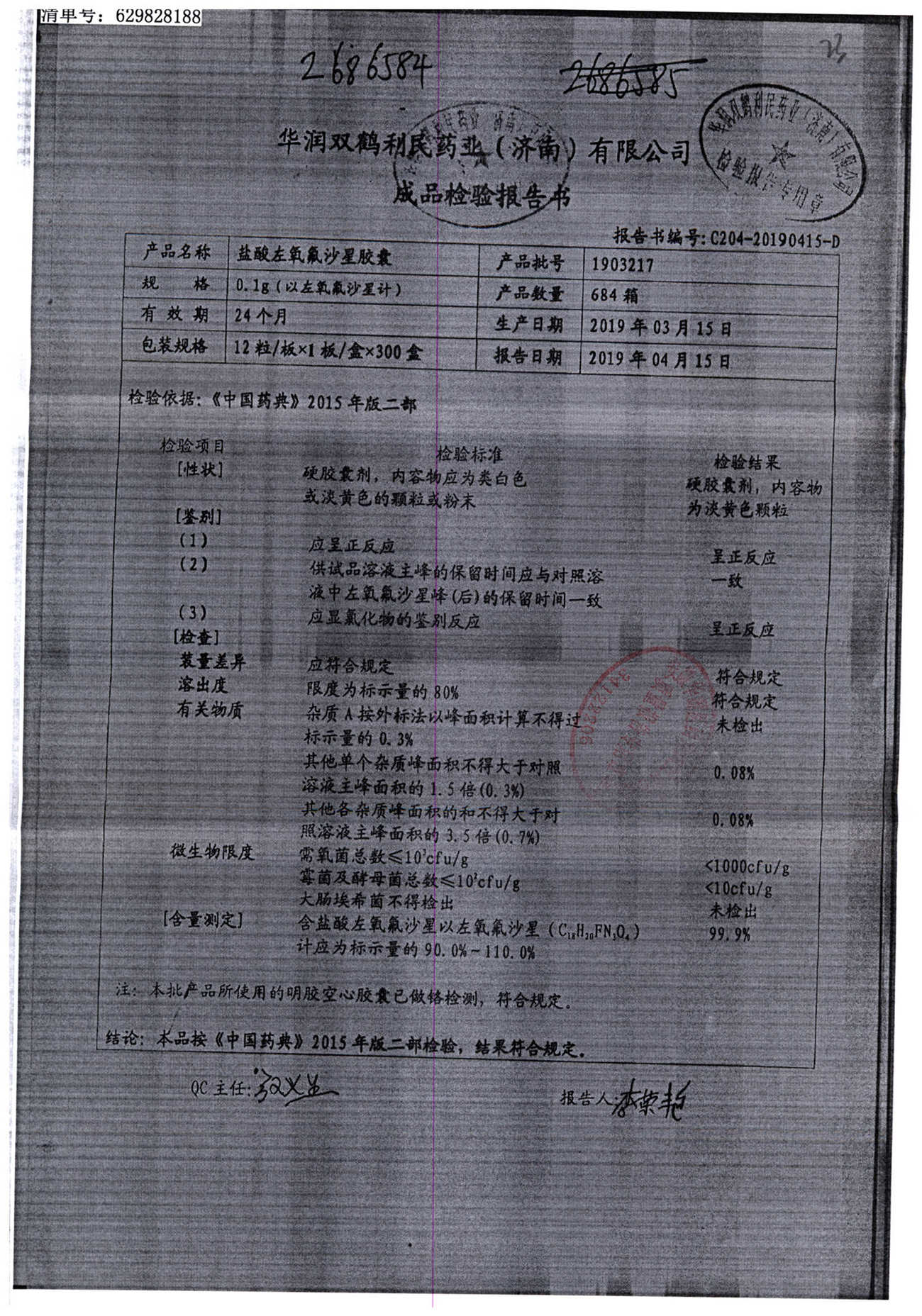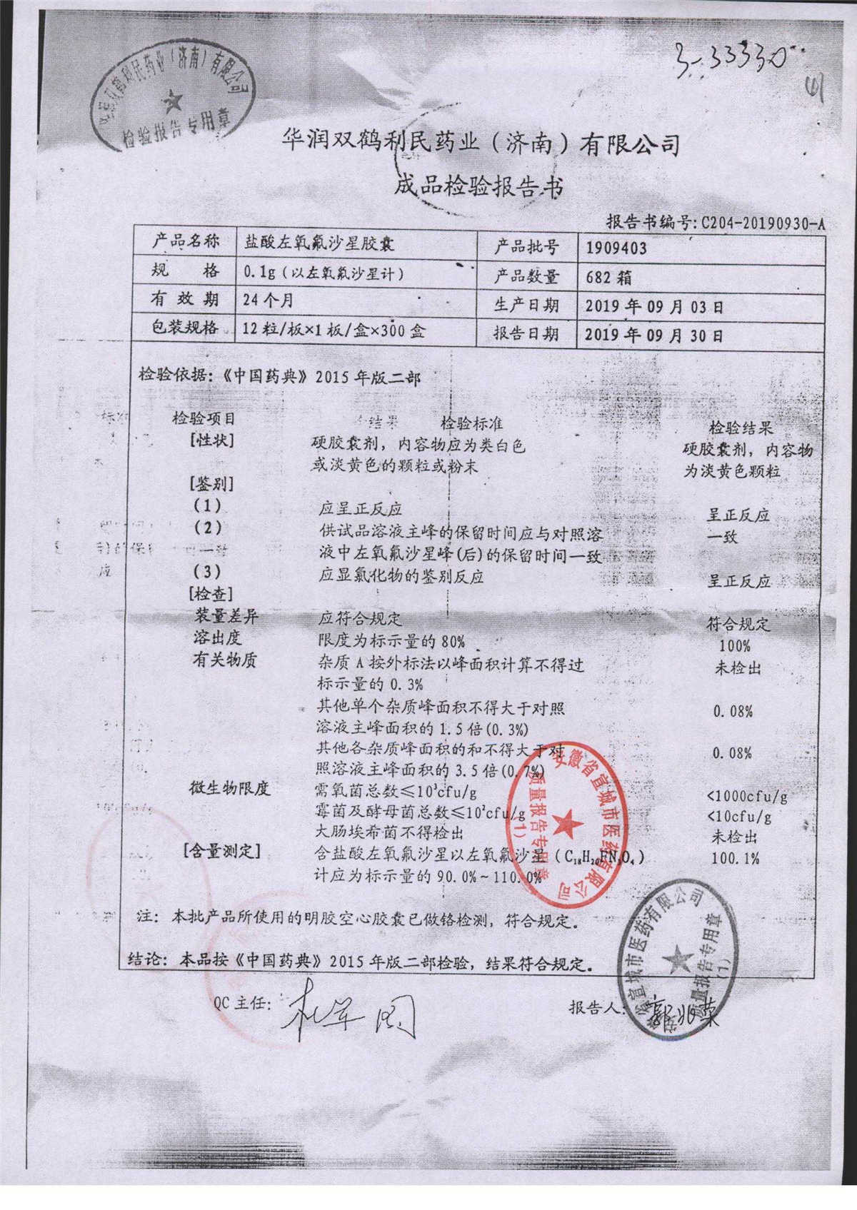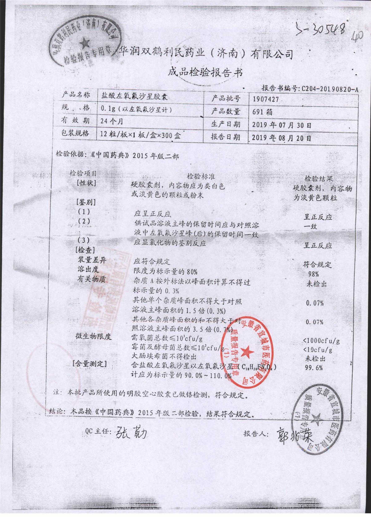 盐酸左氧氟沙星胶囊 | 0.1g | 1901204 | 查看详情 |