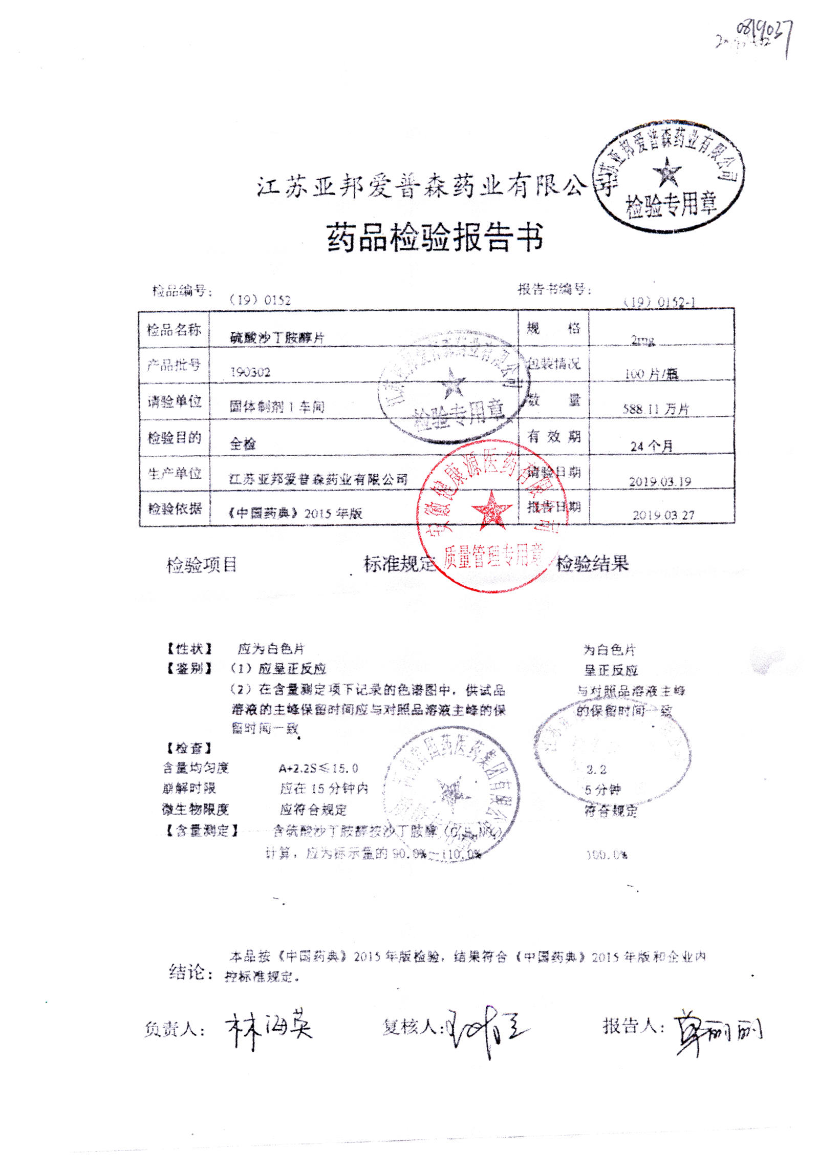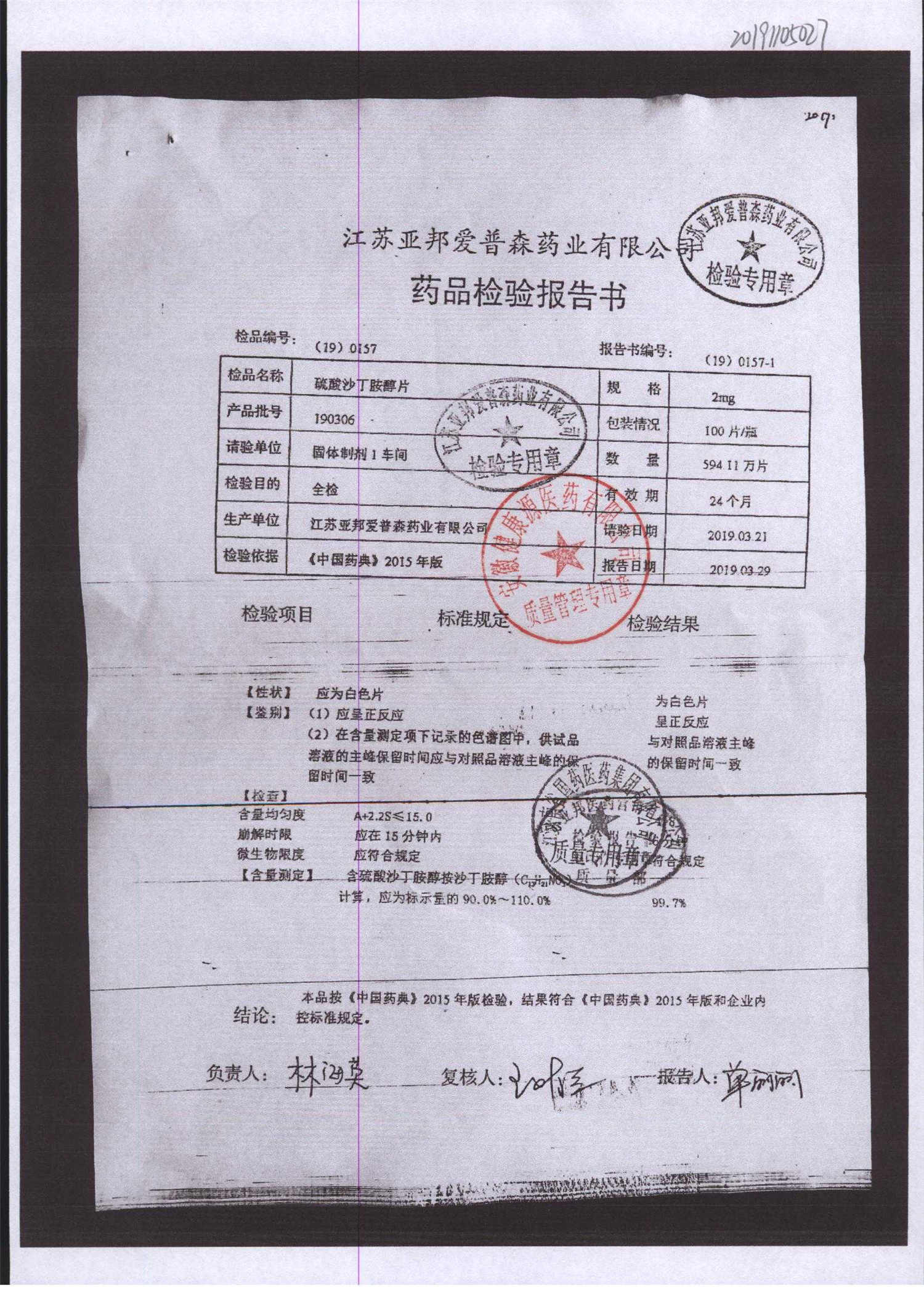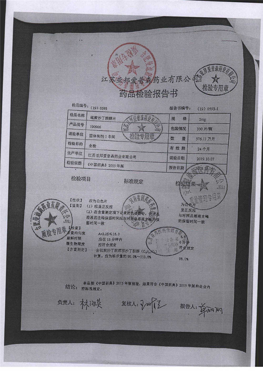 硫酸沙丁胺醇片 | 2mg | 190906 | 查看详情 |