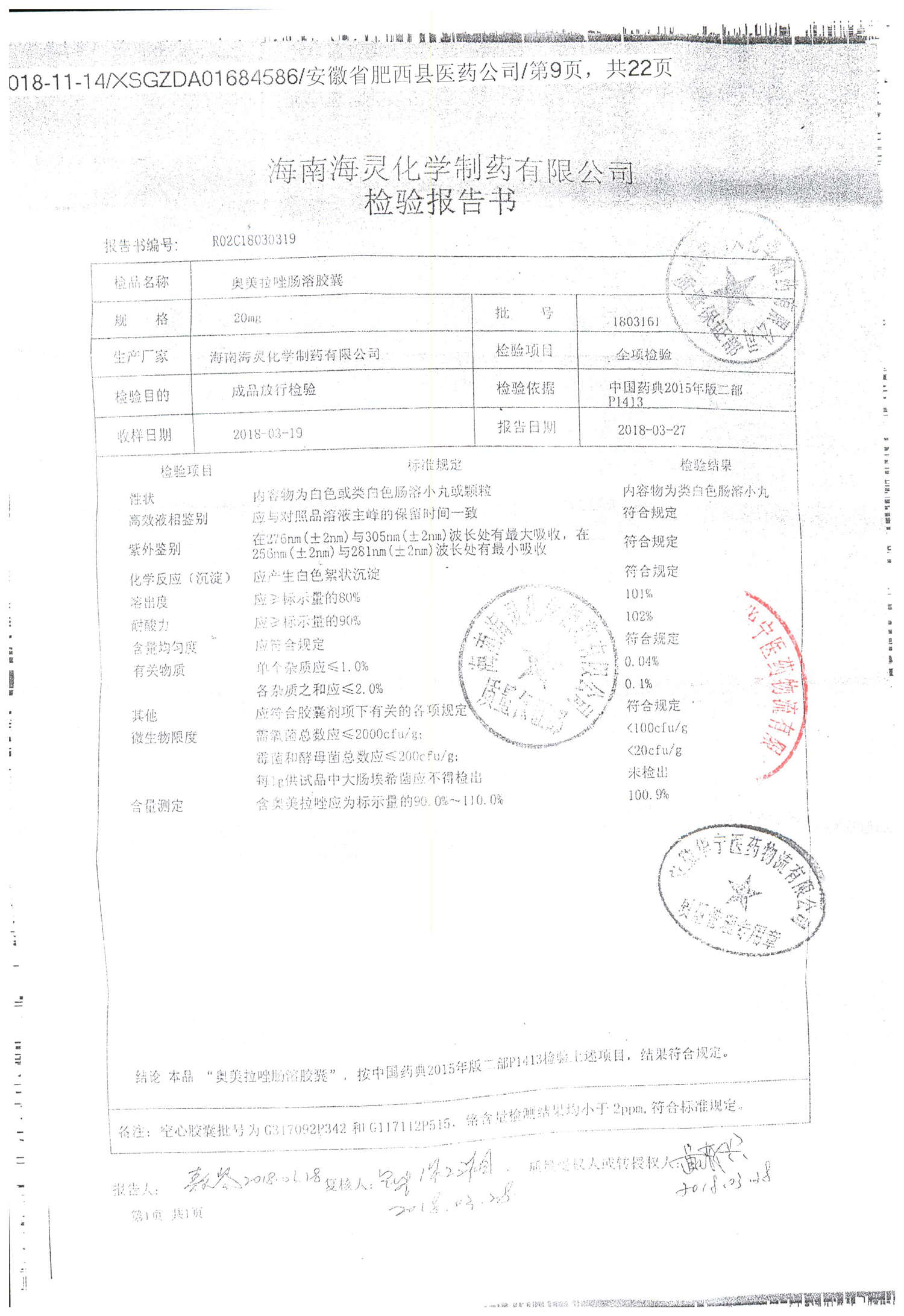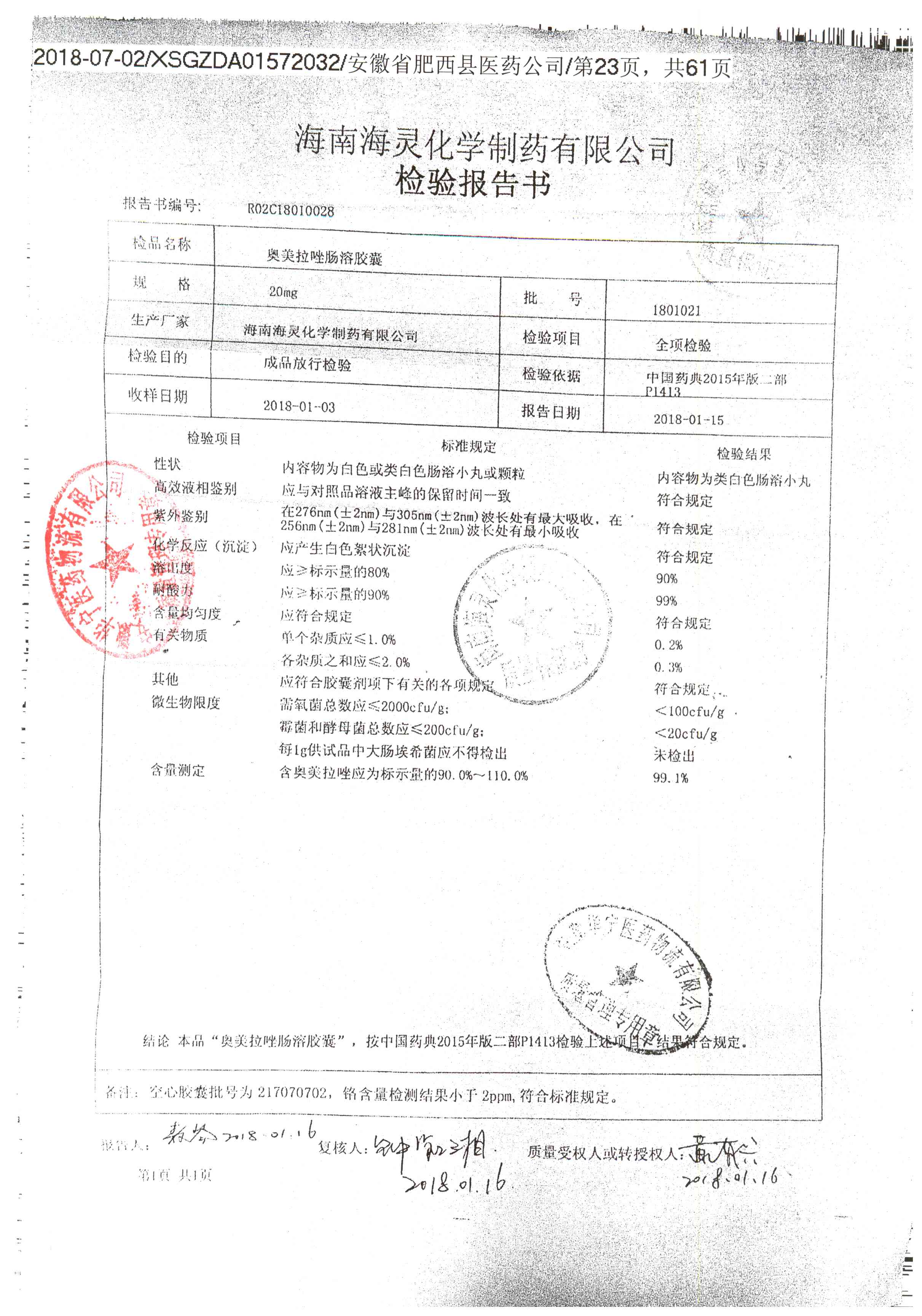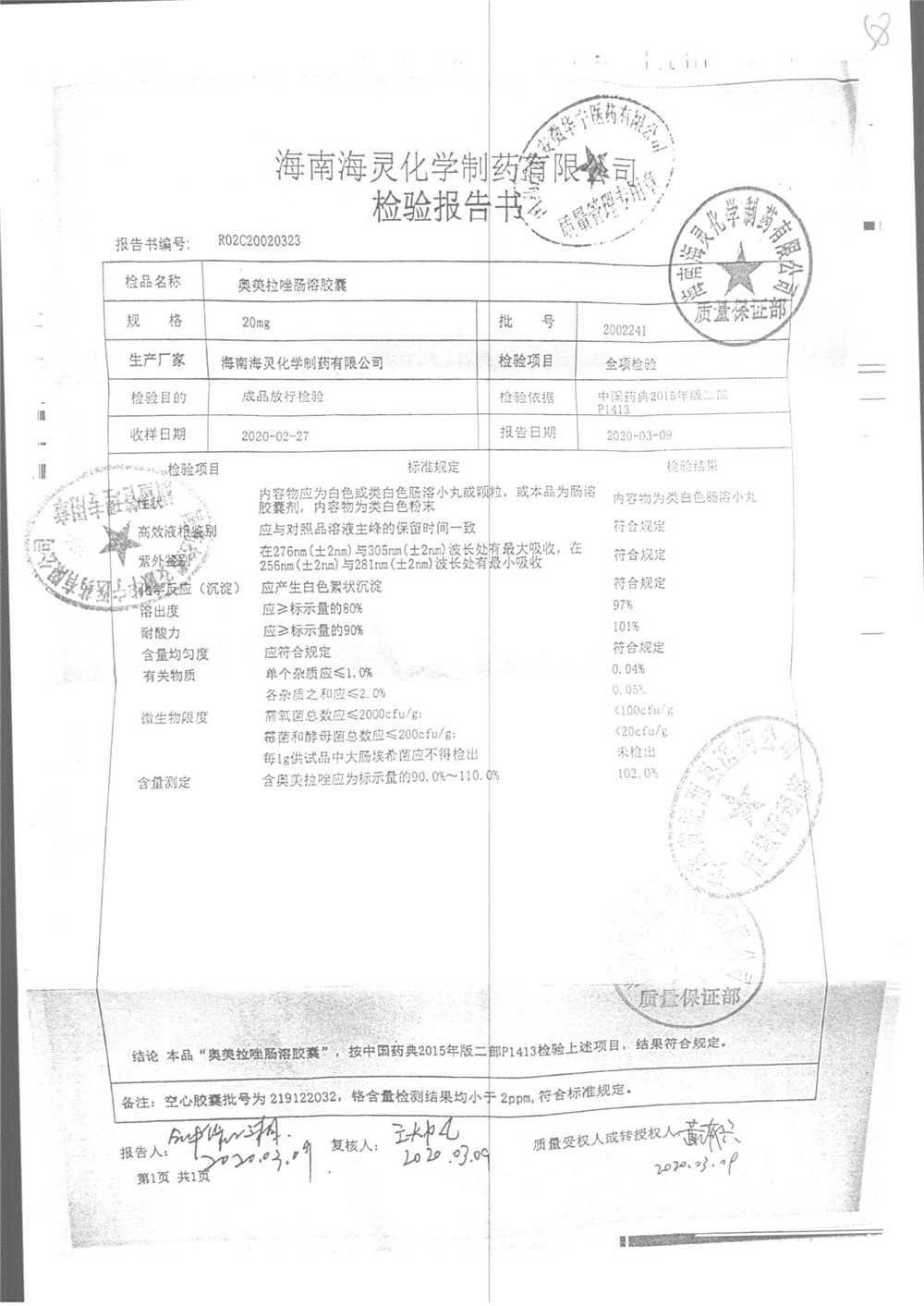 奥美拉唑肠溶胶囊 | 20mg | 1803161 | 查看详情 |