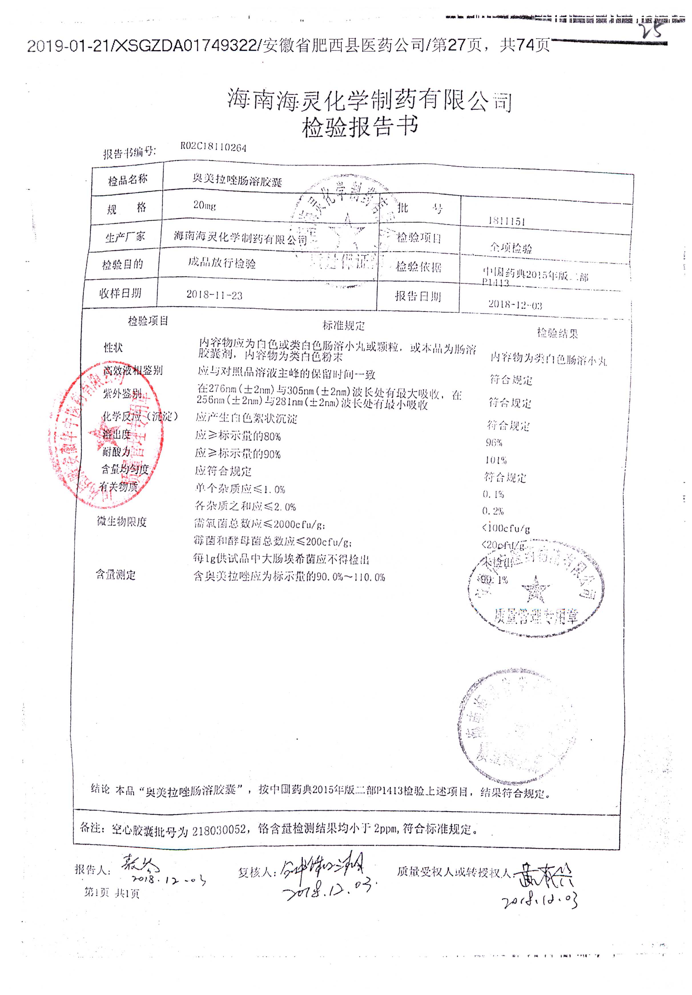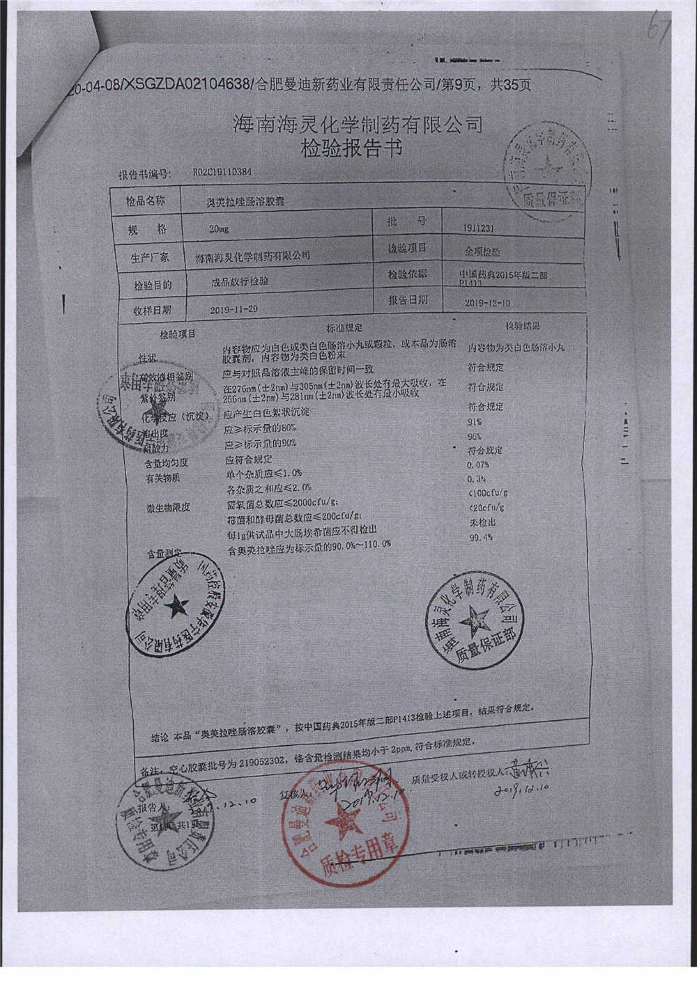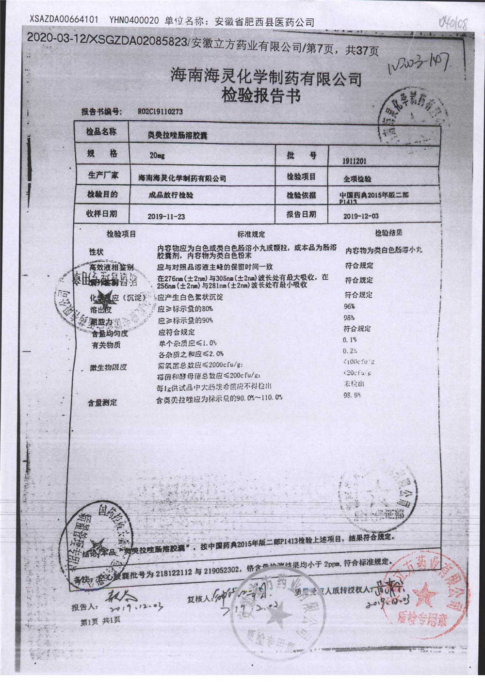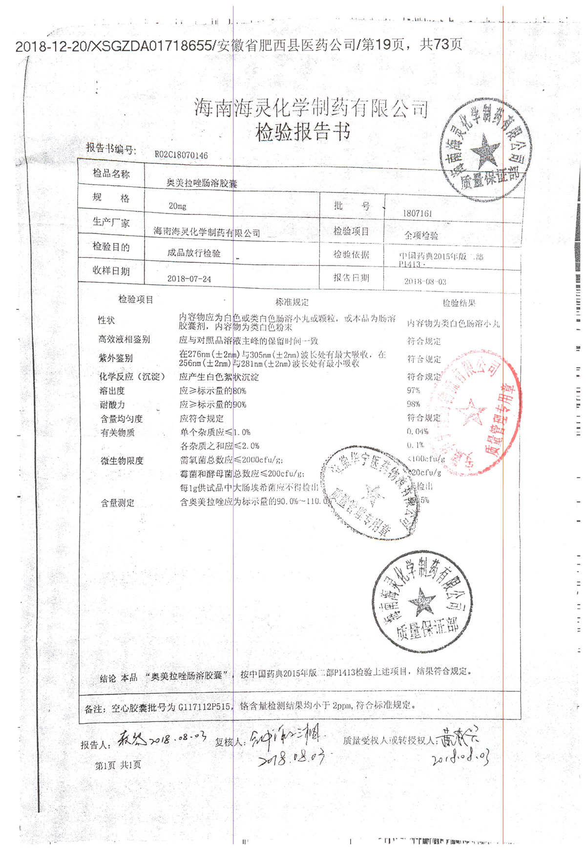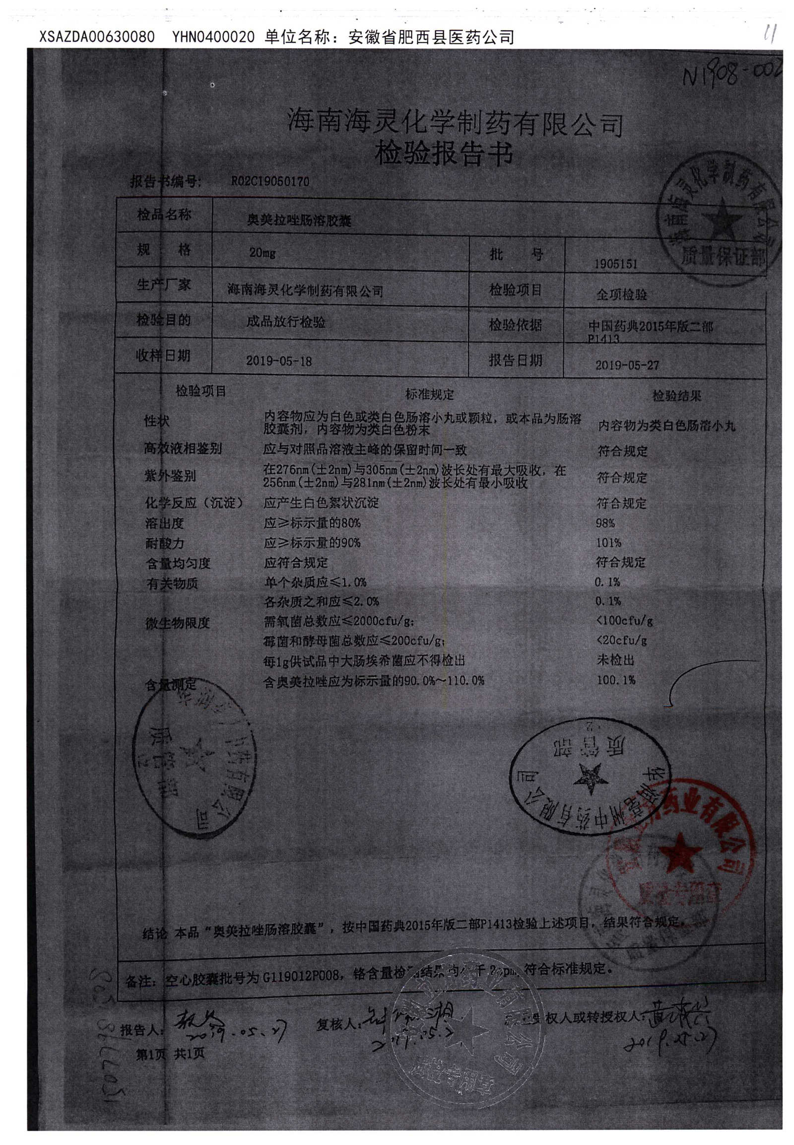 奥美拉唑肠溶胶囊 | 20mg | 1905151 | 查看详情 |