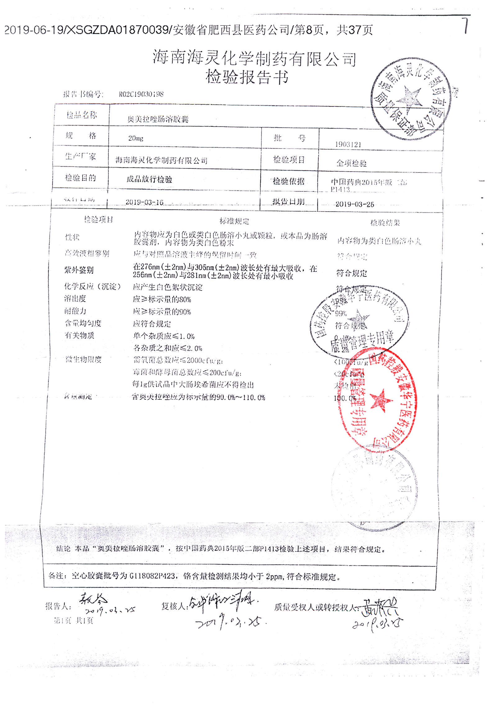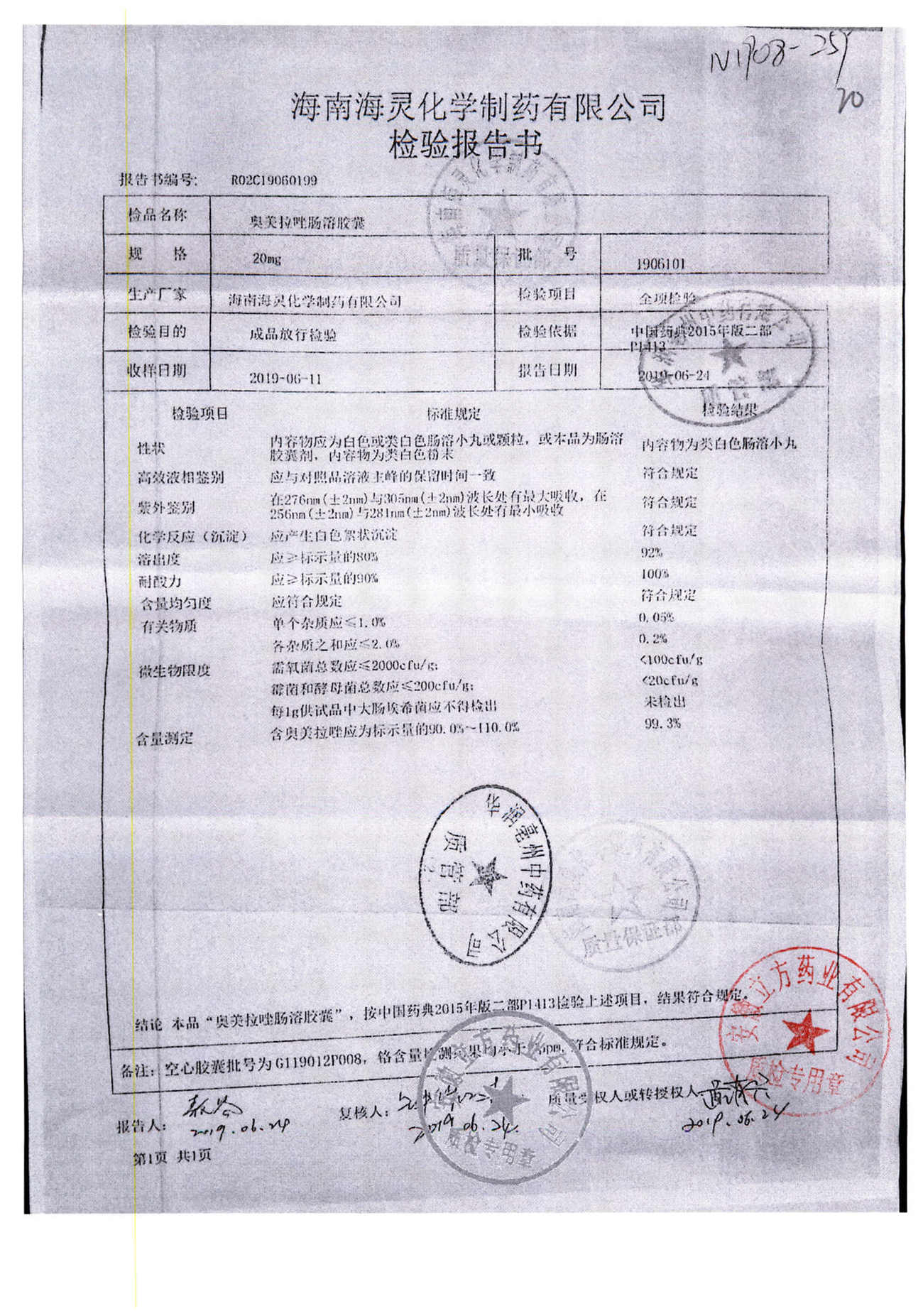 奥美拉唑肠溶胶囊 | 20mg | 1906101 | 查看详情 |