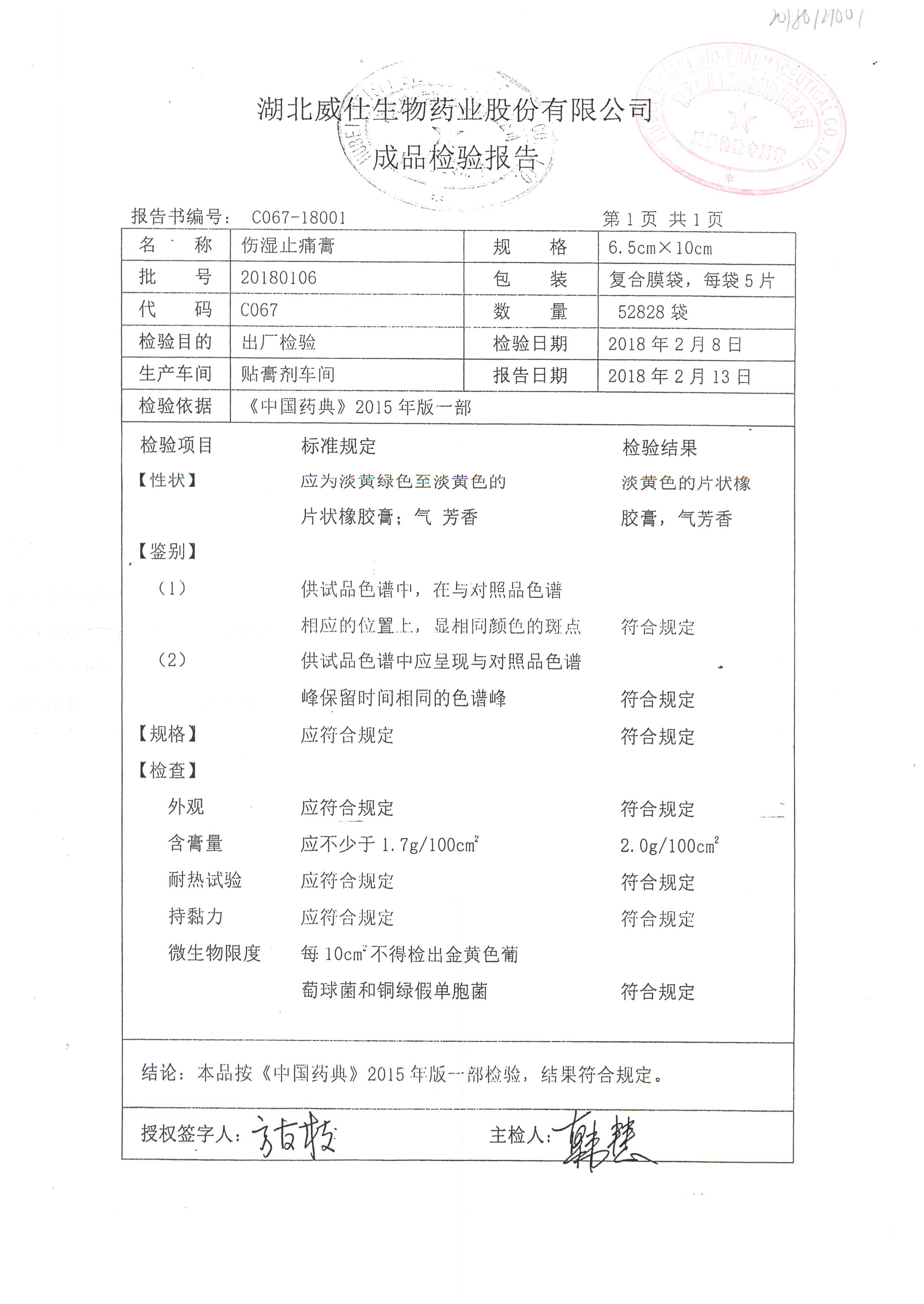 伤湿止痛膏 | 6.5cm*10cm | 20180106 | 查看详情 |