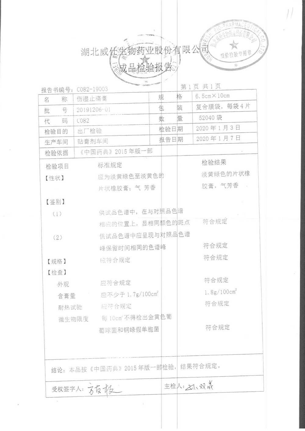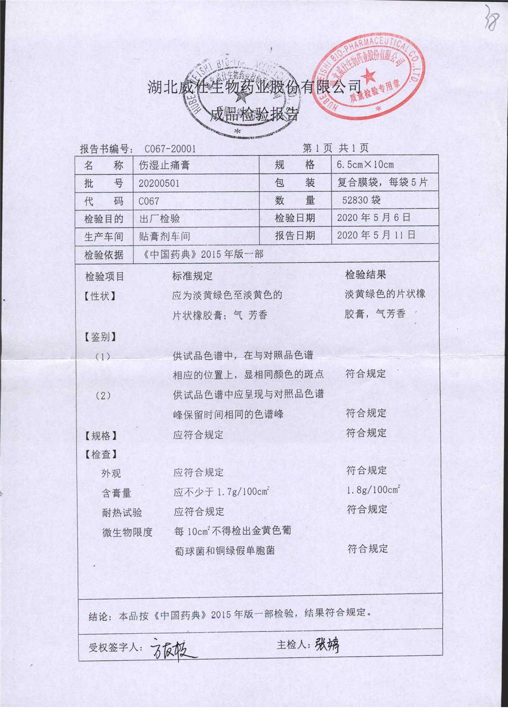 伤湿止痛膏 | 6.5cm*10cm | 20200501 | 查看详情 |