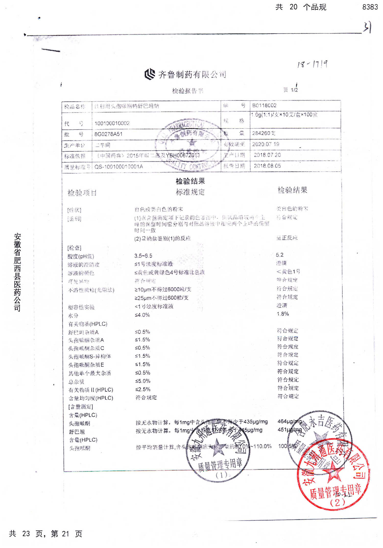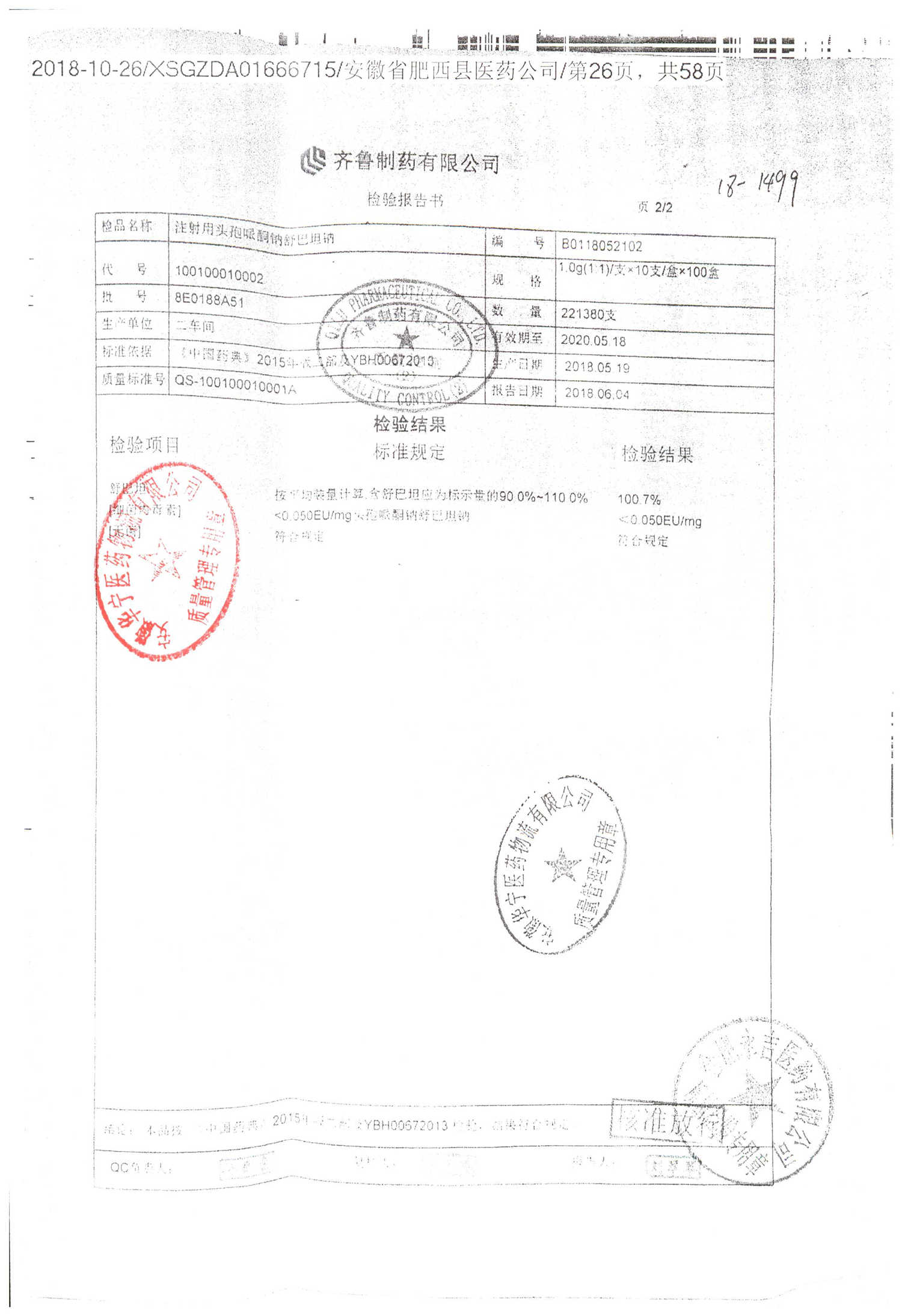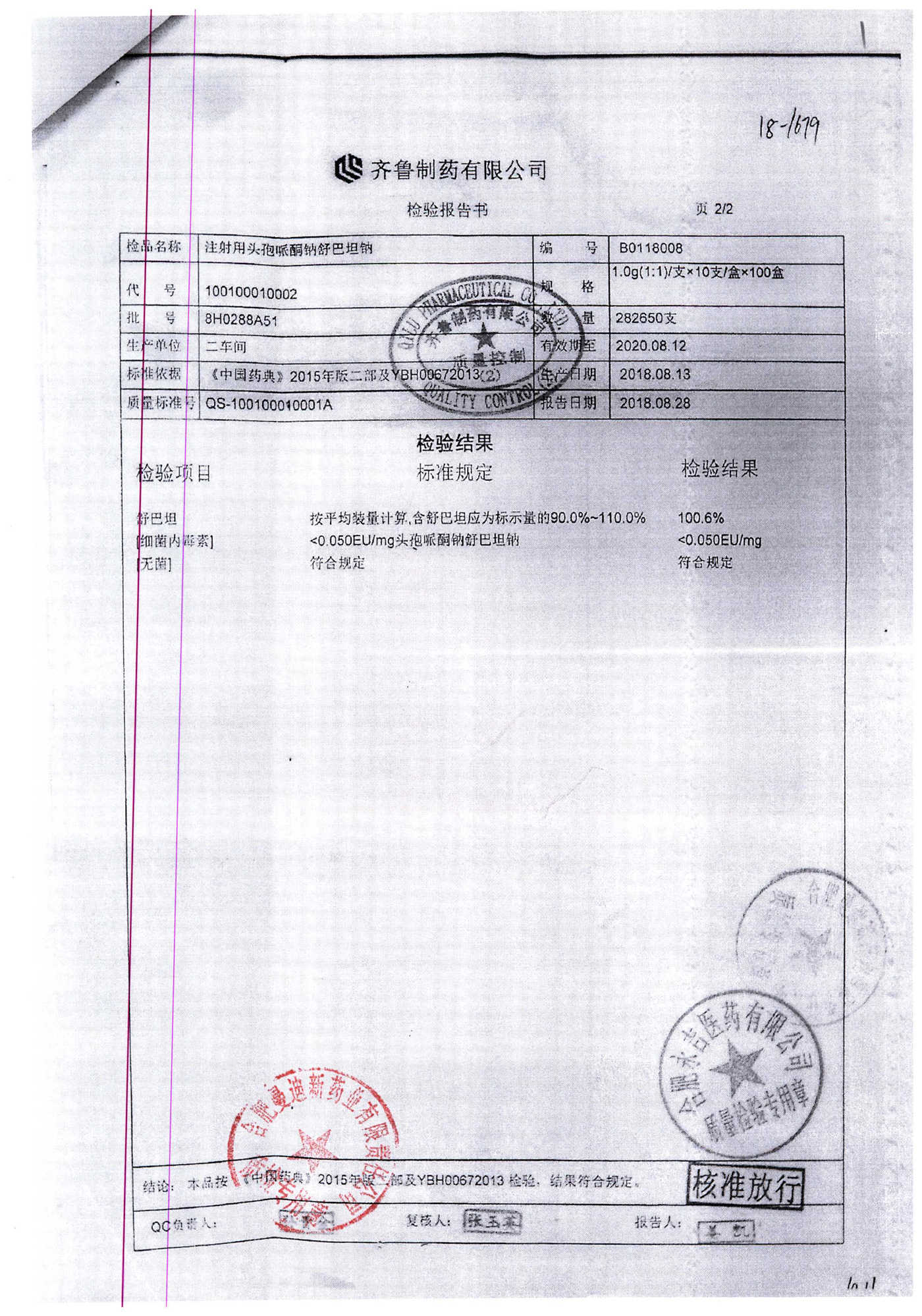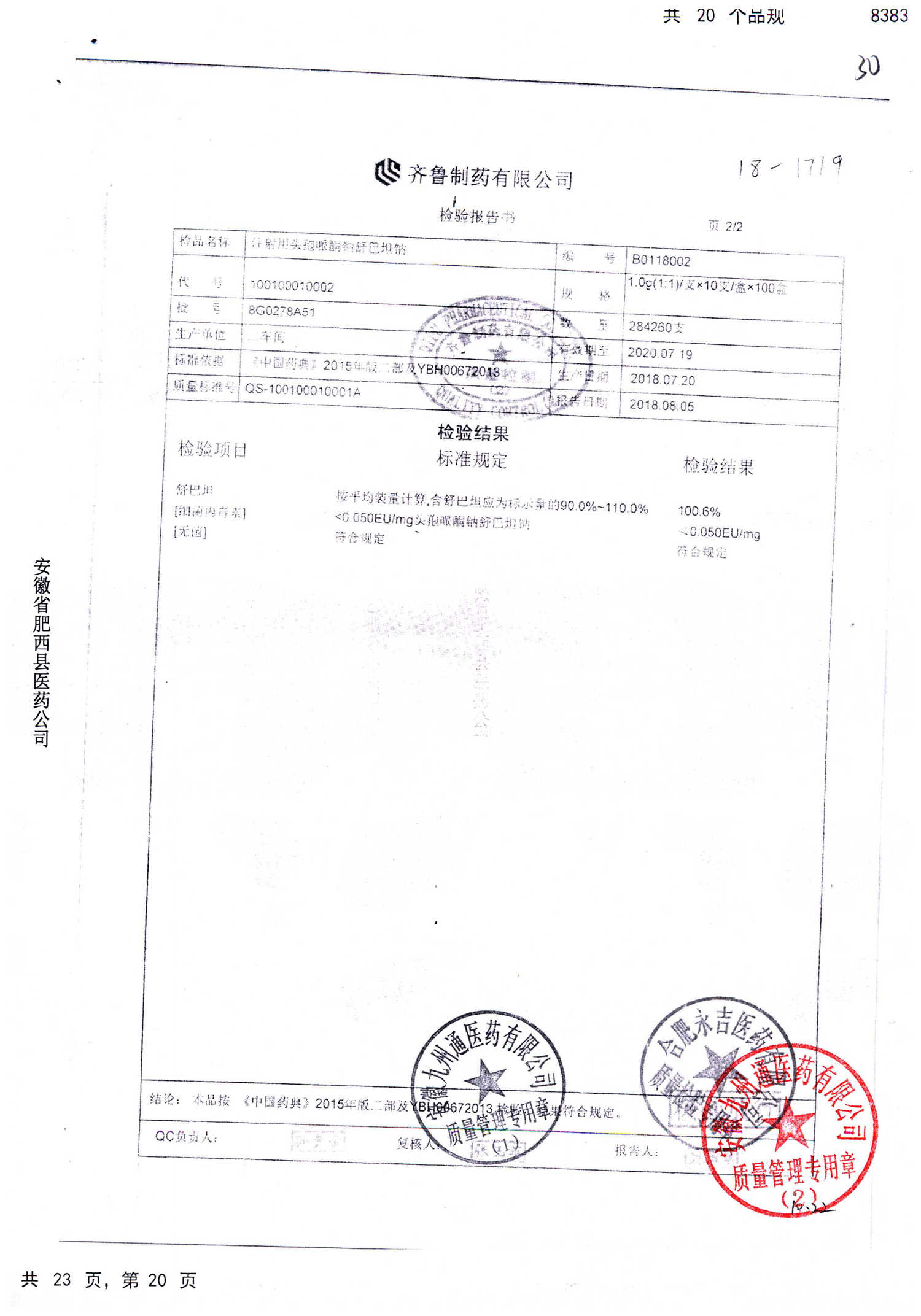 注射用头孢哌酮钠舒巴坦钠 | 1.0g | 8G0278A51(2/2) | 查看详情 |