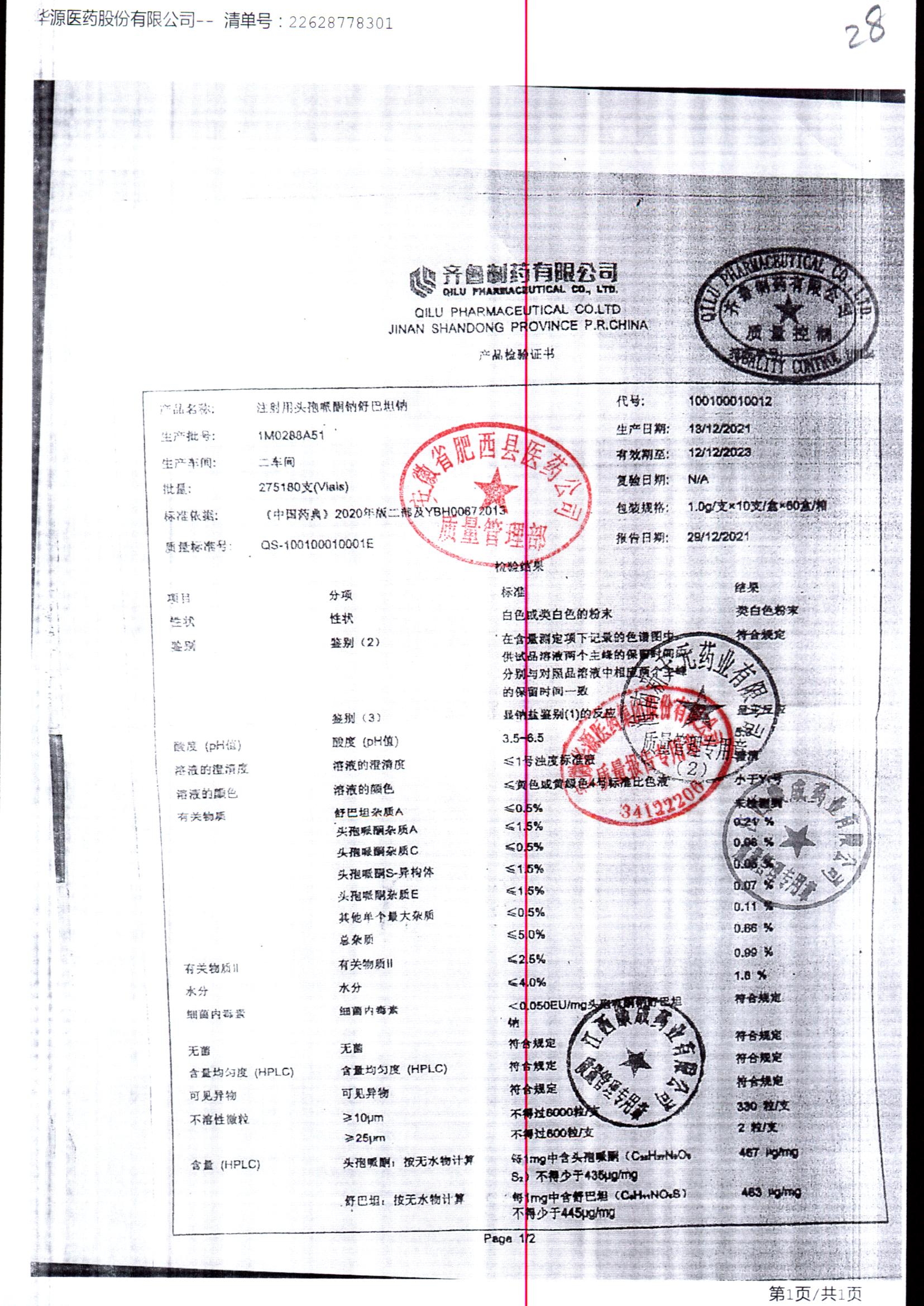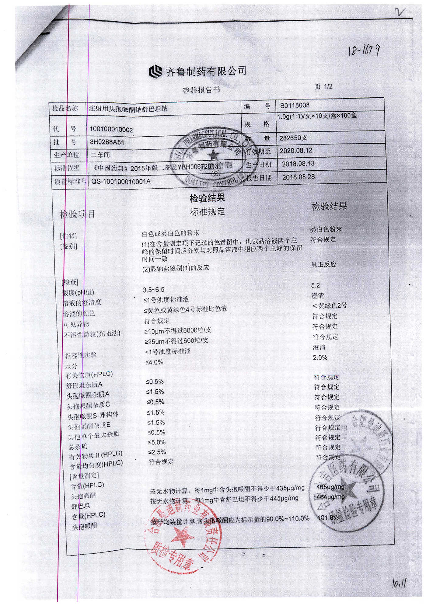 注射用头孢哌酮钠舒巴坦钠 | 1.0g | 8H0288A51(1/2) | 查看详情 |