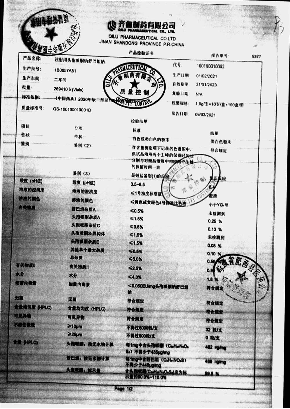 注射用头孢哌酮钠舒巴坦钠 | 1.0g | 1B0057A51(1/2) | 查看详情 |