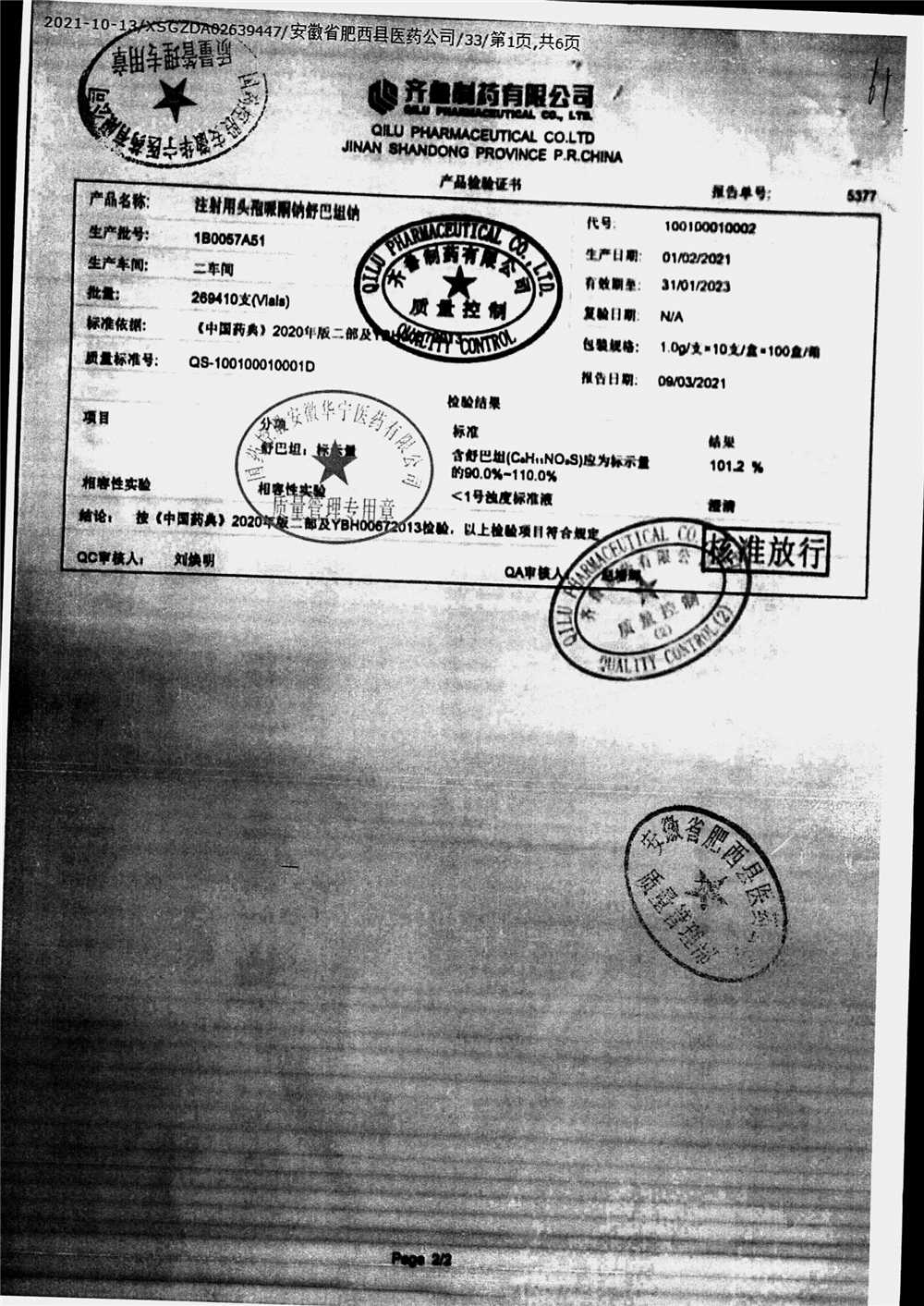 注射用头孢哌酮钠舒巴坦钠 | 1.0g | 8H0288A51(2/2) | 查看详情 |