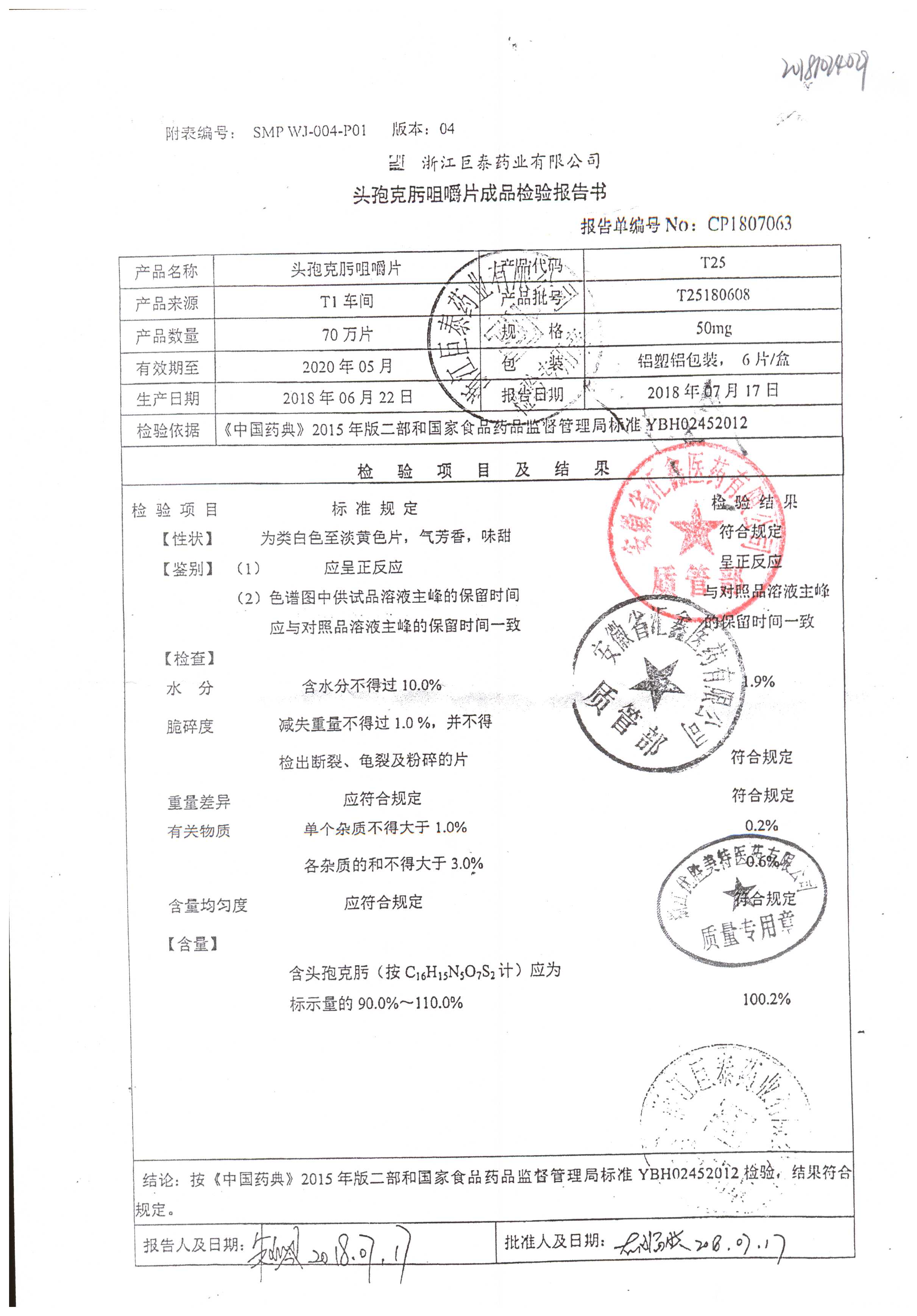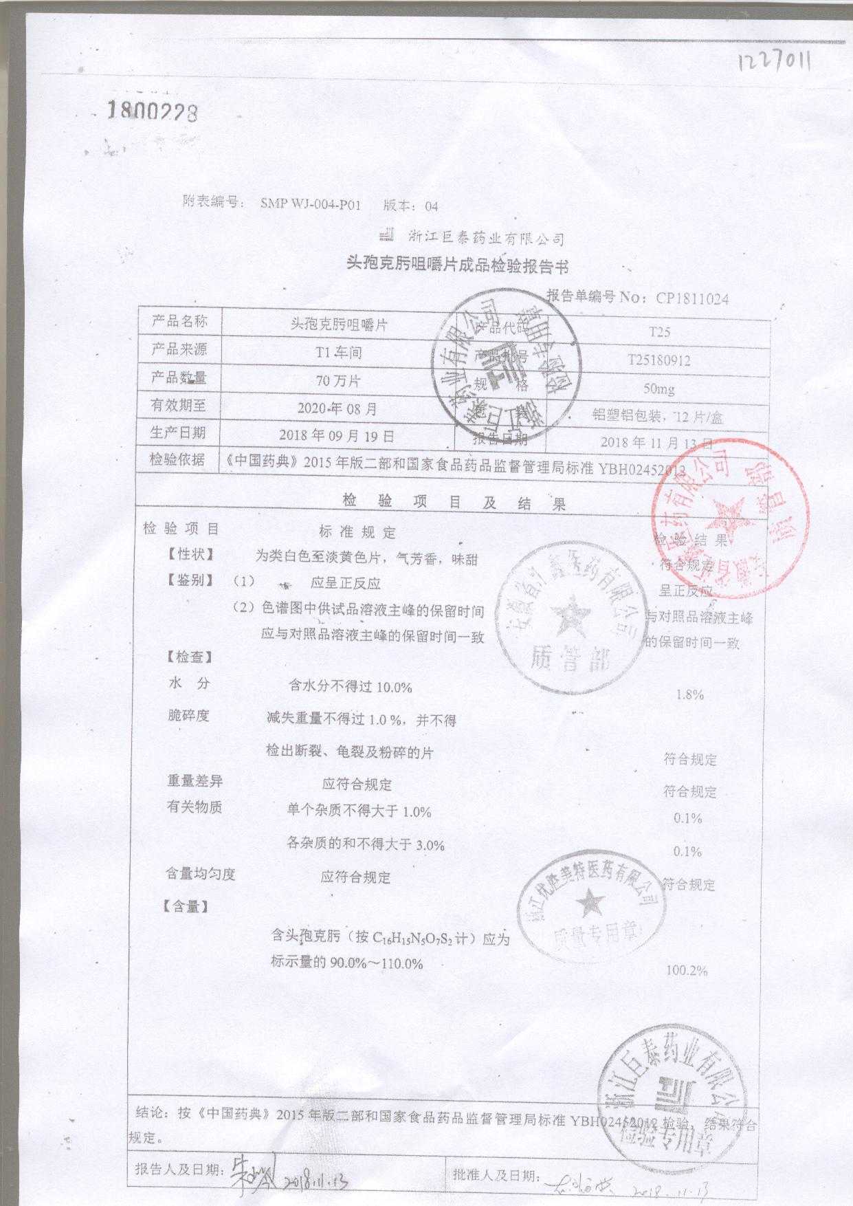 头孢克肟咀嚼片 | 50mg*6s | T25180802 | 查看详情 |