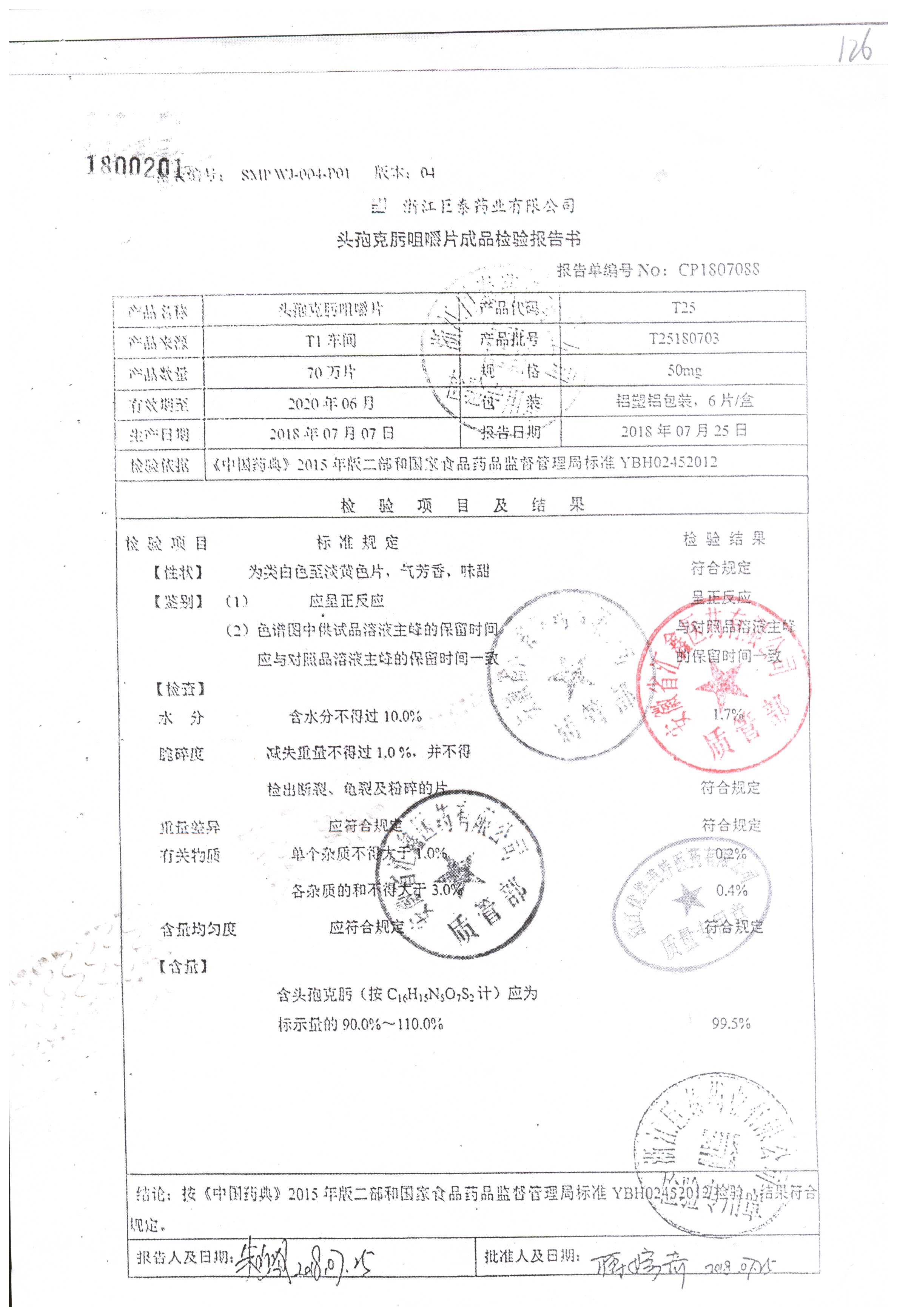 名称 | 规格 | 批号 | 药检报告 |