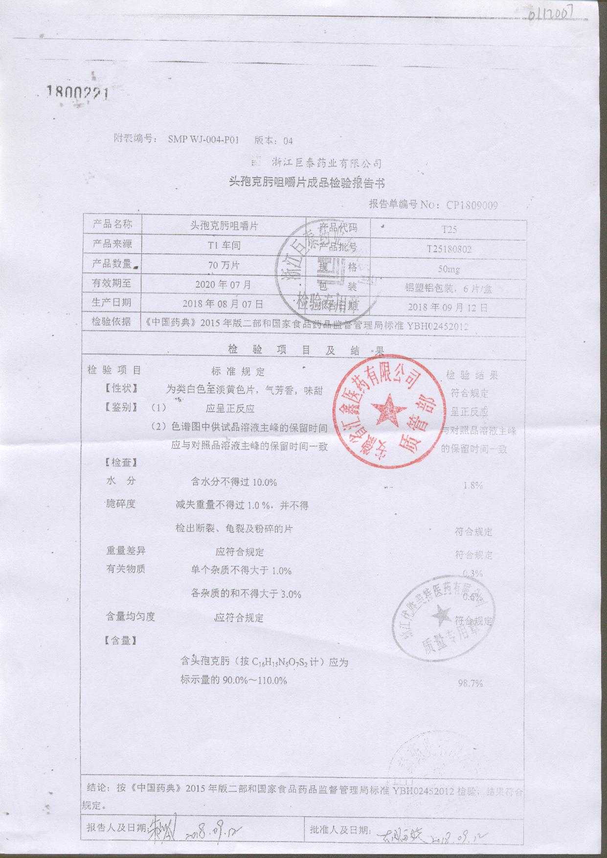 头孢克肟咀嚼片 | 50mg*6s | T25180608 | 查看详情 |