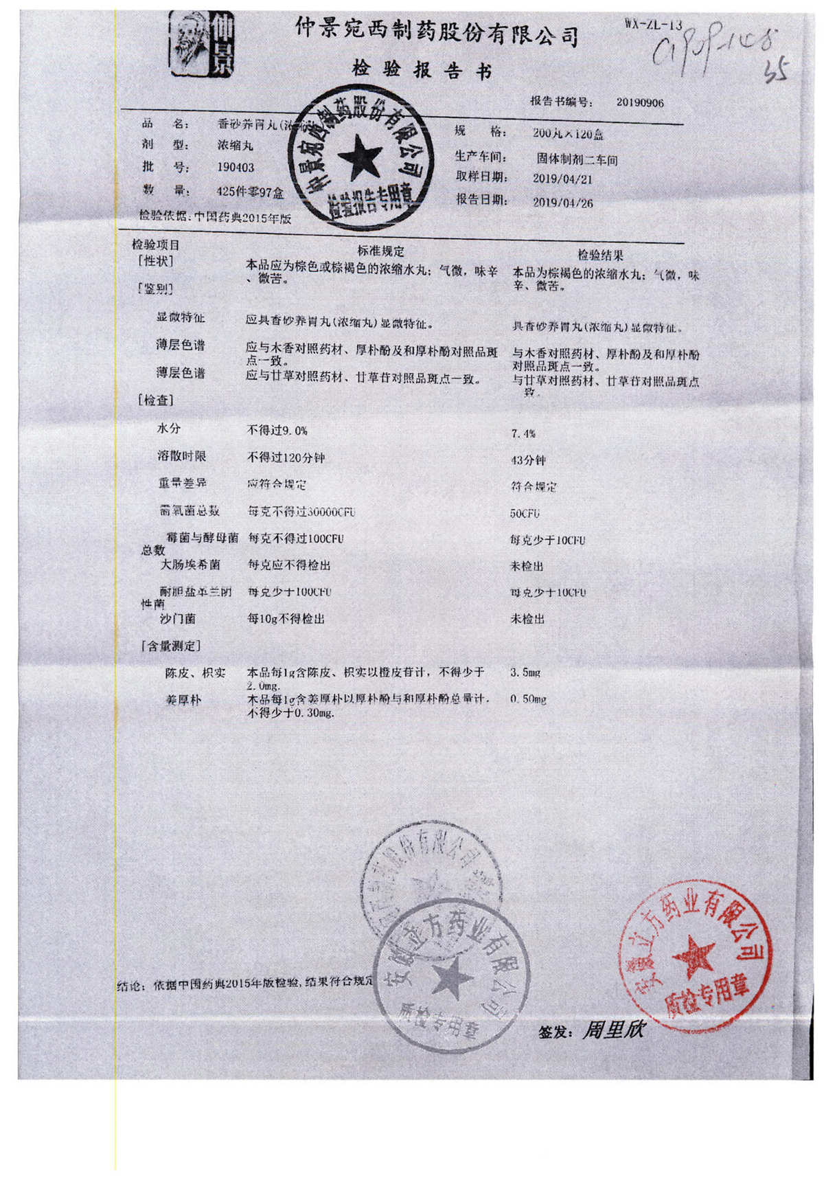 名称 | 规格 | 批号 | 药检报告 |