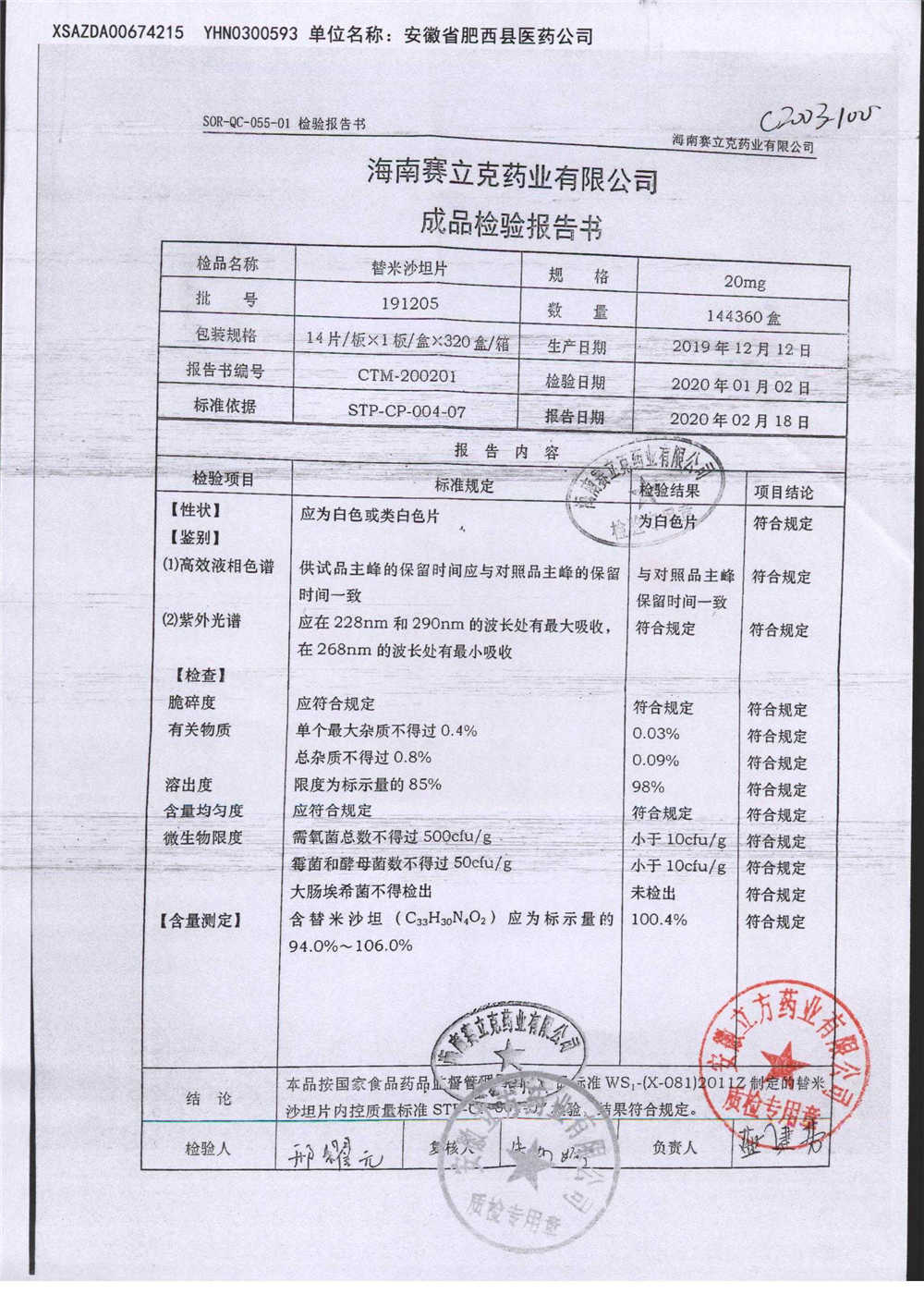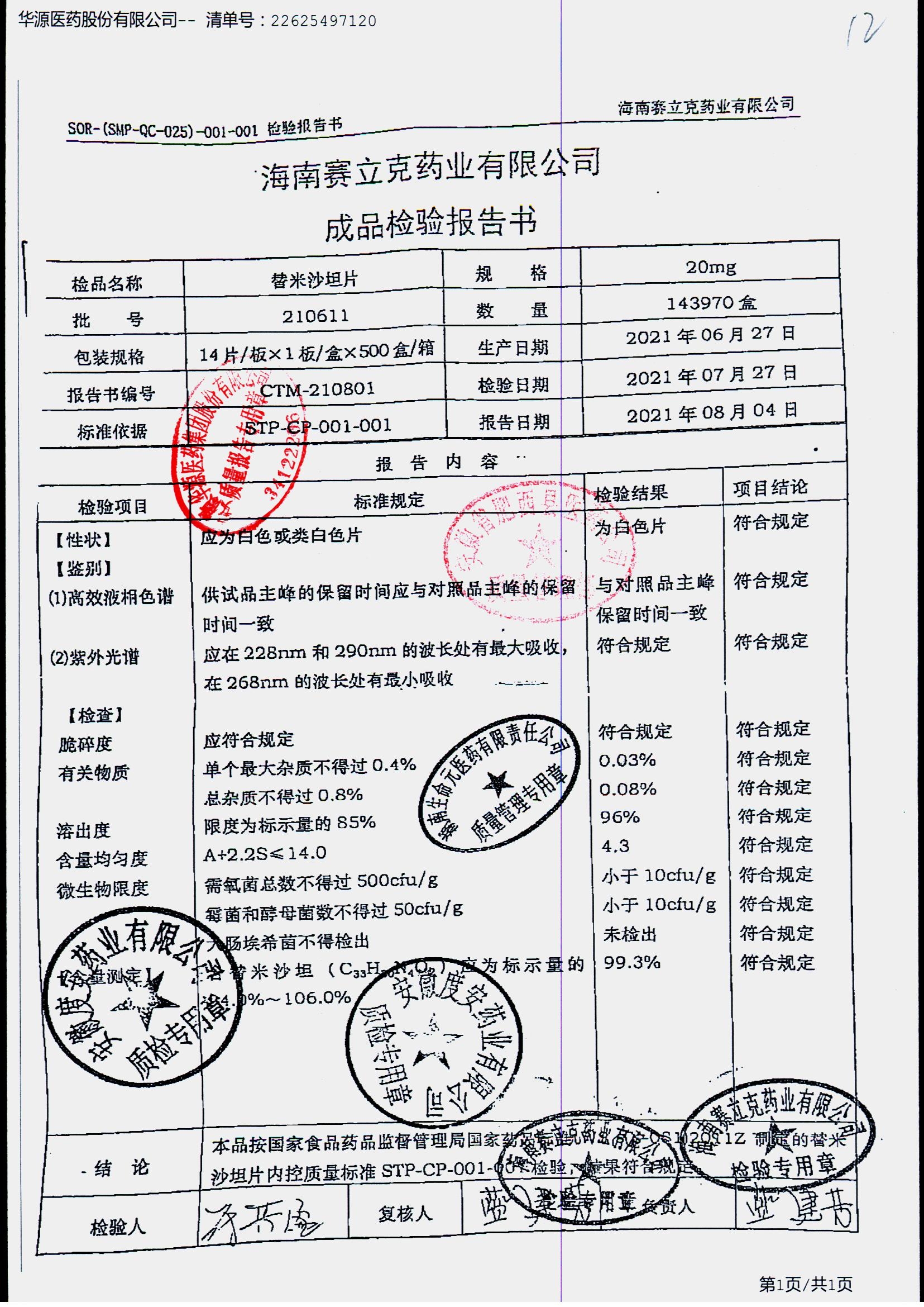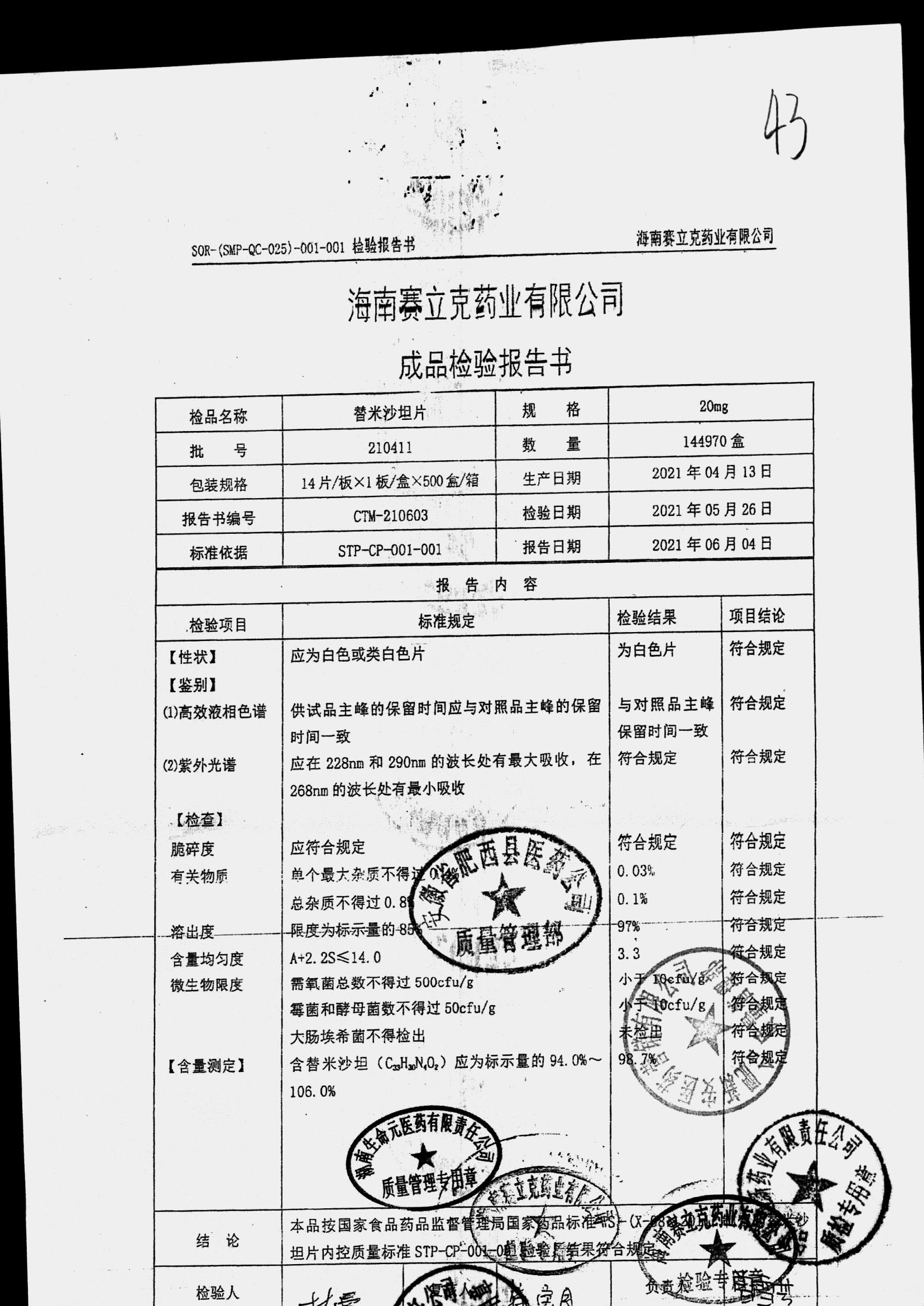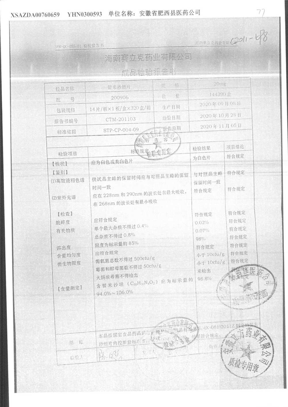替米沙坦片 | 20mg*14片 | 210611 | 查看详情 |