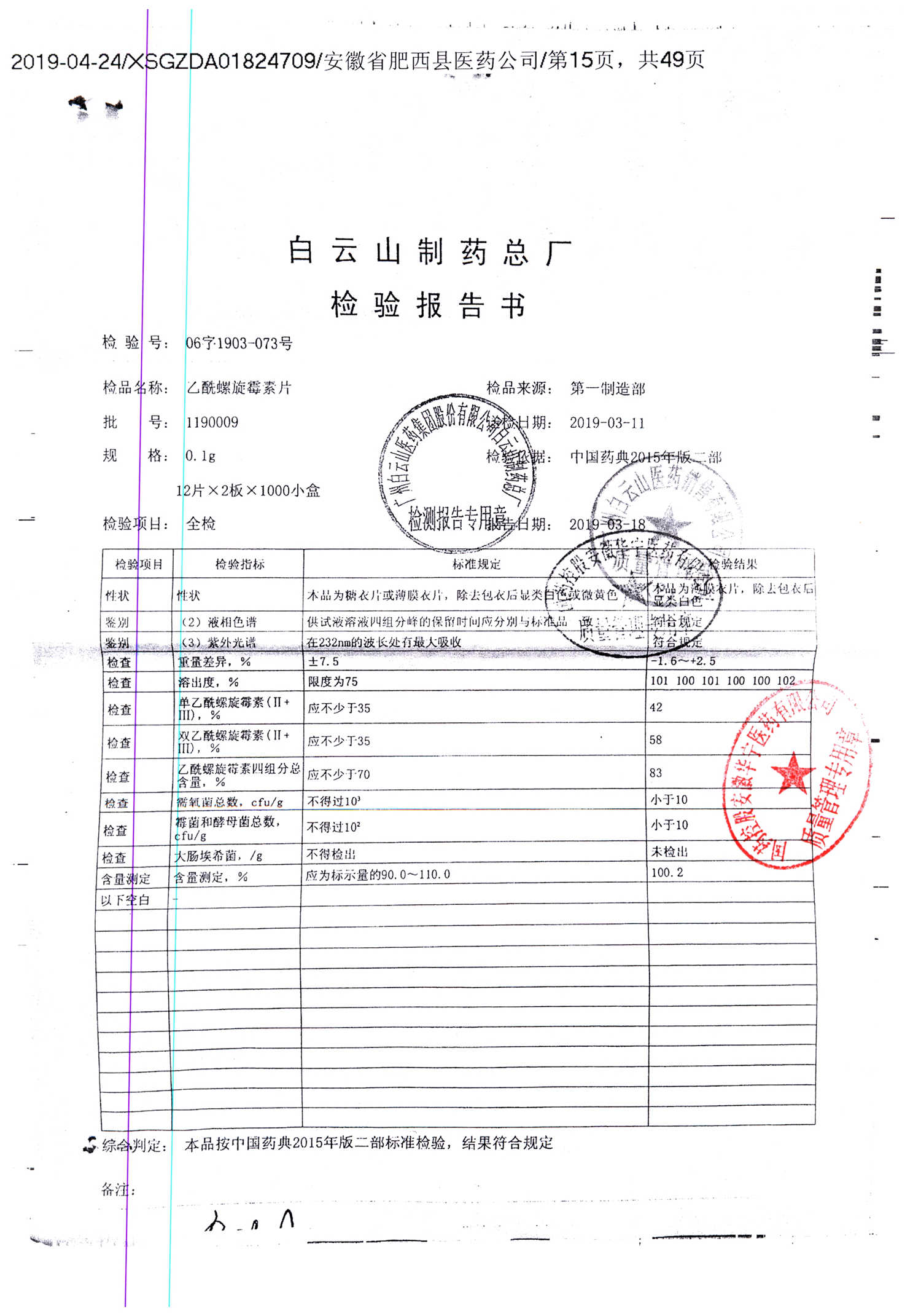 乙酰螺旋霉素片 | 0.1g*24片 | 1190009 | 查看详情 |