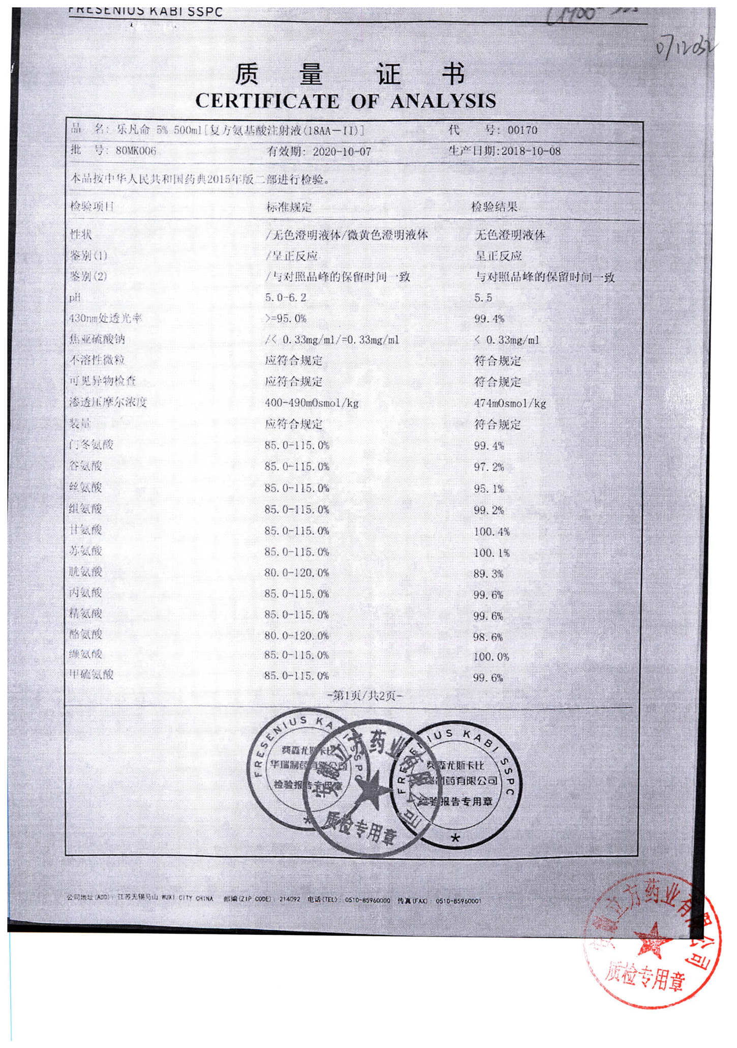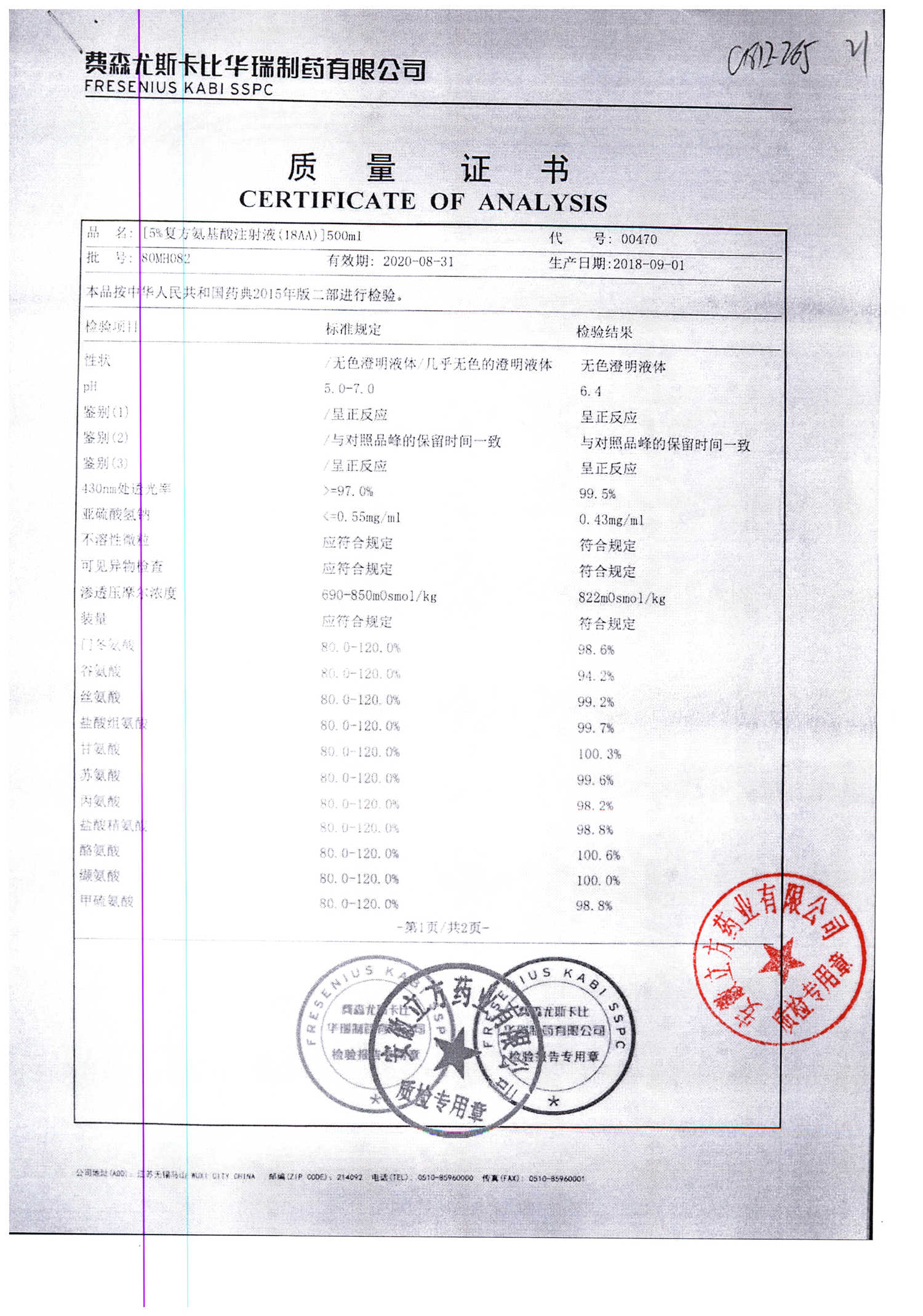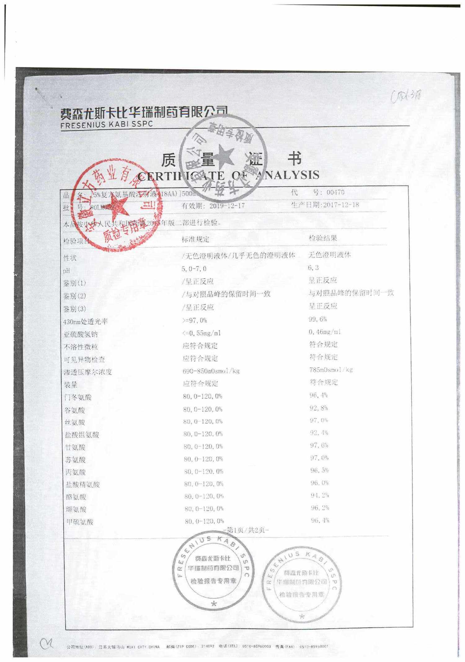 5%复方氨基酸注射液(18AA) | 500ml | 80MK003(2/2) | 查看详情 |