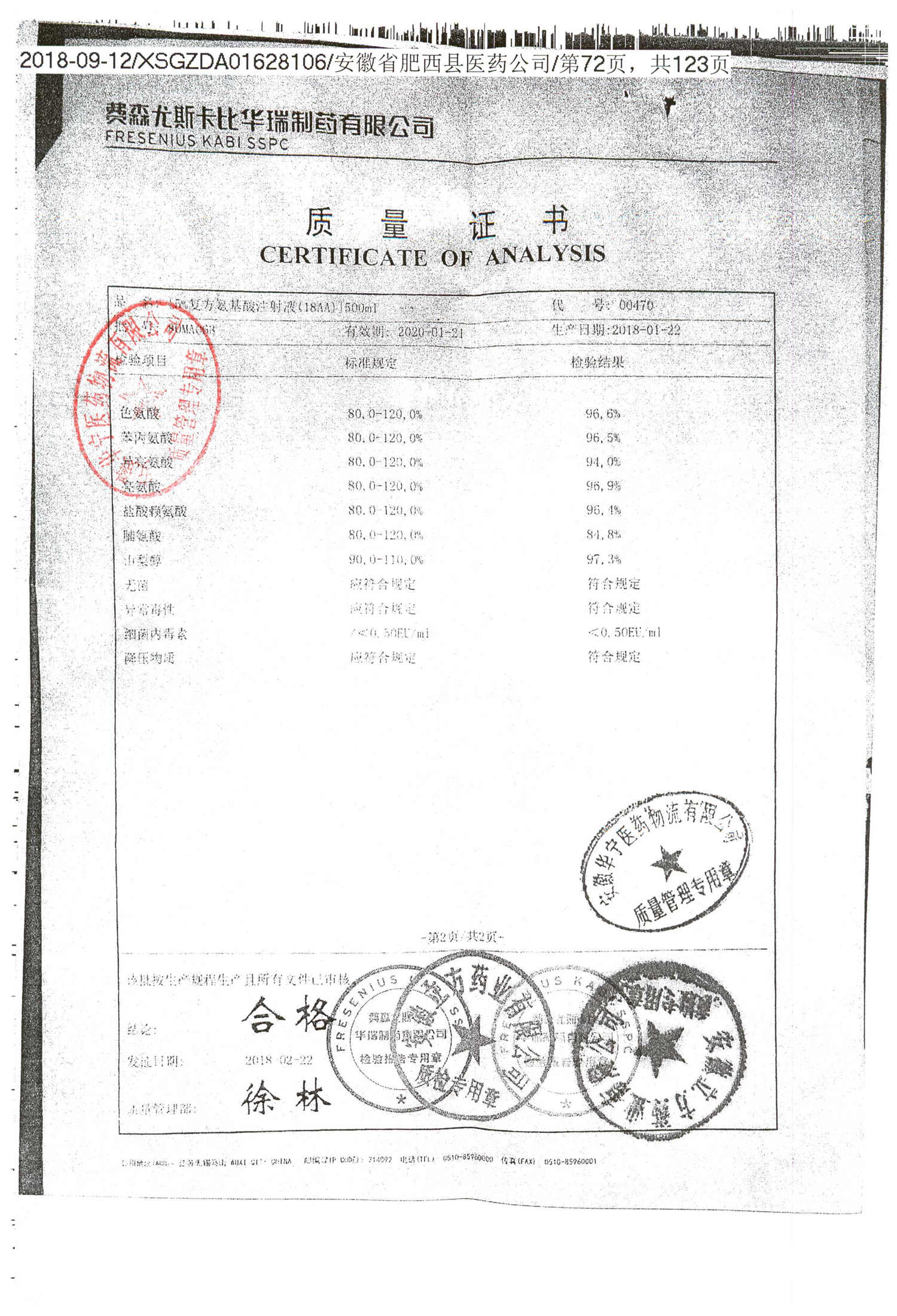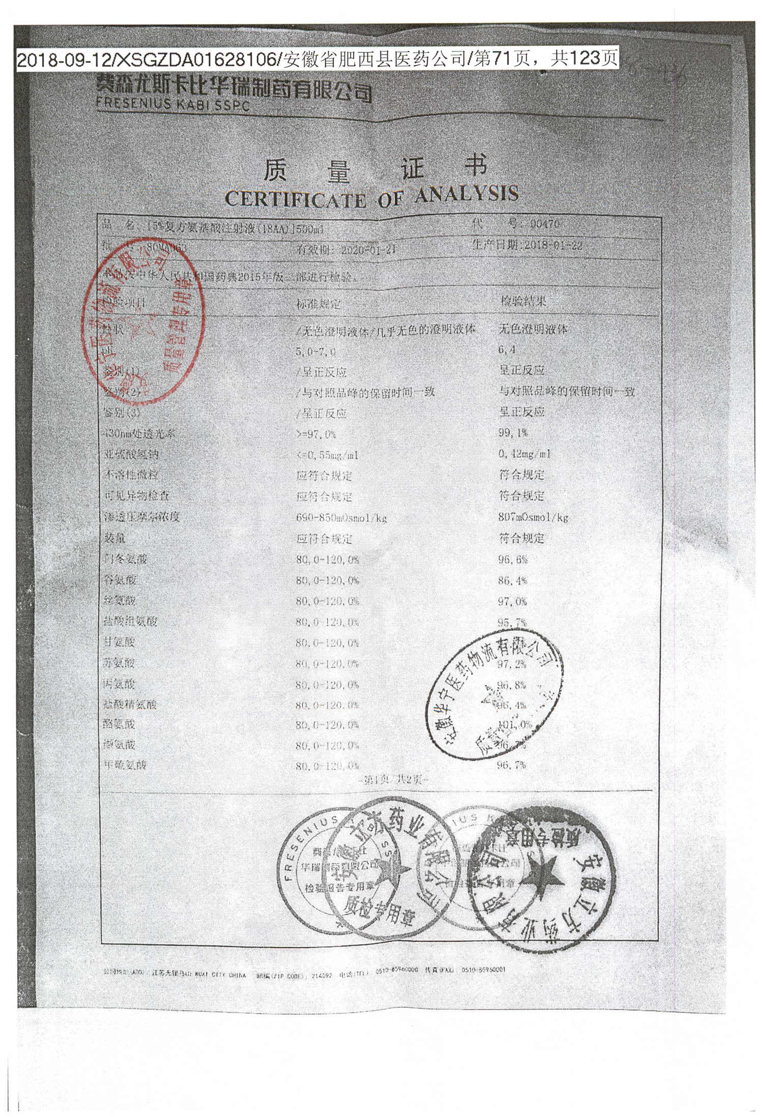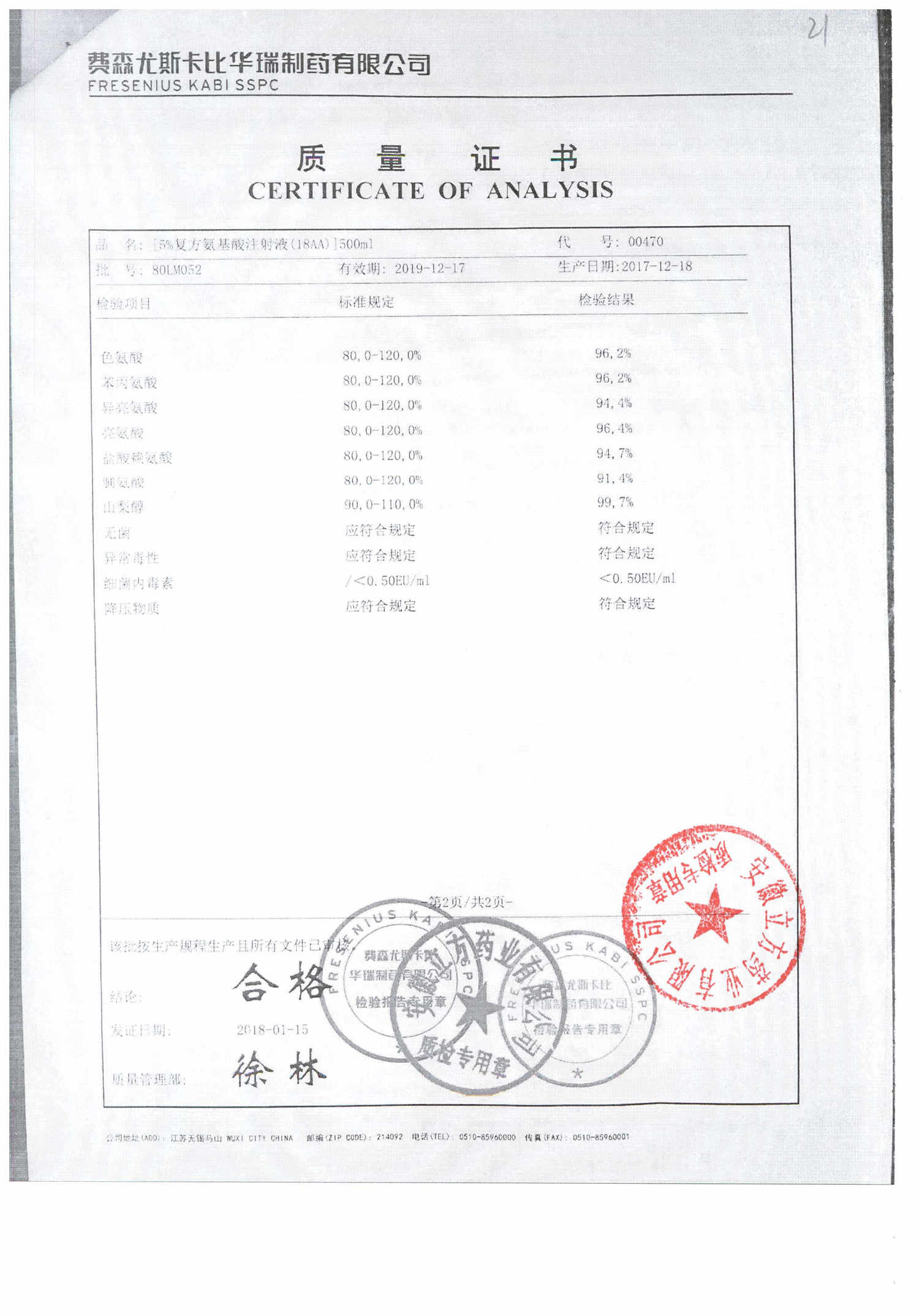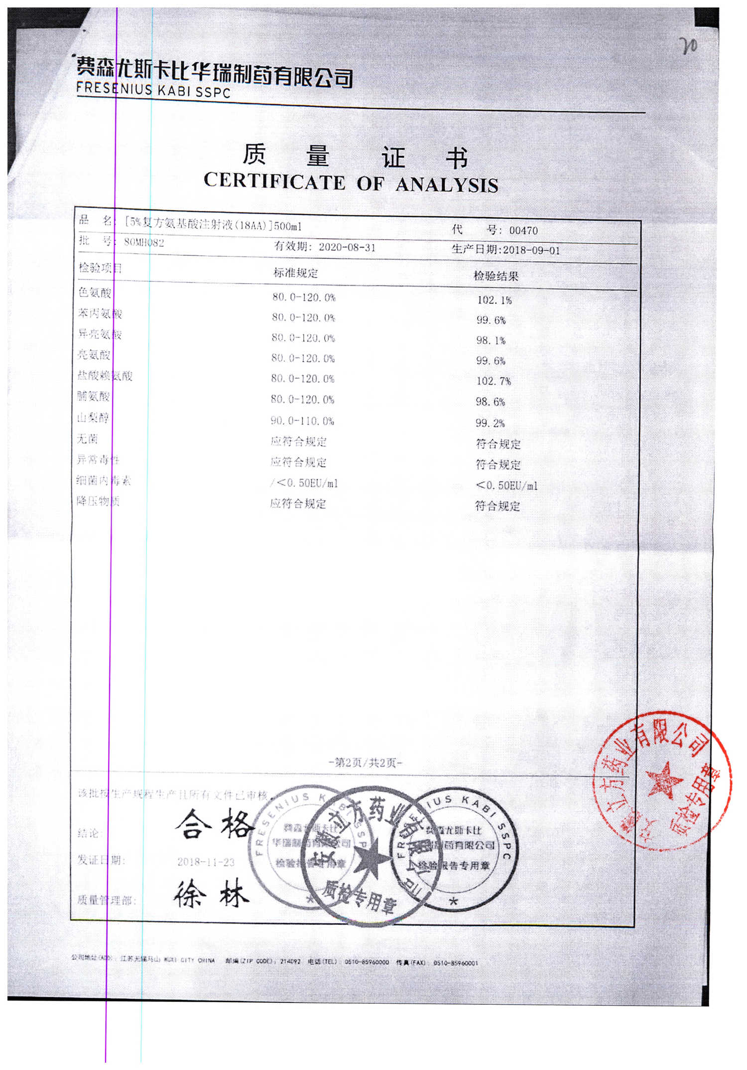 5%复方氨基酸注射液(18AA) | 500ml | 80LM052(2/2) | 查看详情 |