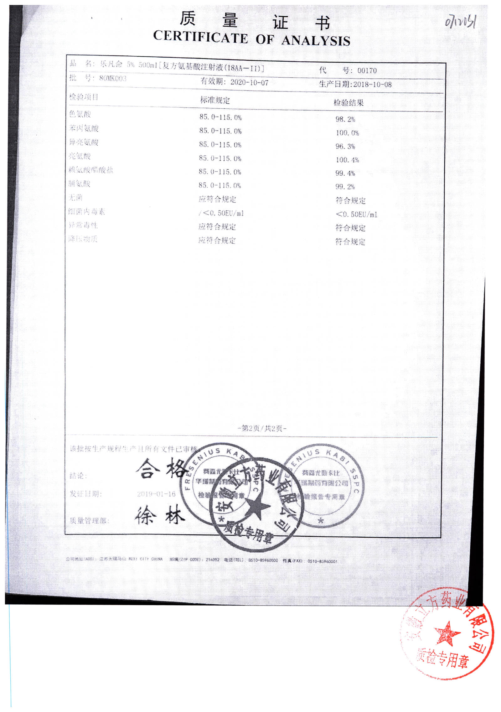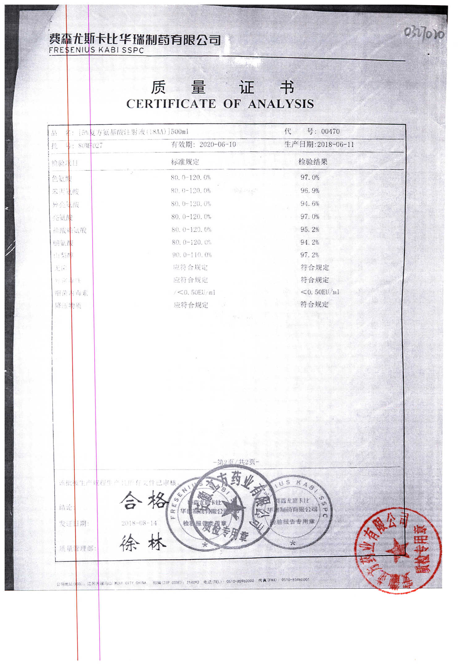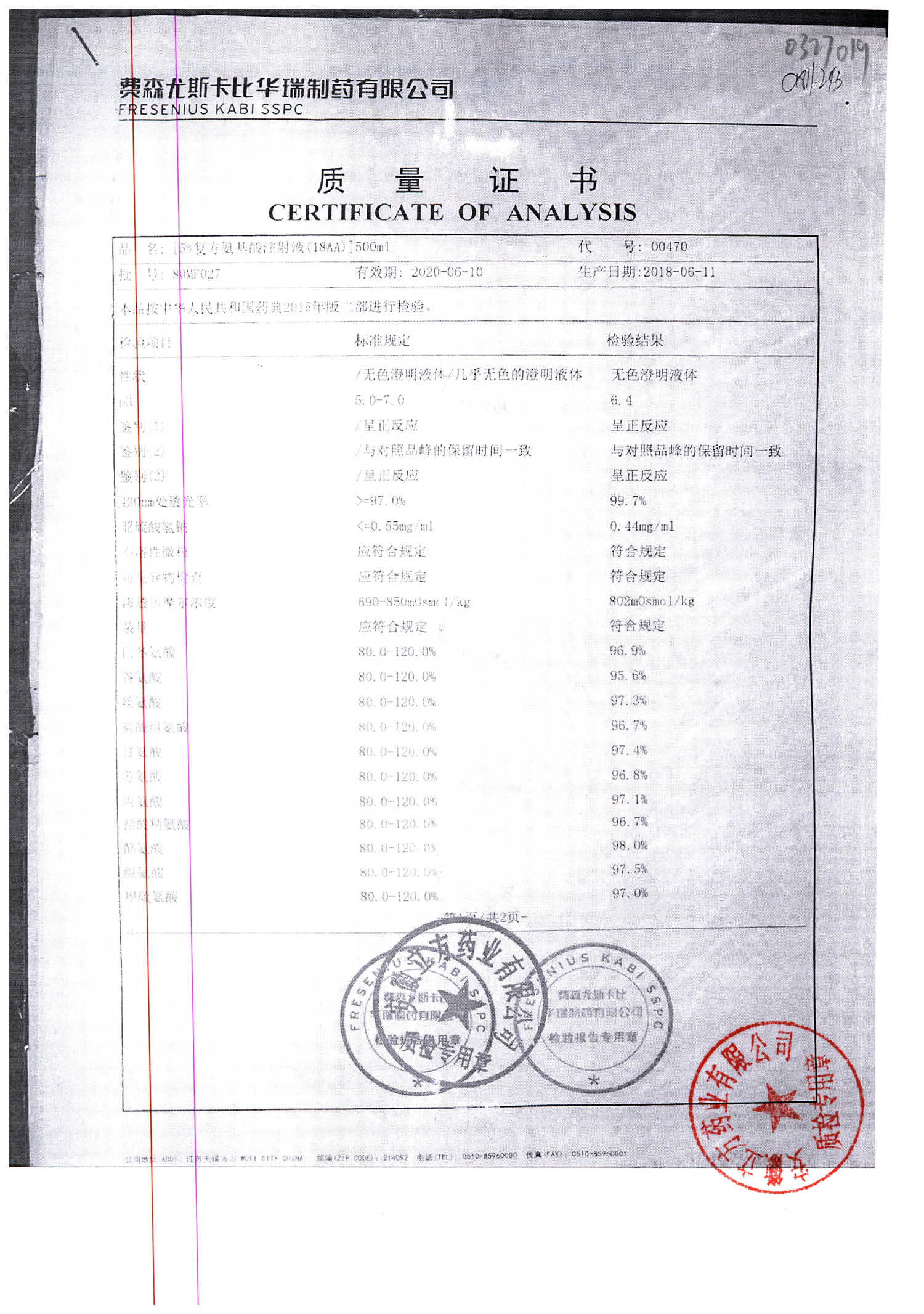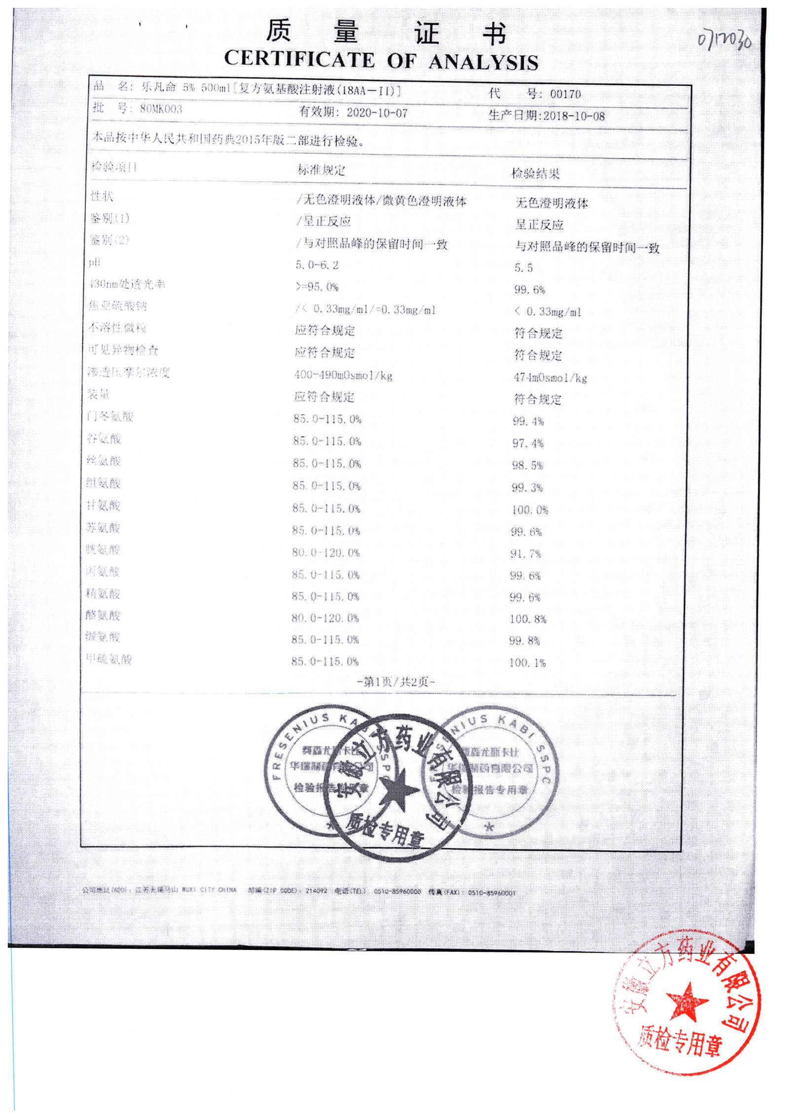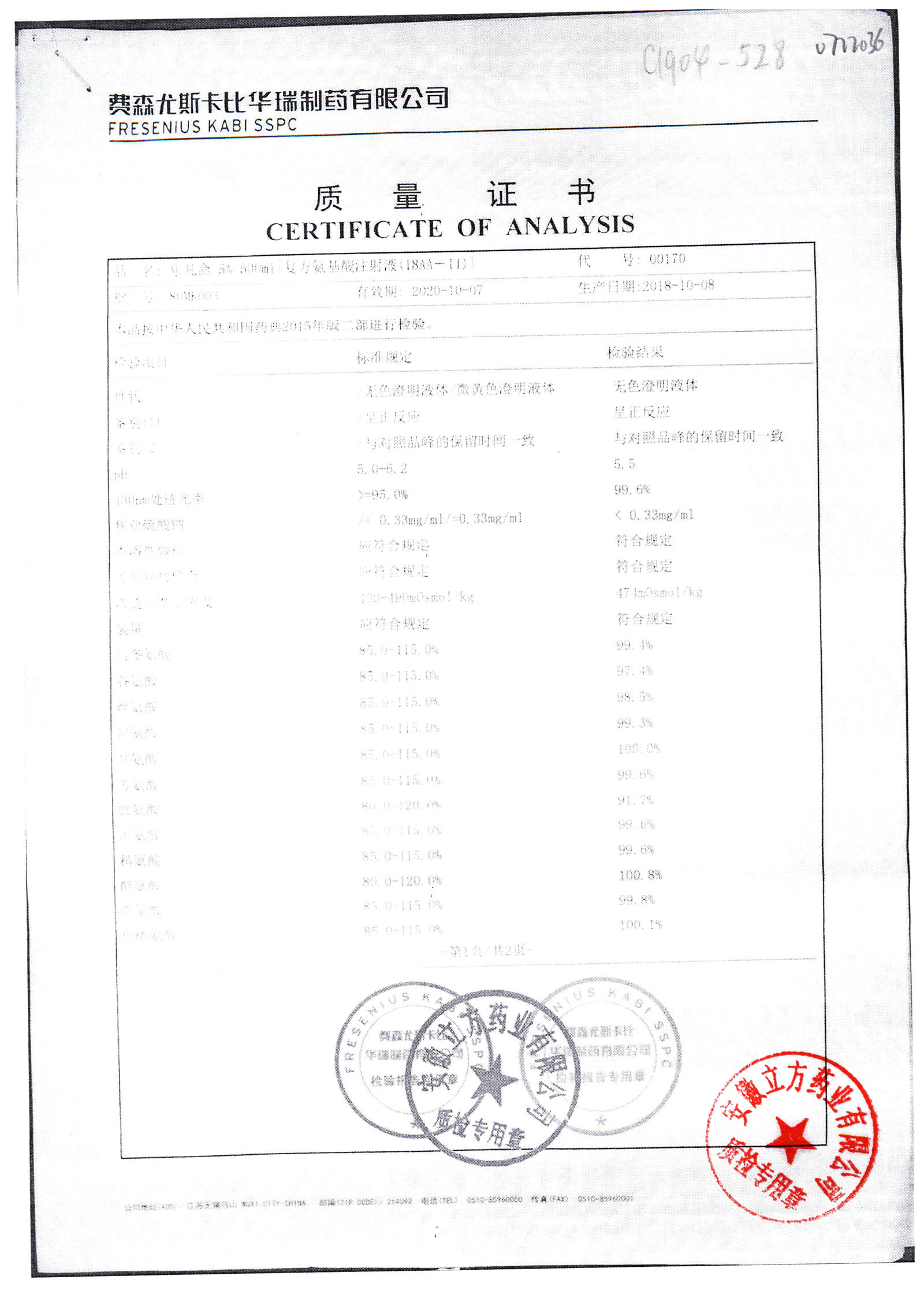 5%复方氨基酸注射液(18AA) | 500ml | 80MF027(2/2) | 查看详情 |