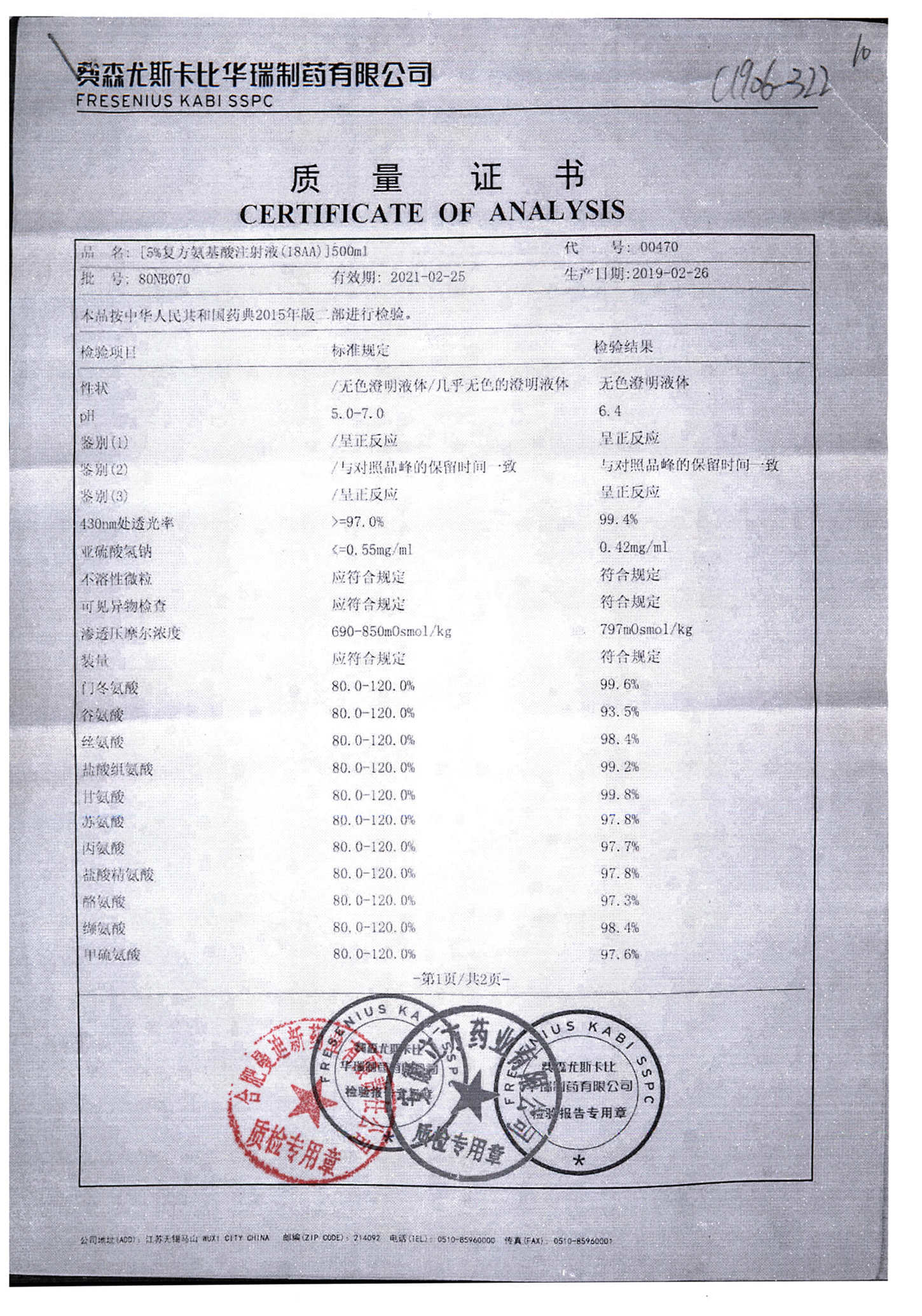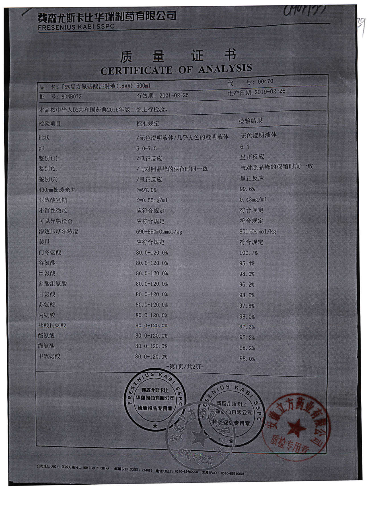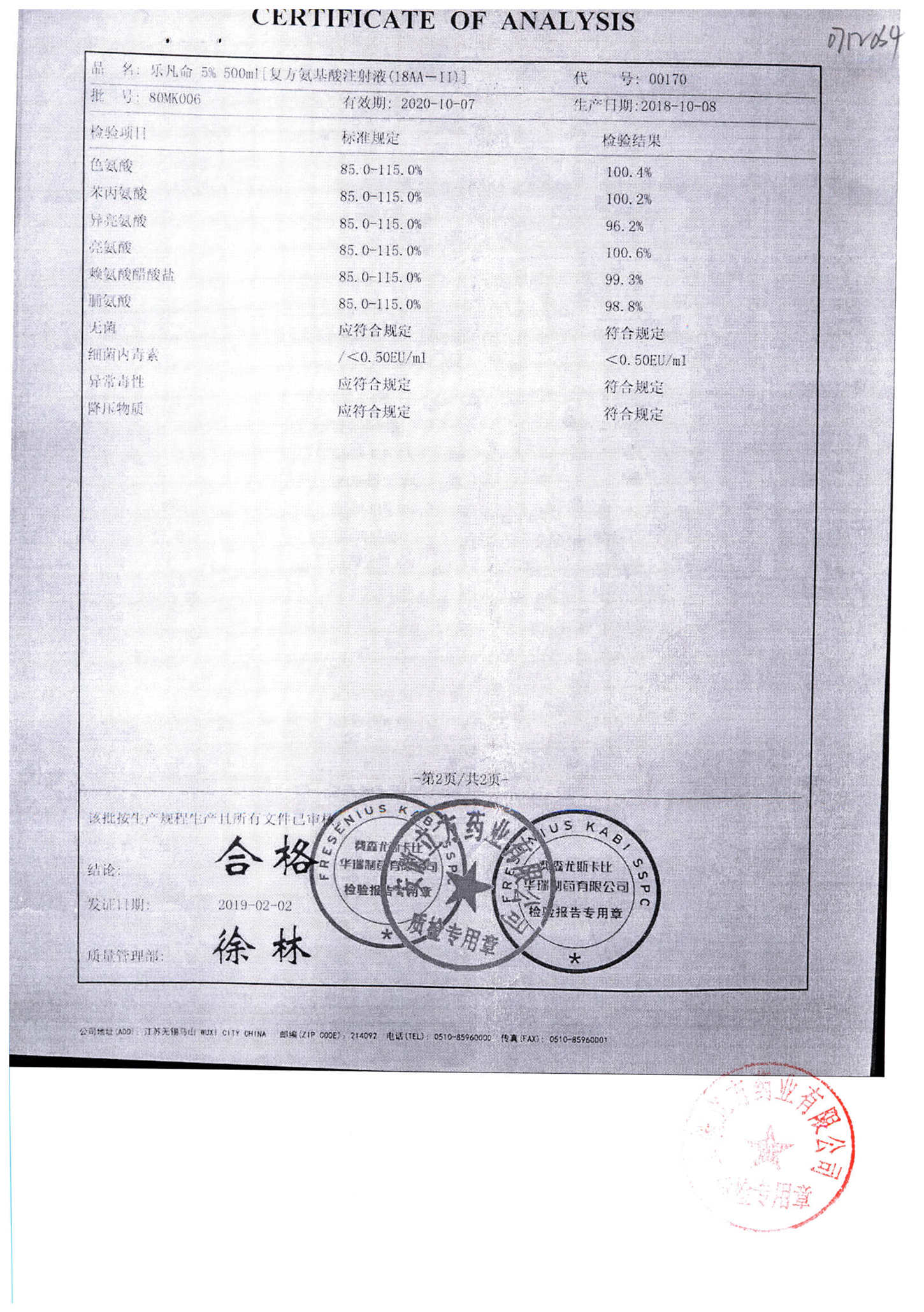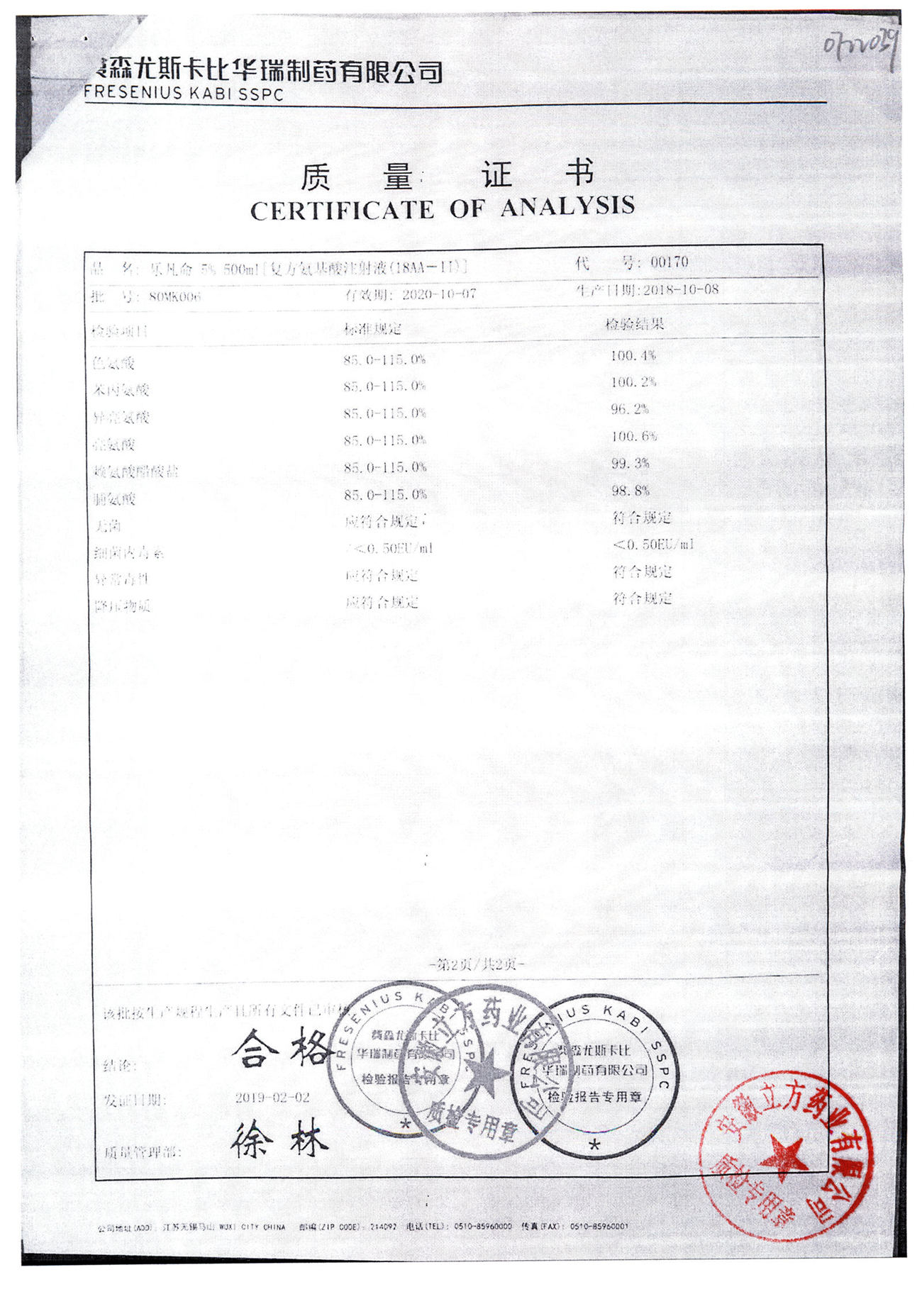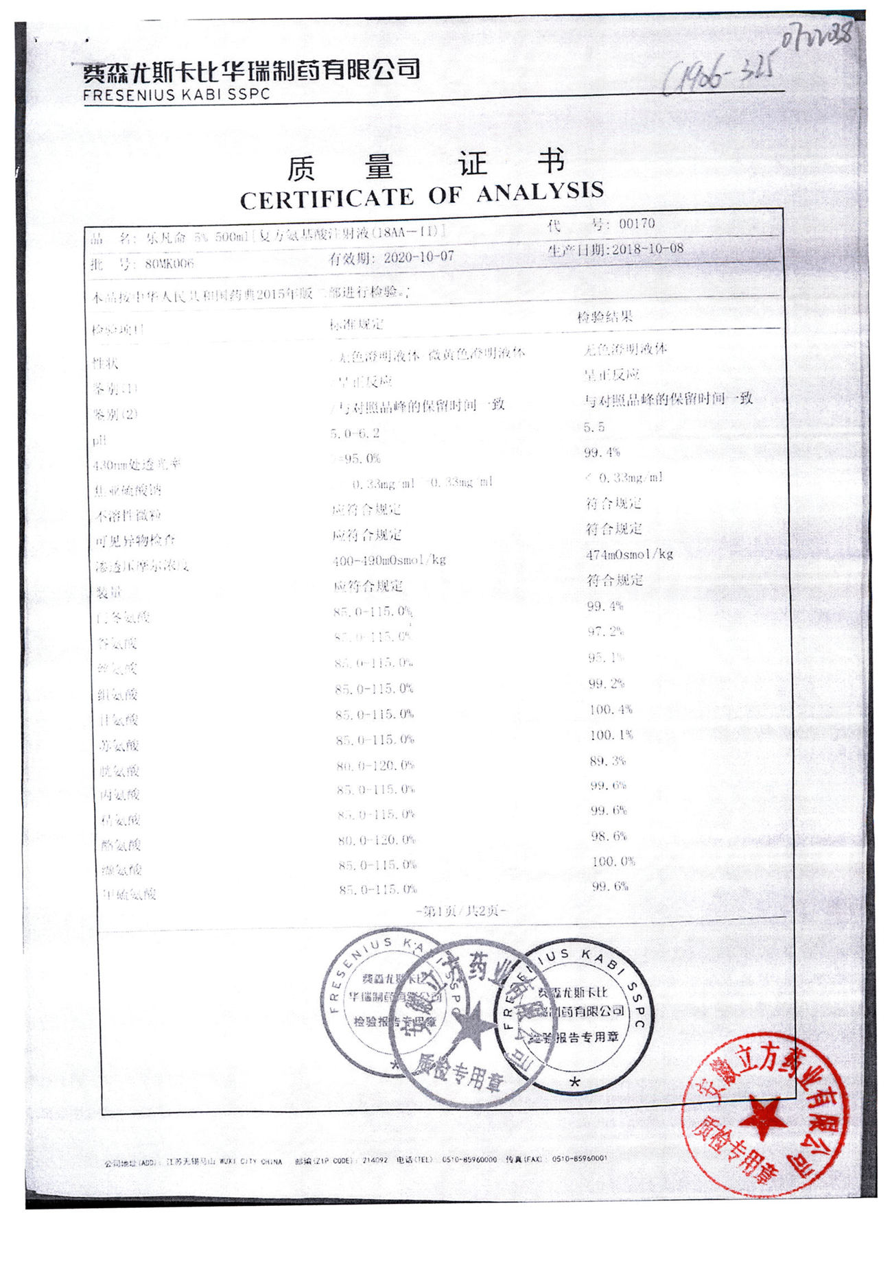 5%复方氨基酸注射液(18AA) | 500ml | 80MF027(2/2) | 查看详情 |