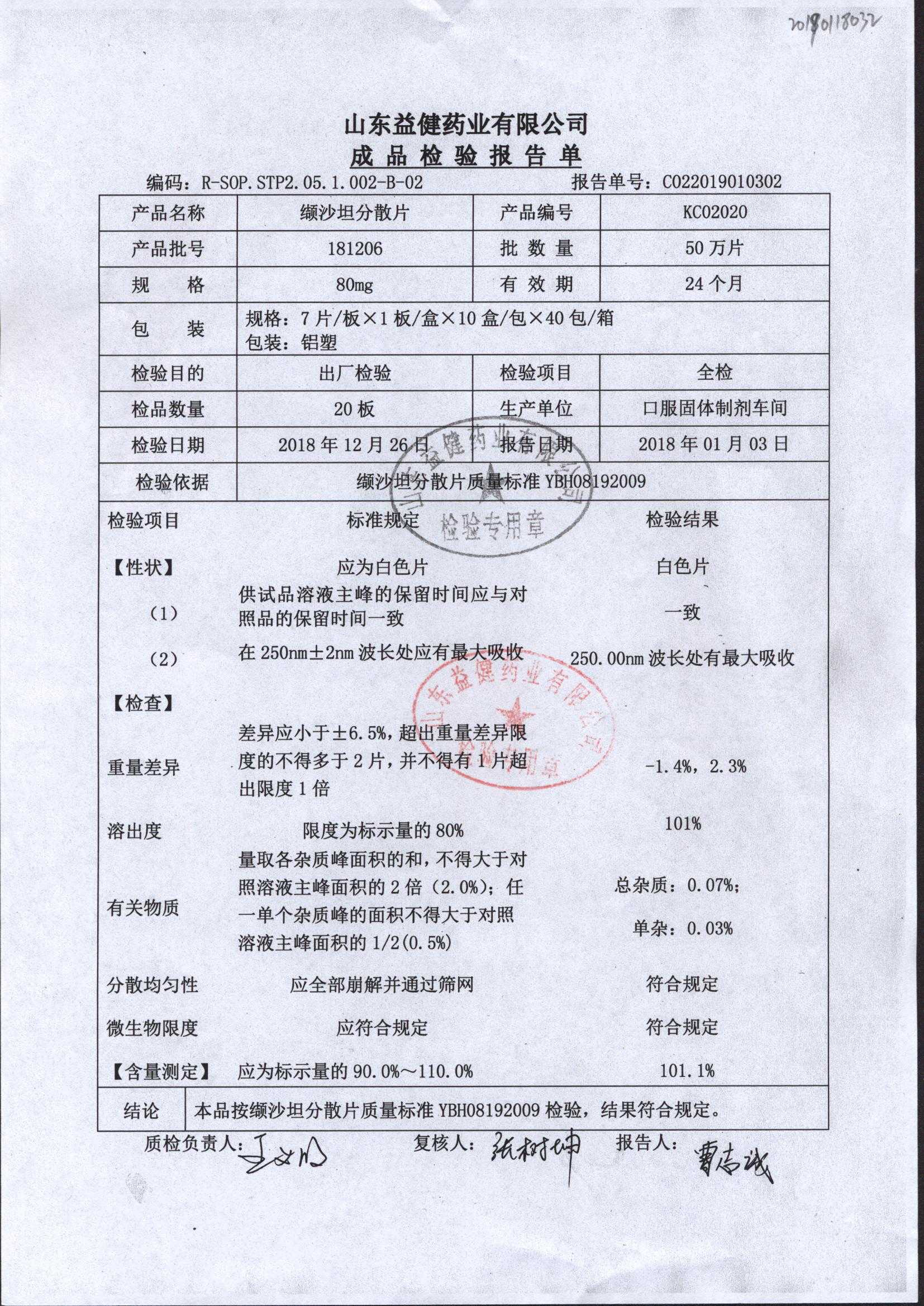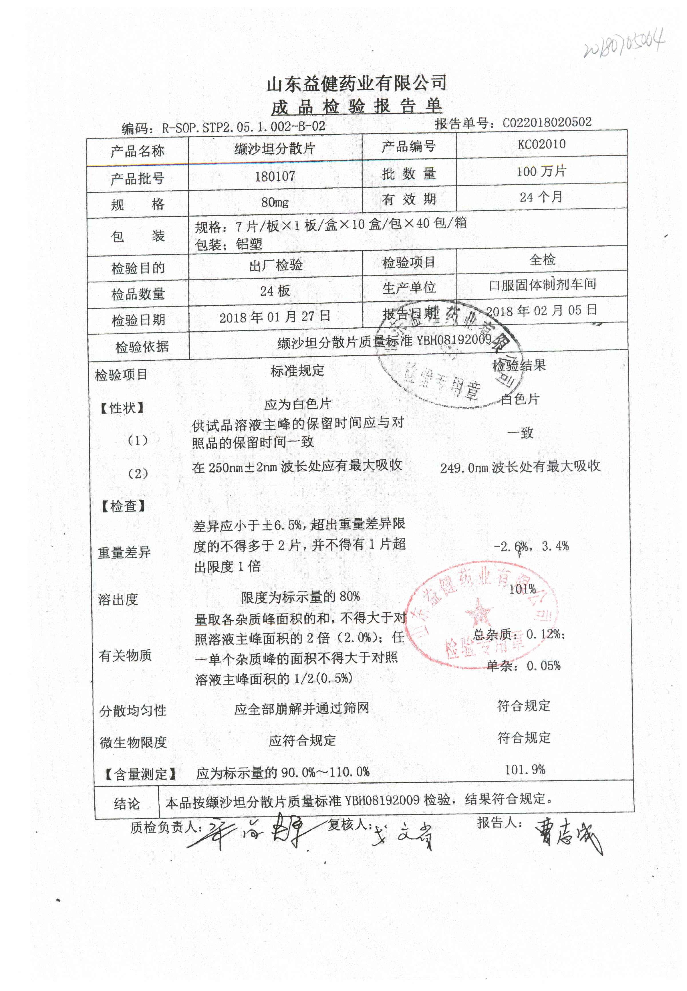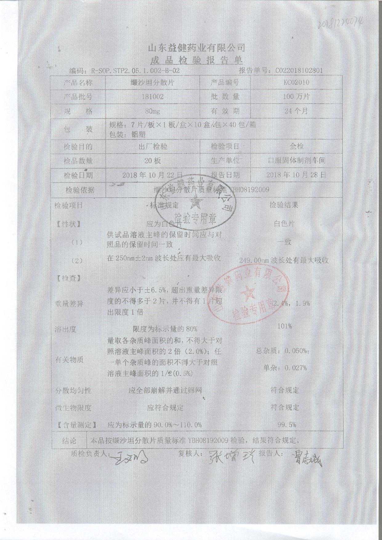 缬沙坦分散片 | 80mg*7s | 181002 | 查看详情 |