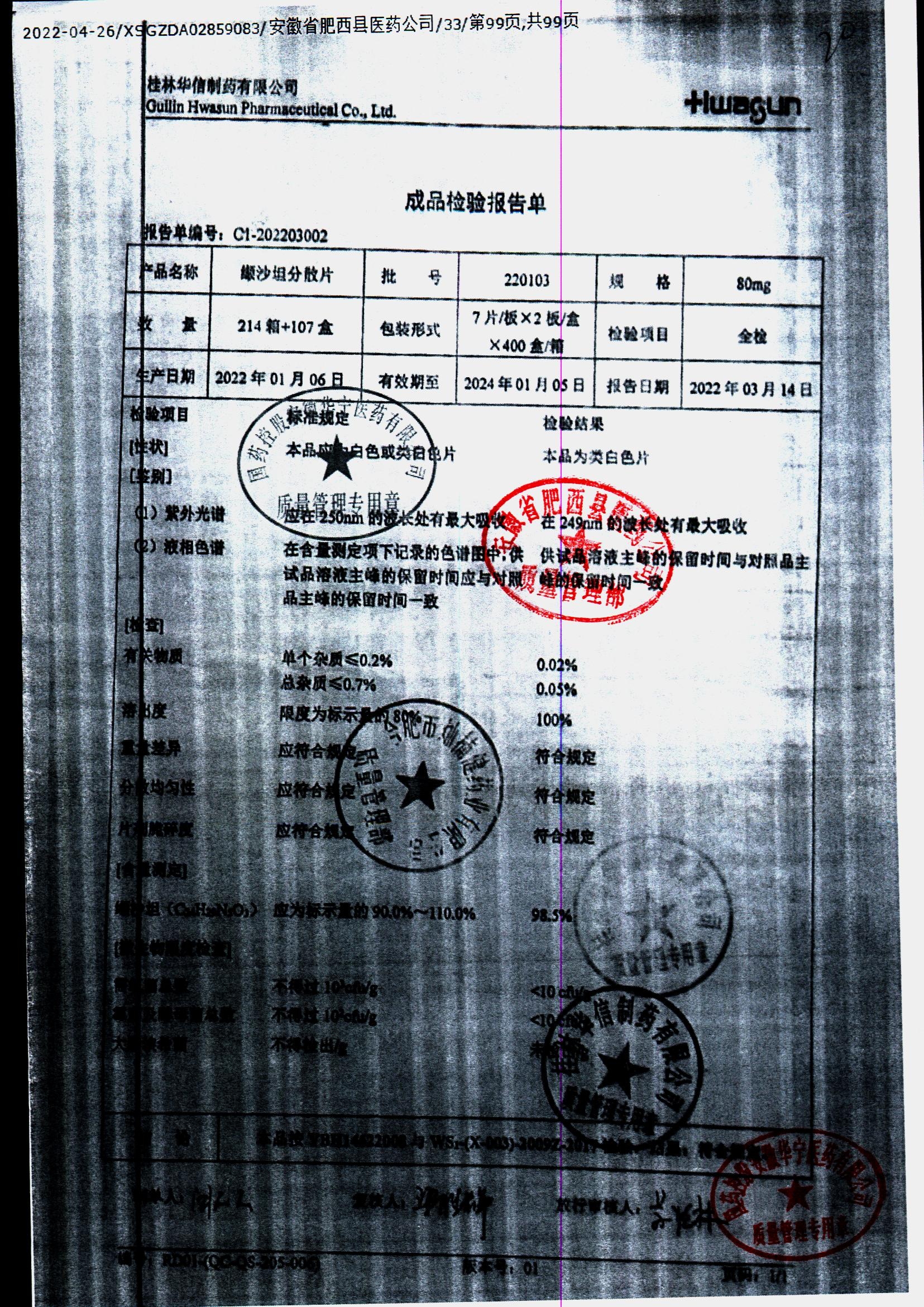 缬沙坦分散片 | 80mg*7s | 181001 | 查看详情 |