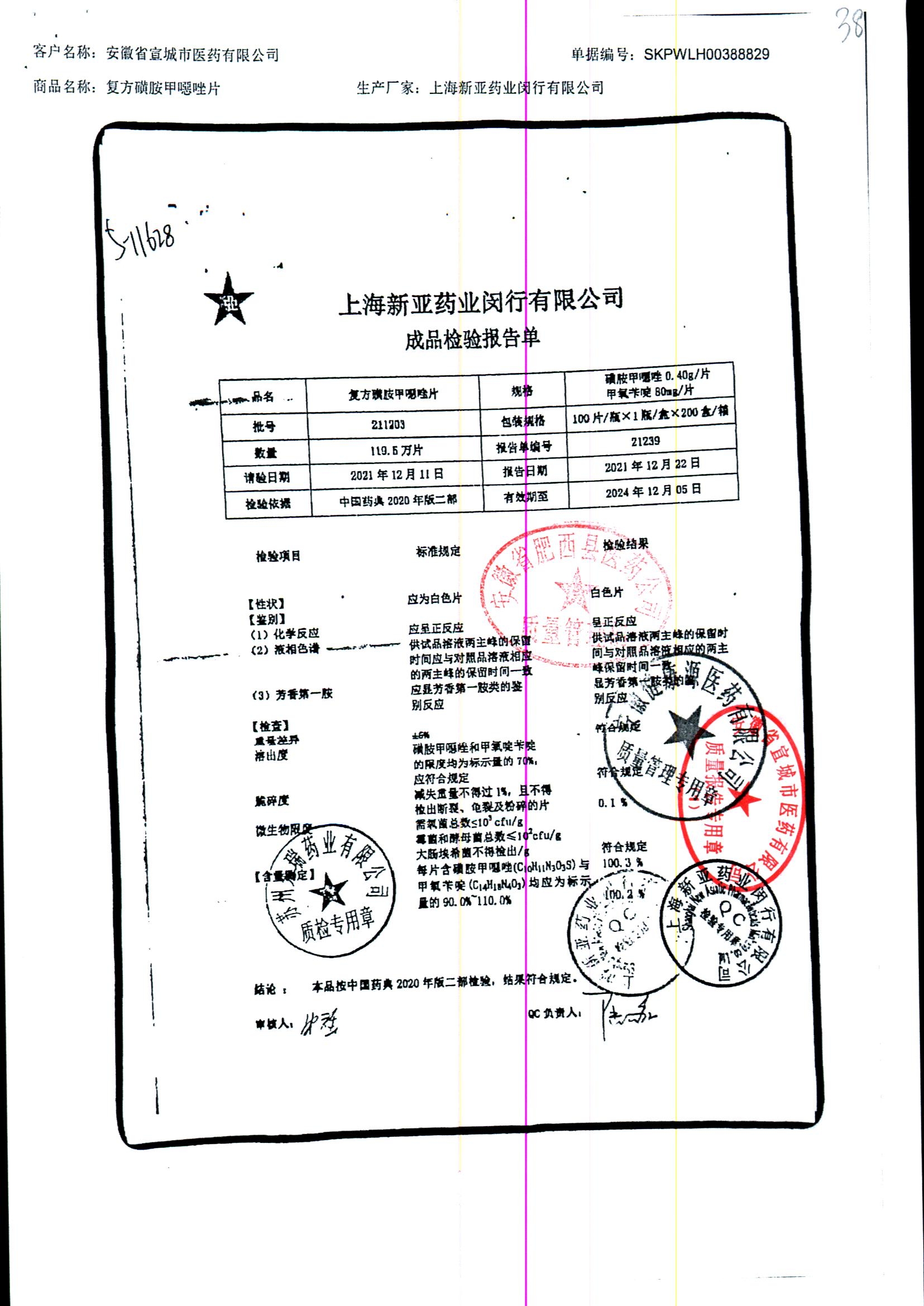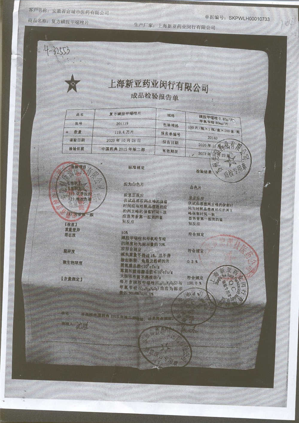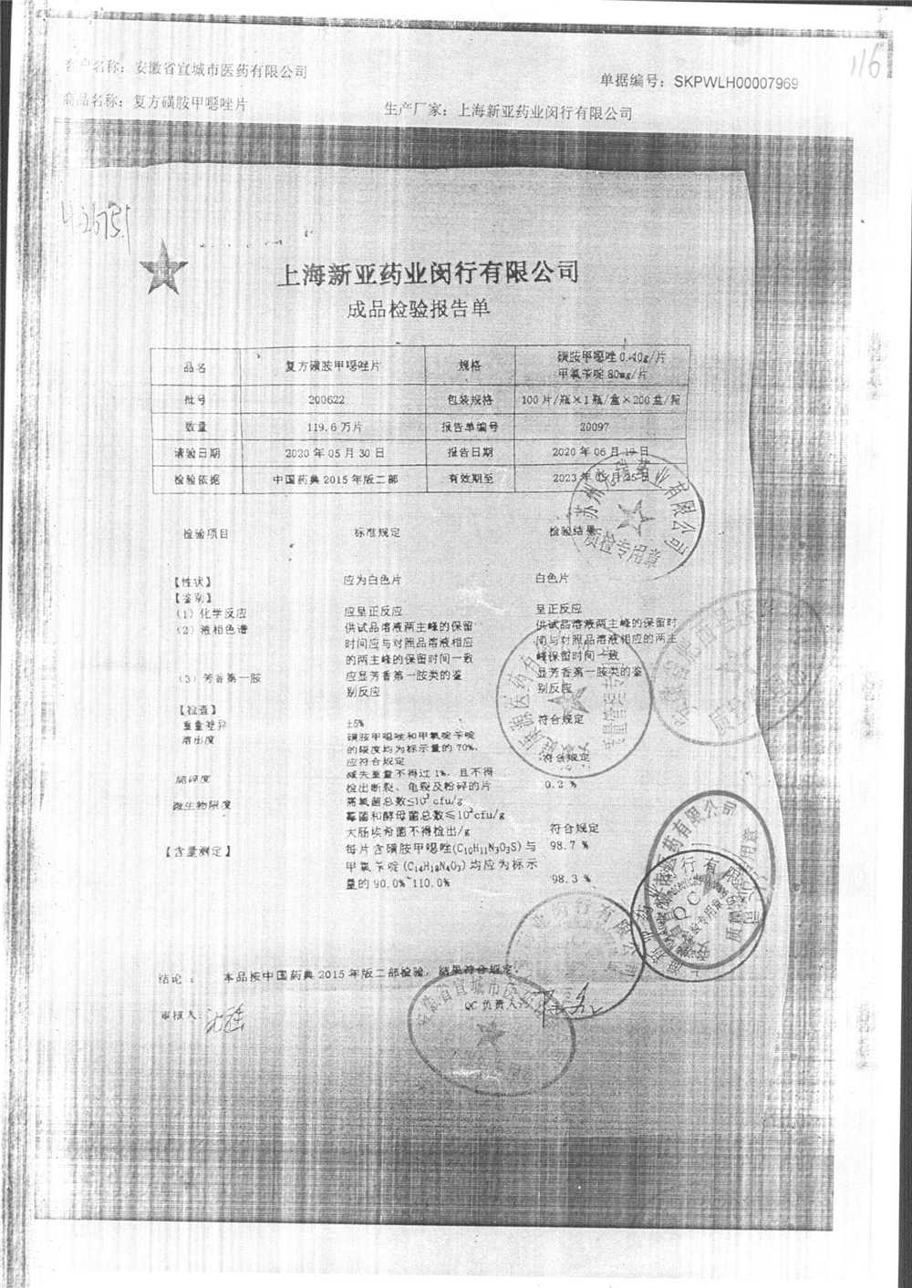 复方磺胺甲噁唑片 | 100片 | 211203 | 查看详情 |