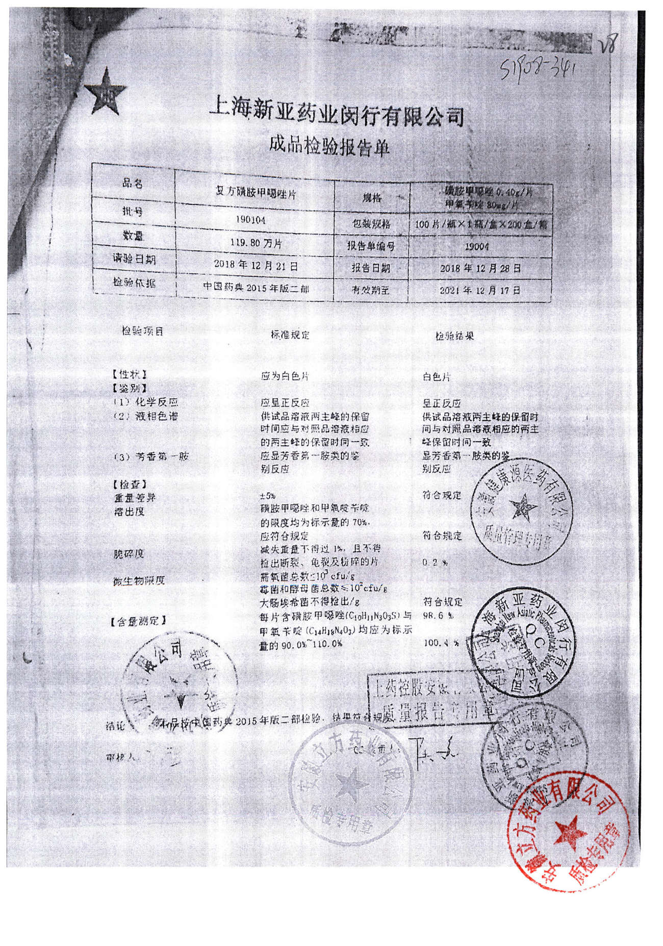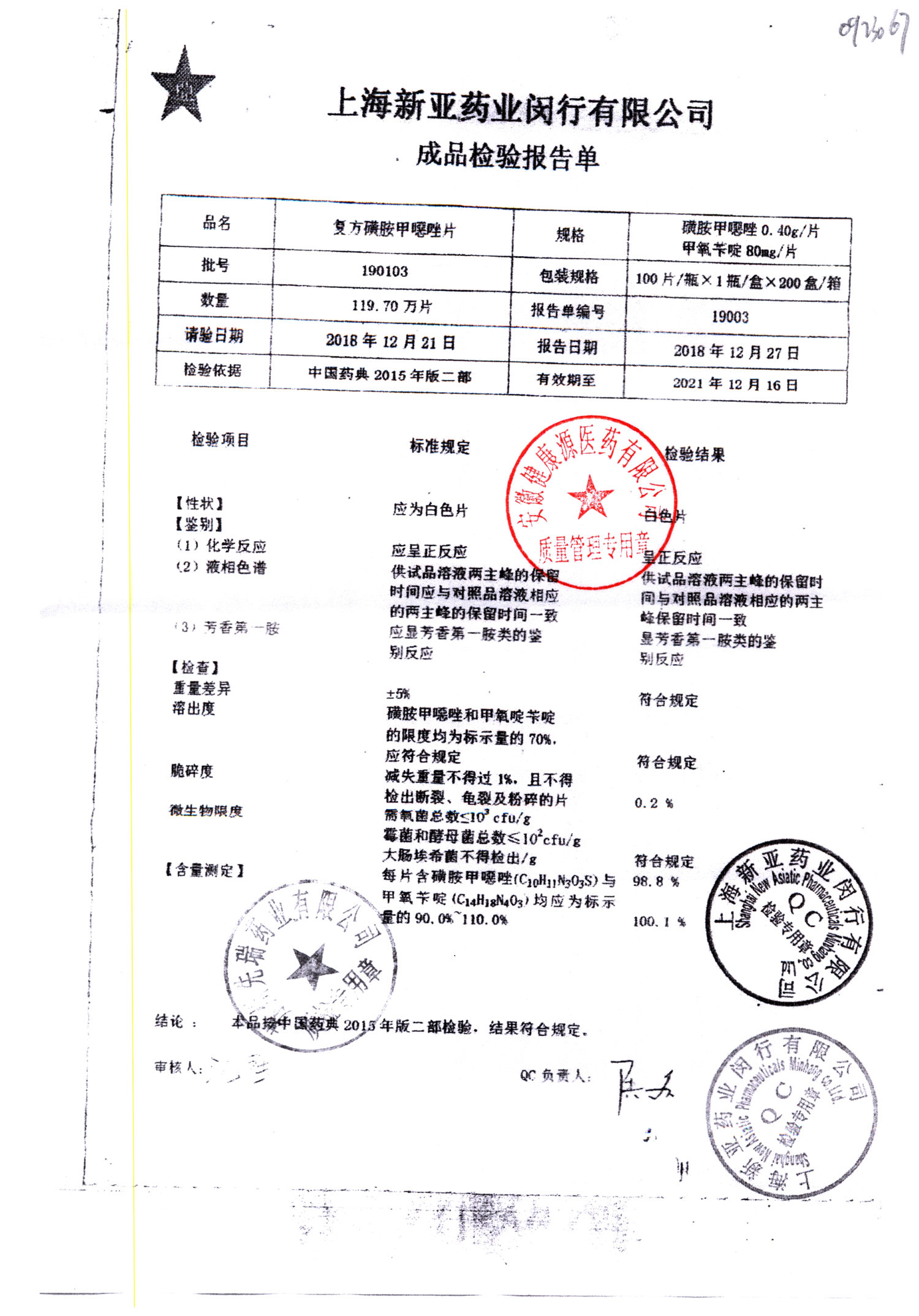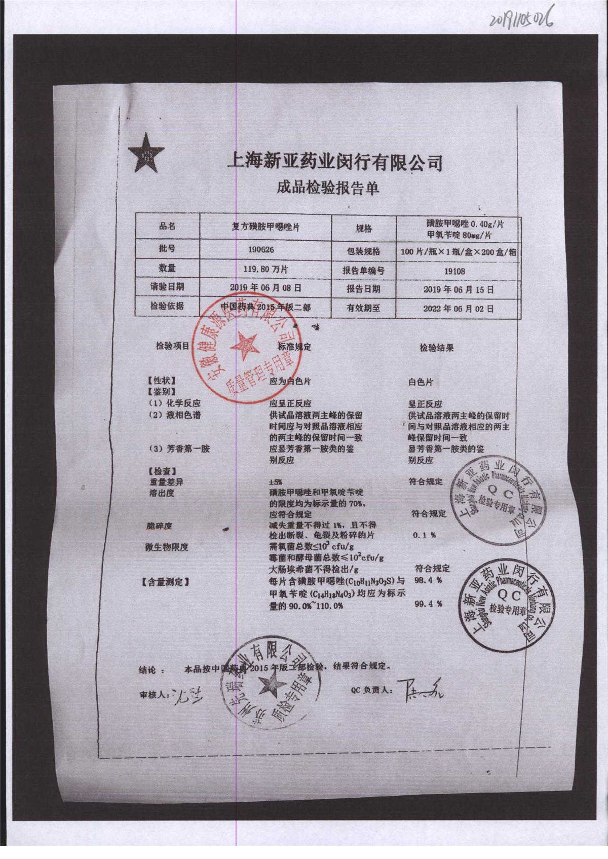 复方磺胺甲噁唑片 | 100片 | 191214 | 查看详情 |