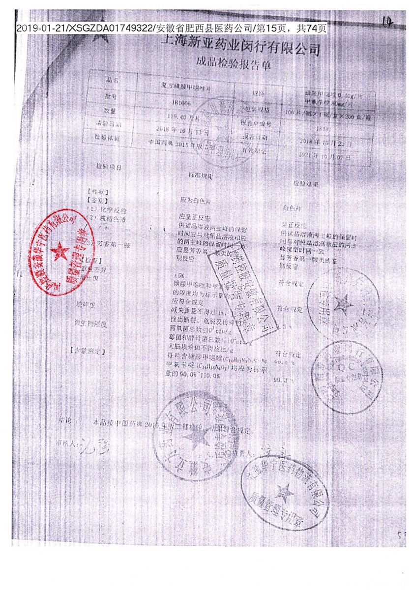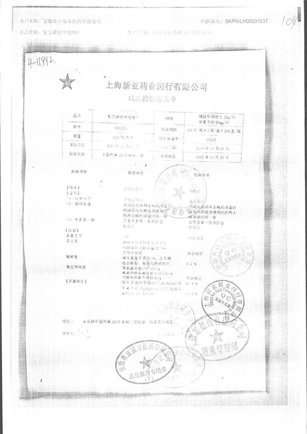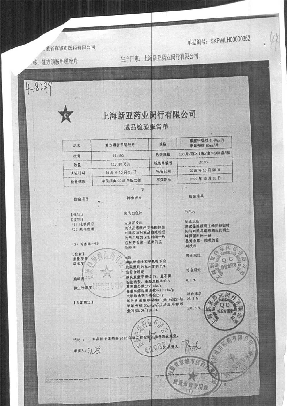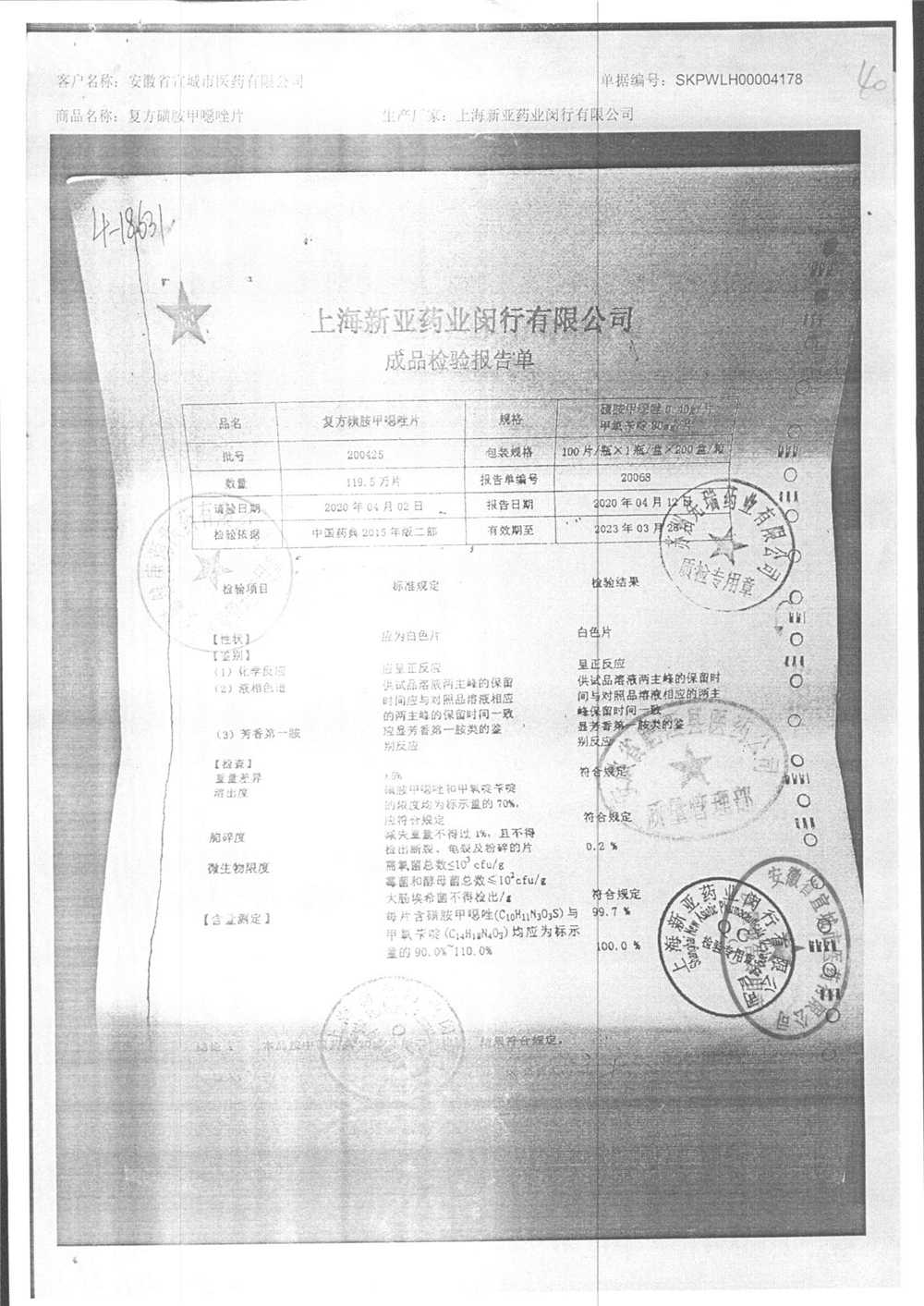 复方磺胺甲噁唑片 | 100片 | 191214 | 查看详情 |
