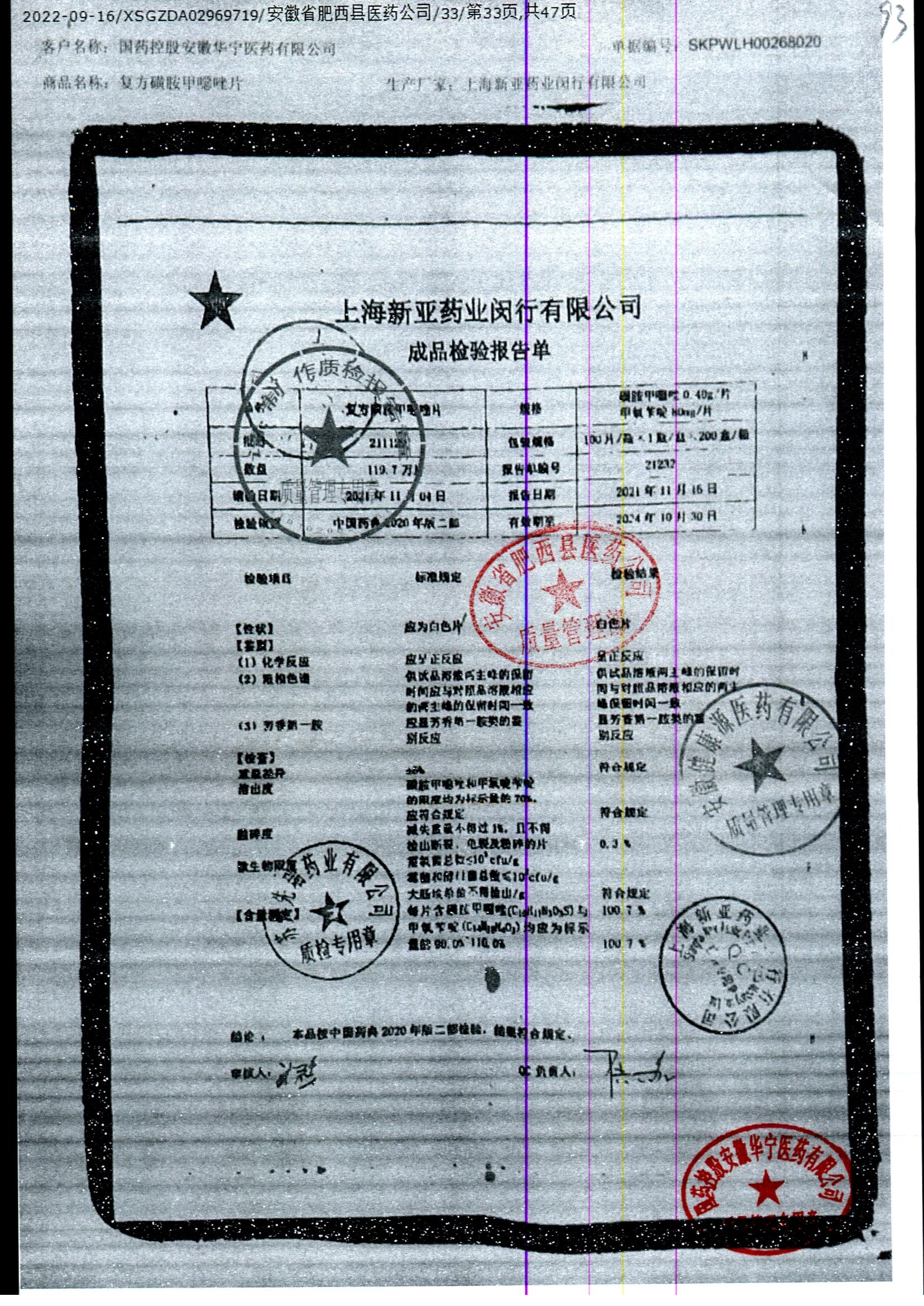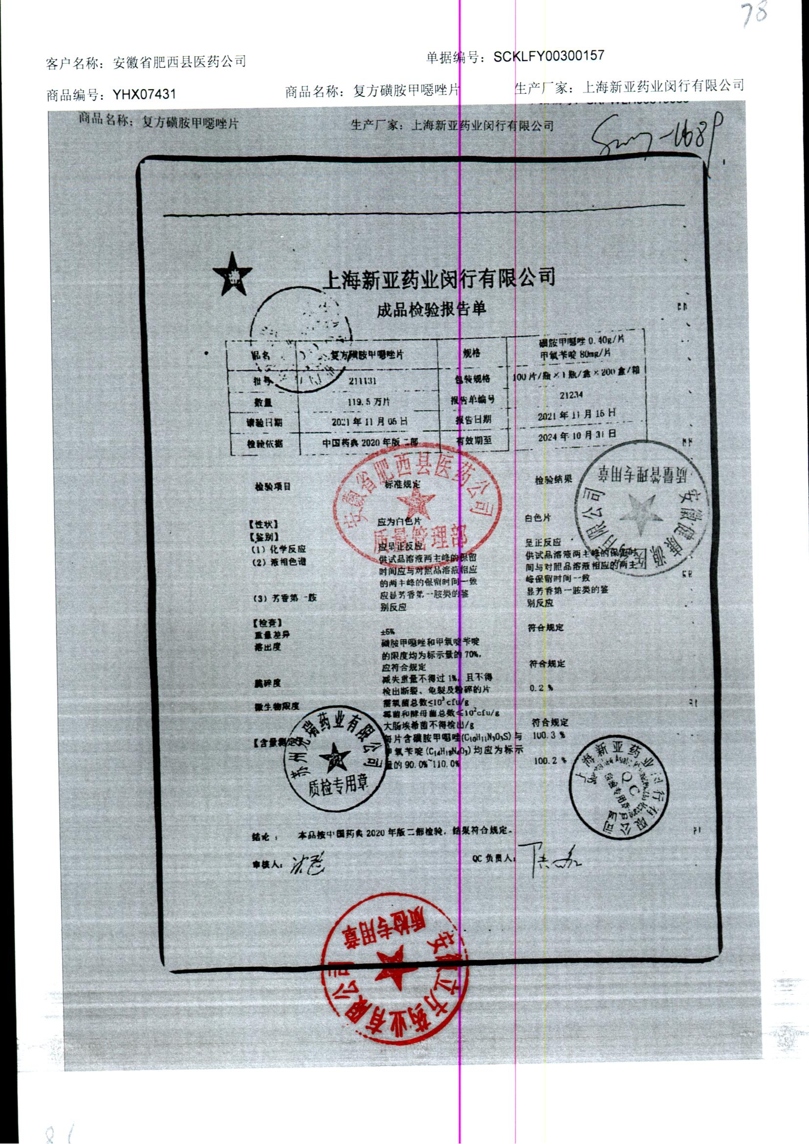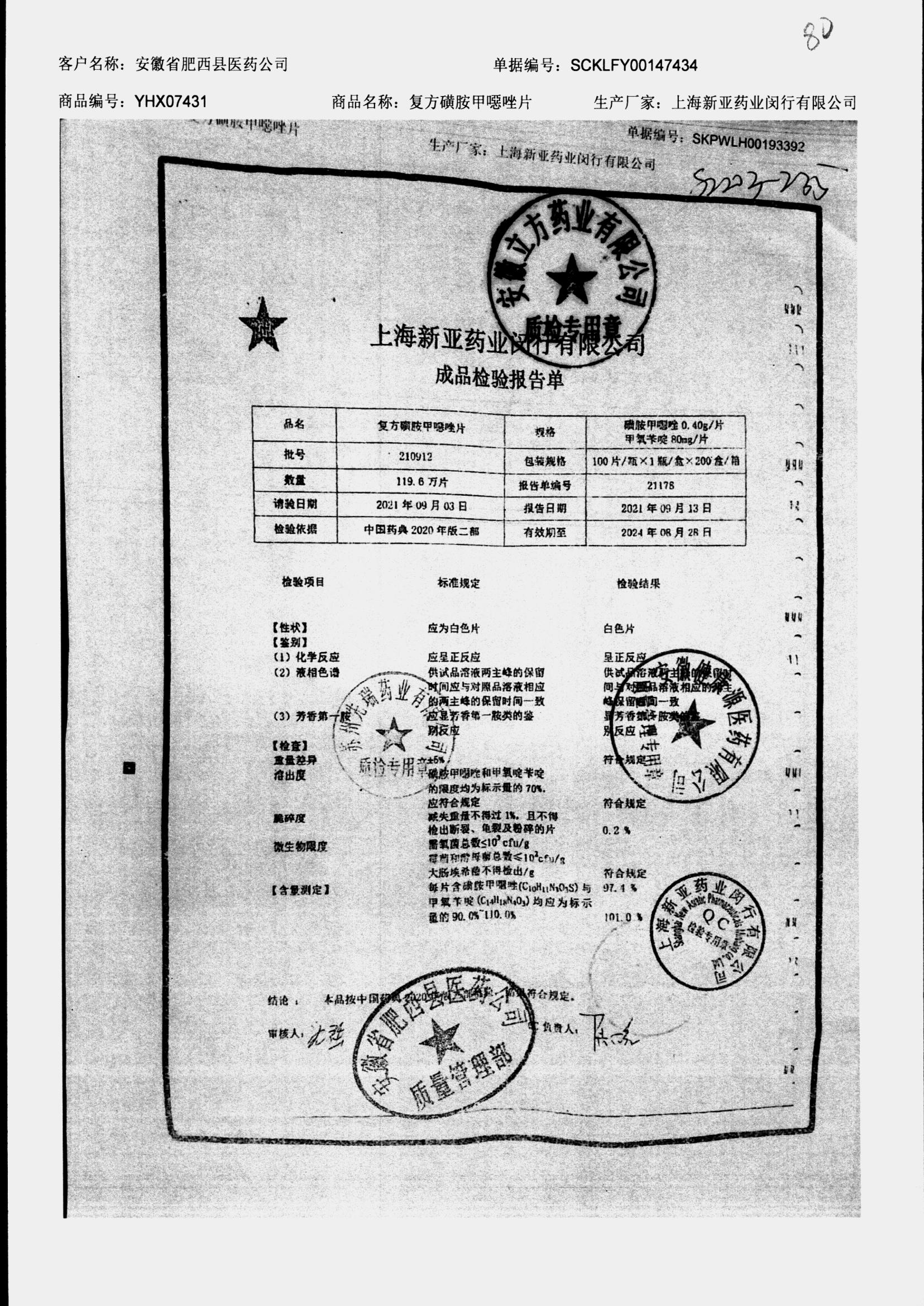 复方磺胺甲噁唑片 | 100片 | 210912 | 查看详情 |