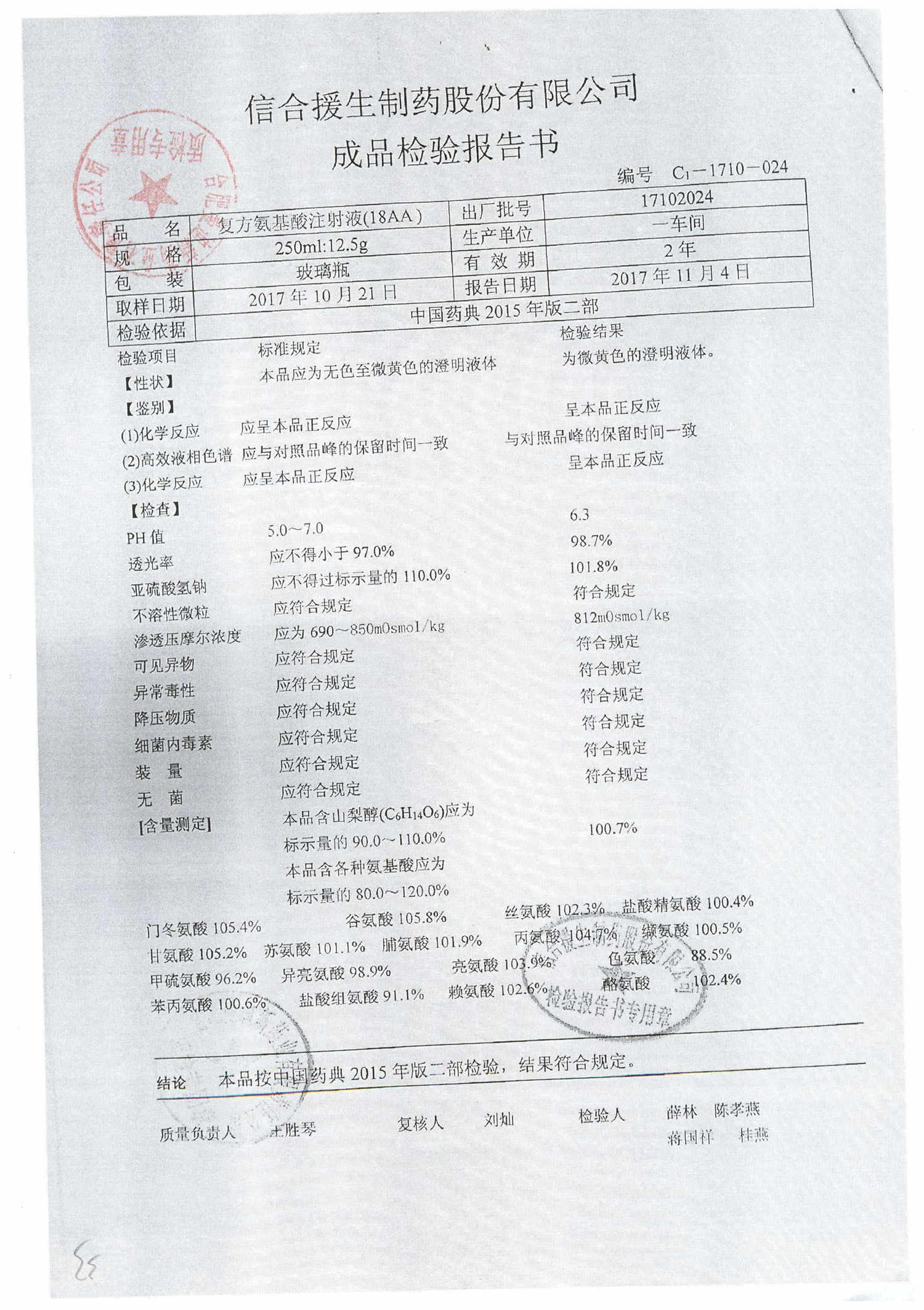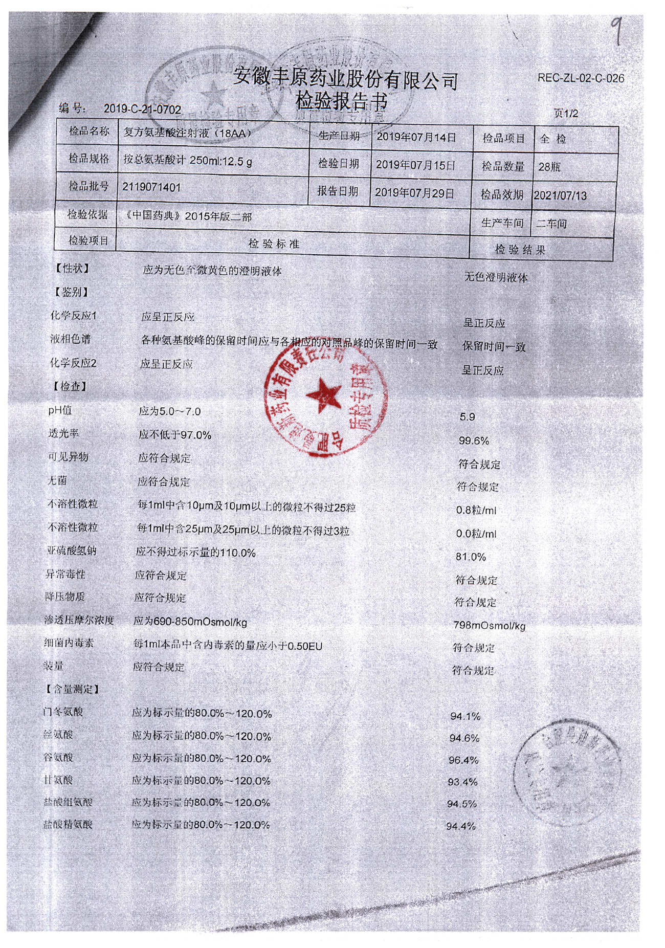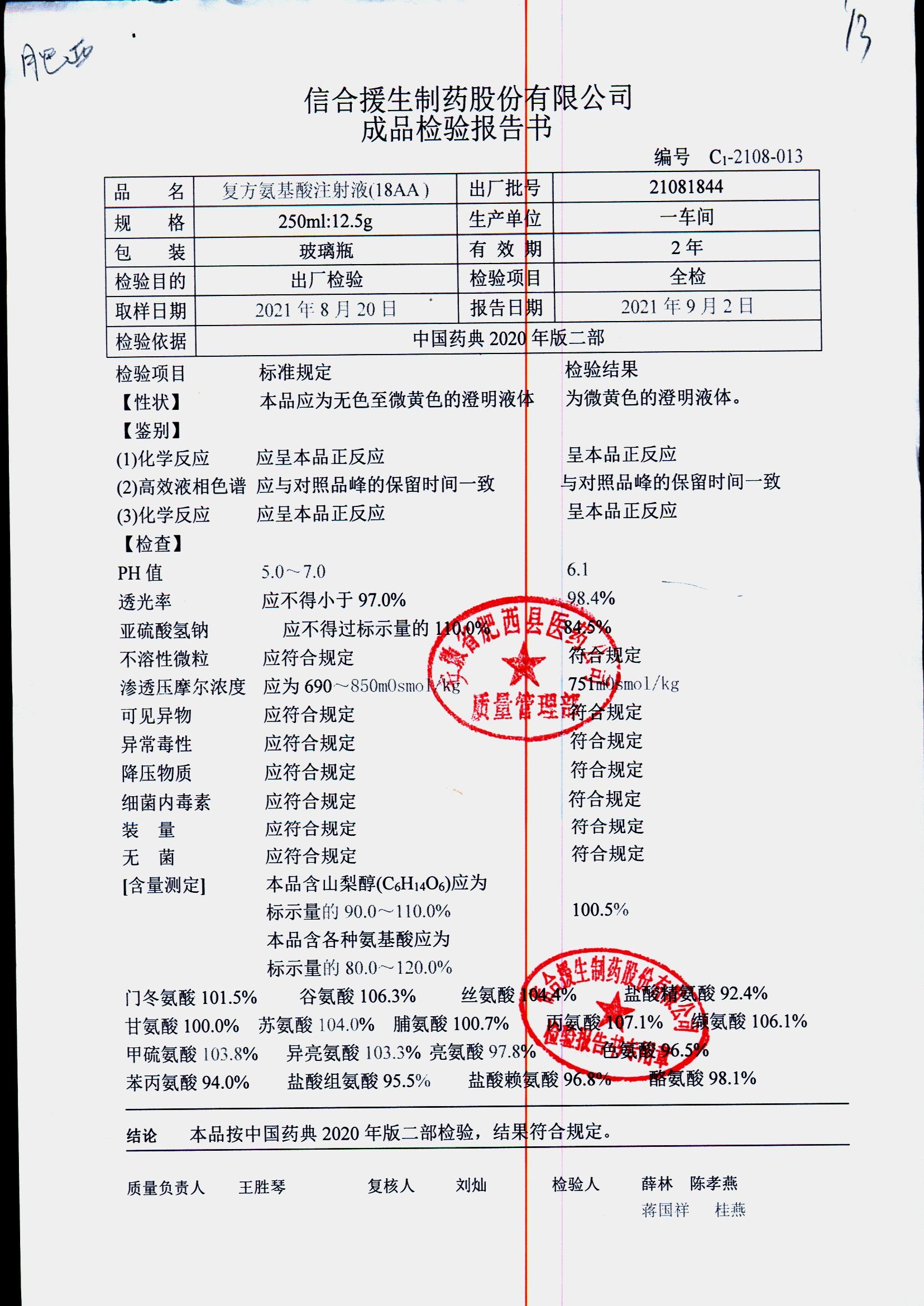 复方氨基酸注射液(18AA) | 250ml:12.5g | 2119071401(1/2) | 查看详情 |
