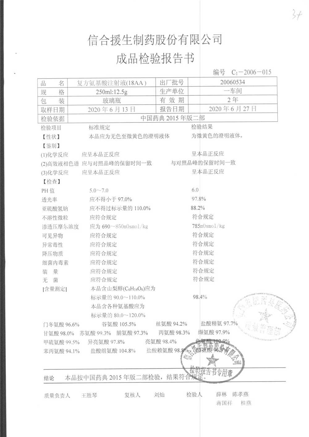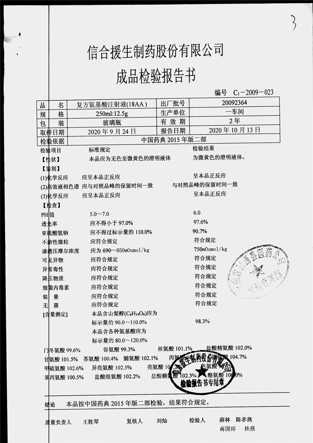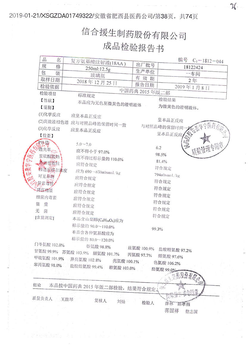 复方氨基酸注射液(18AA) | 250ml:12.5g | 2119071401(1/2) | 查看详情 |