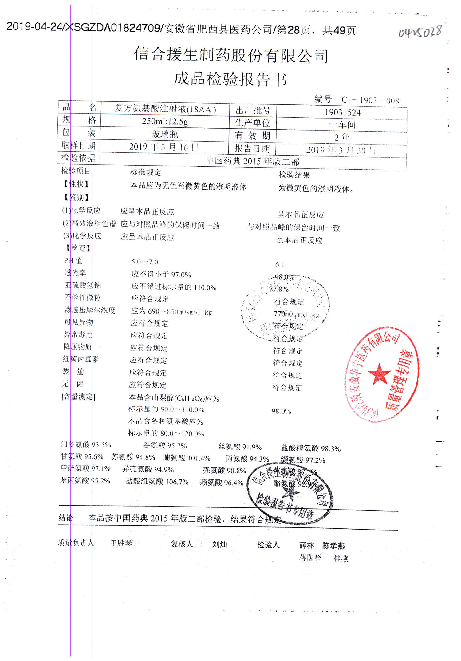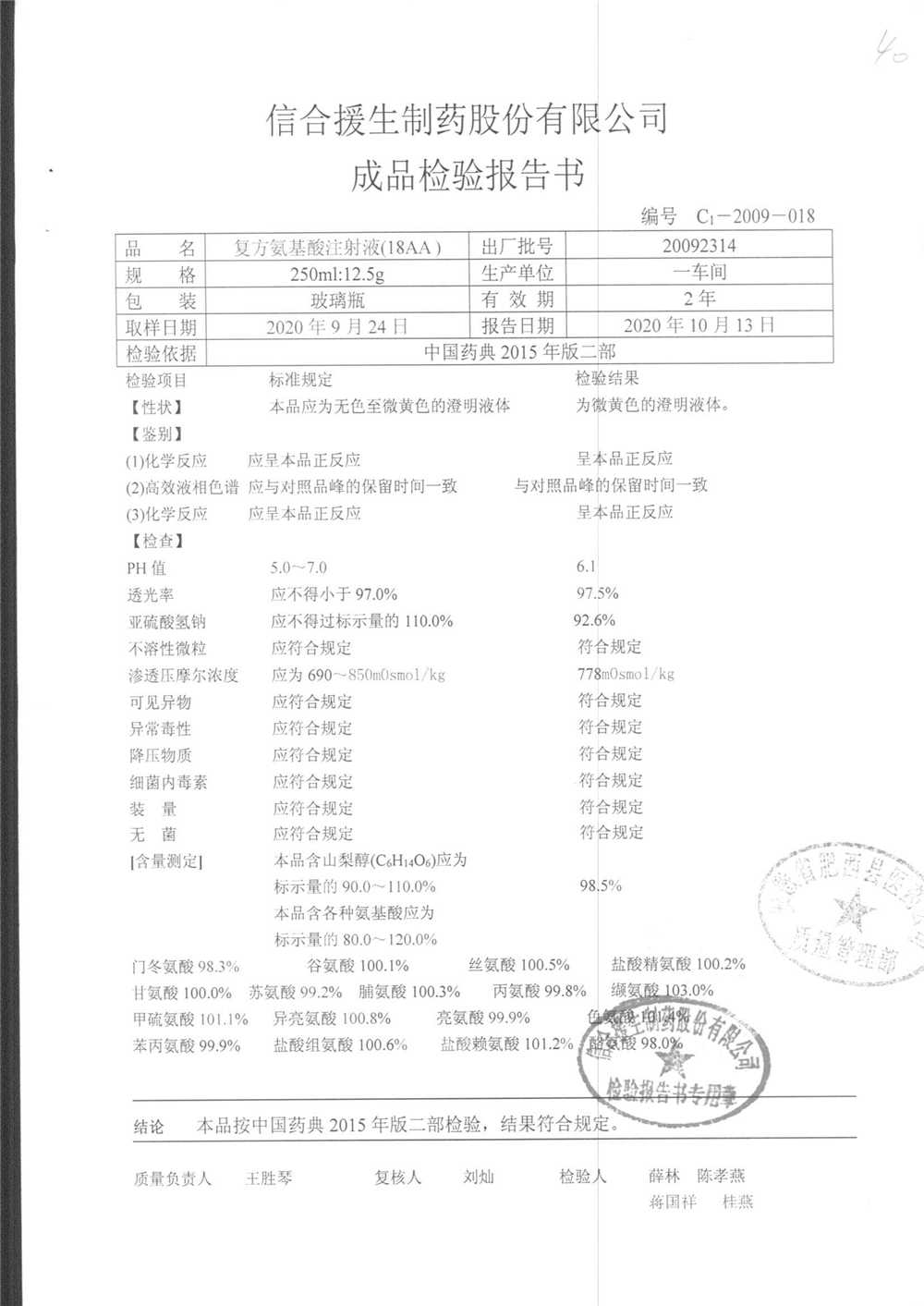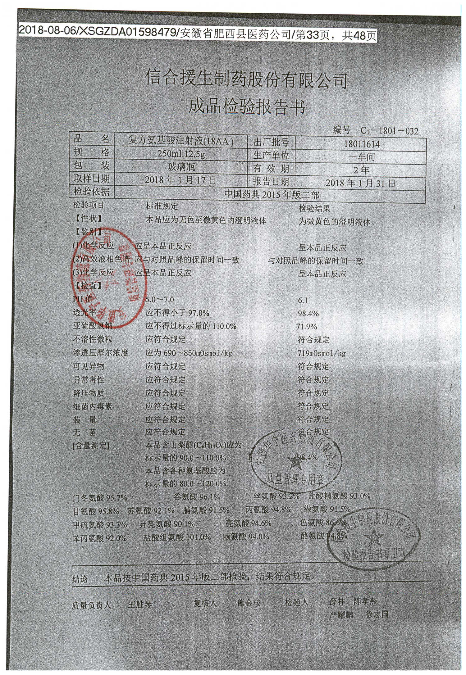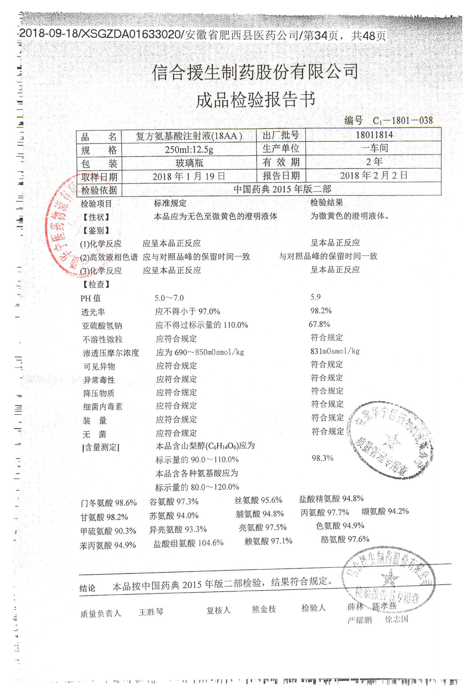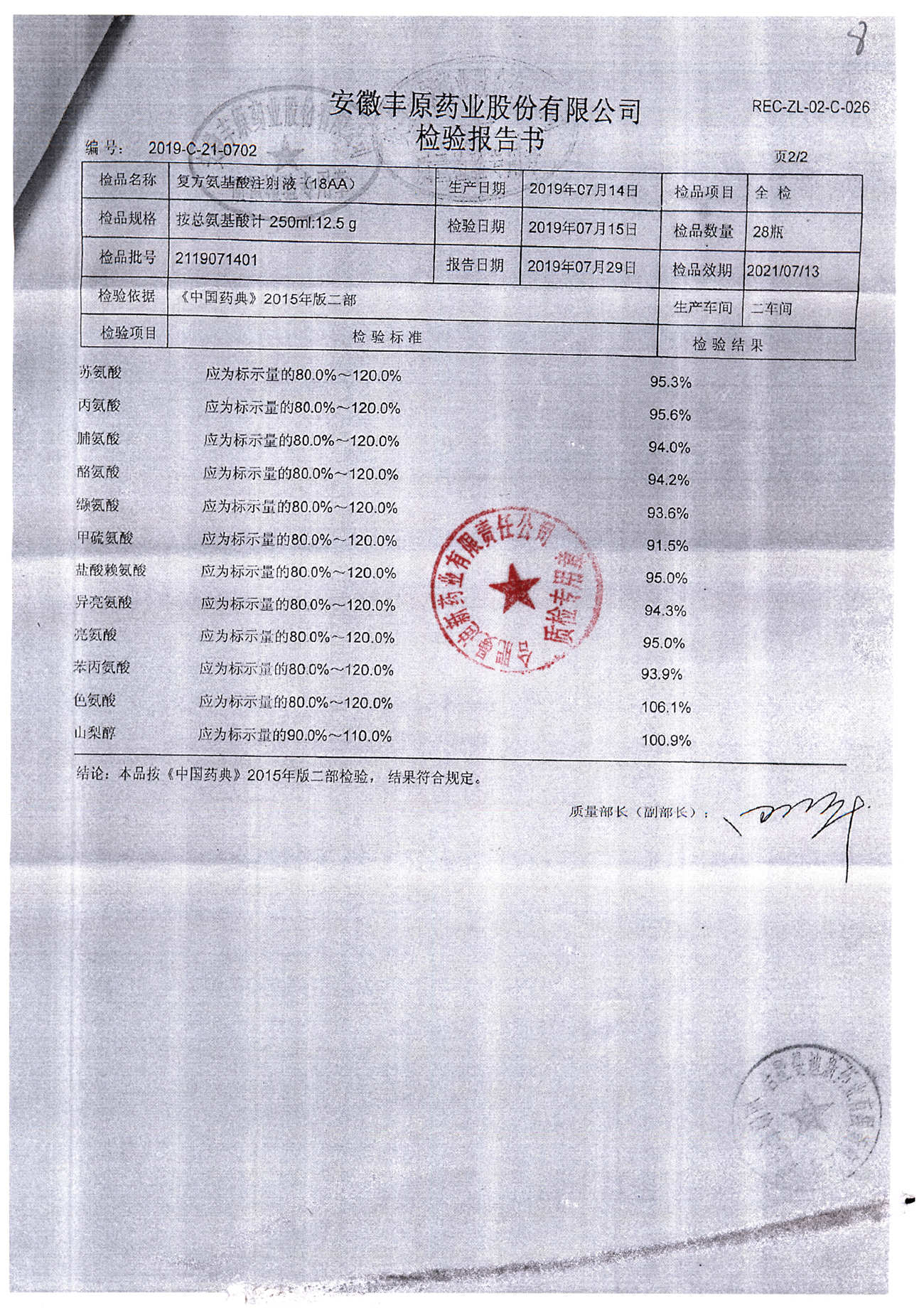 复方氨基酸注射液(18AA) | 250ml:12.5g | 2119071401(2/2) | 查看详情 |