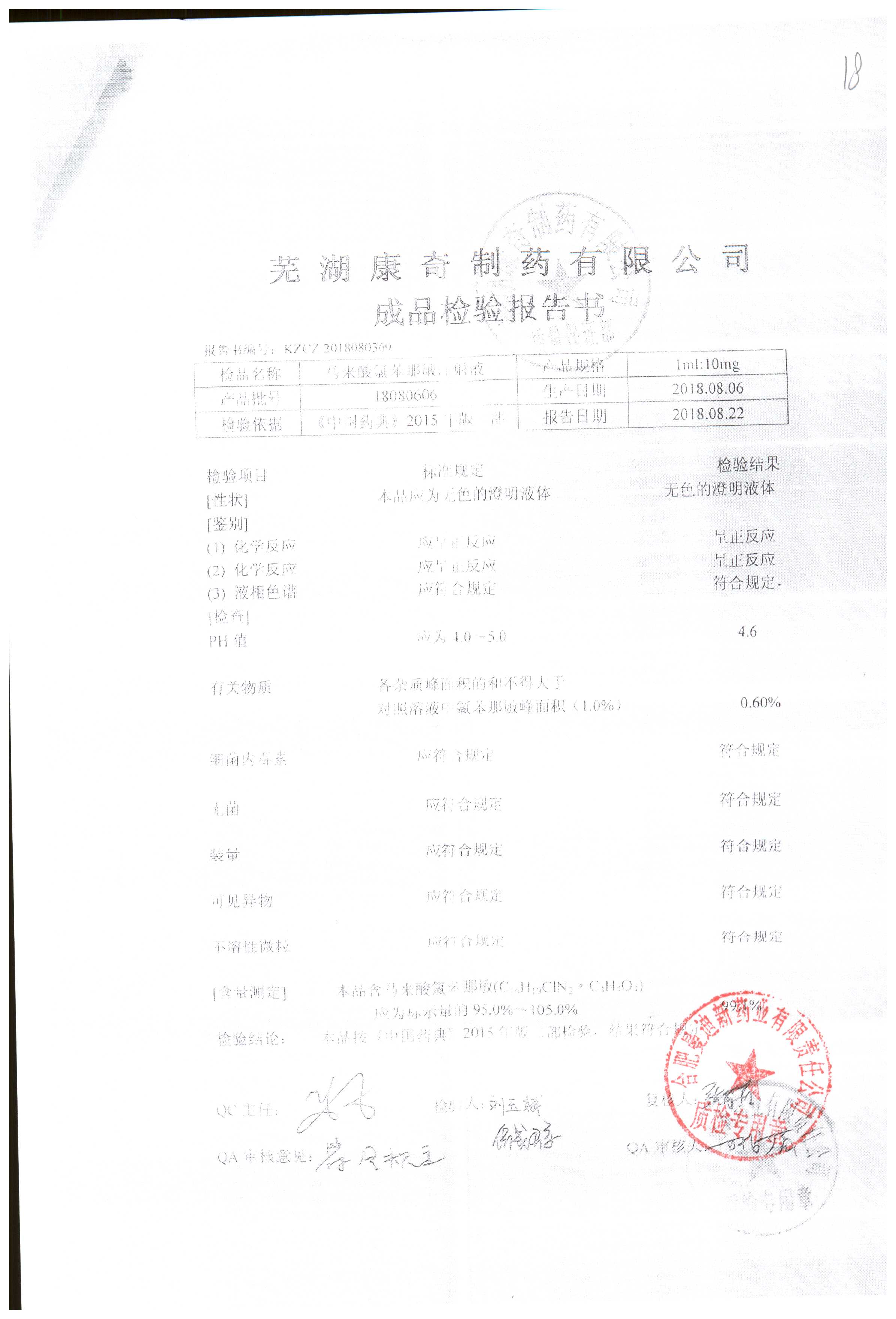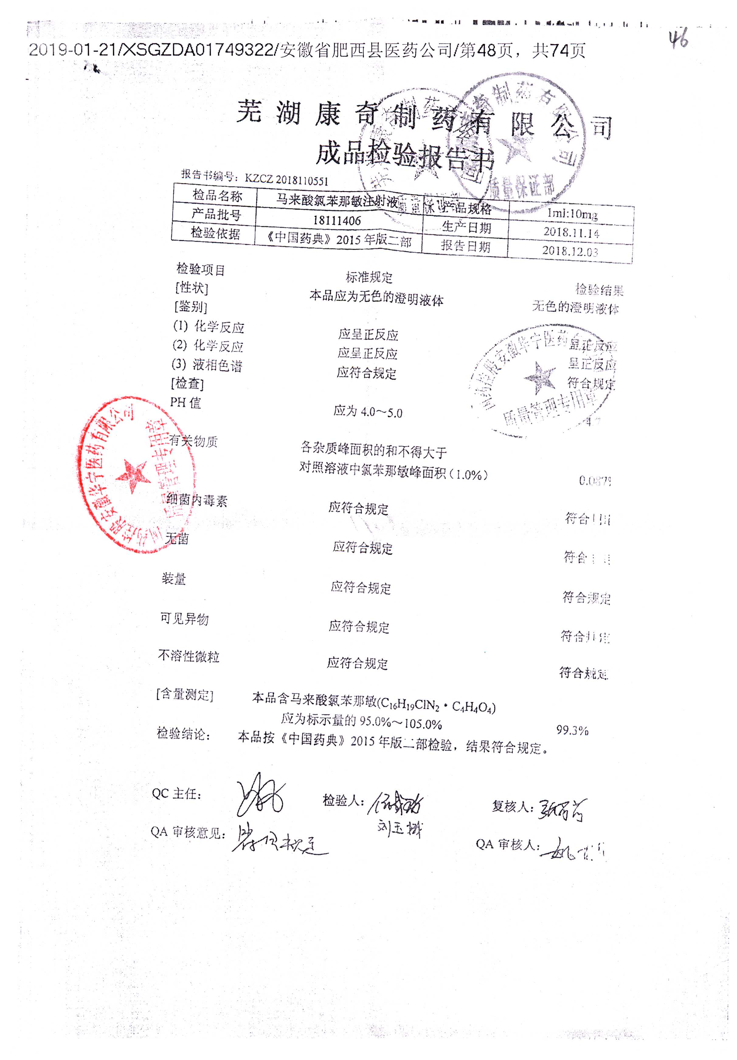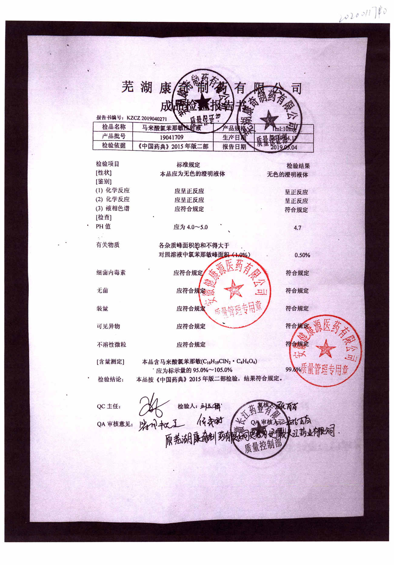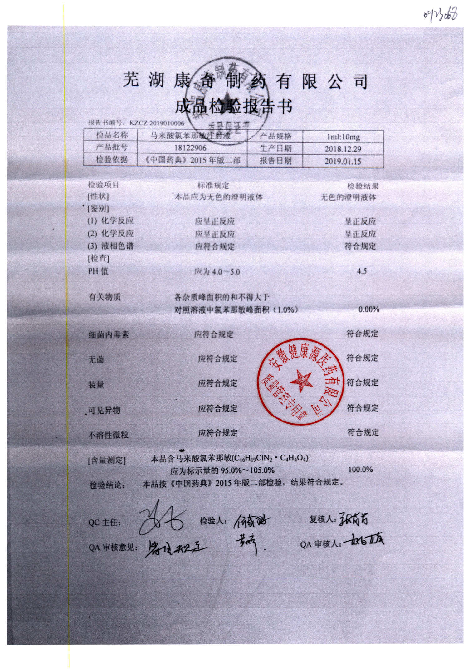 马来酸氯苯那敏注射液 | 1ml:10mg | 18121005 | 查看详情 |