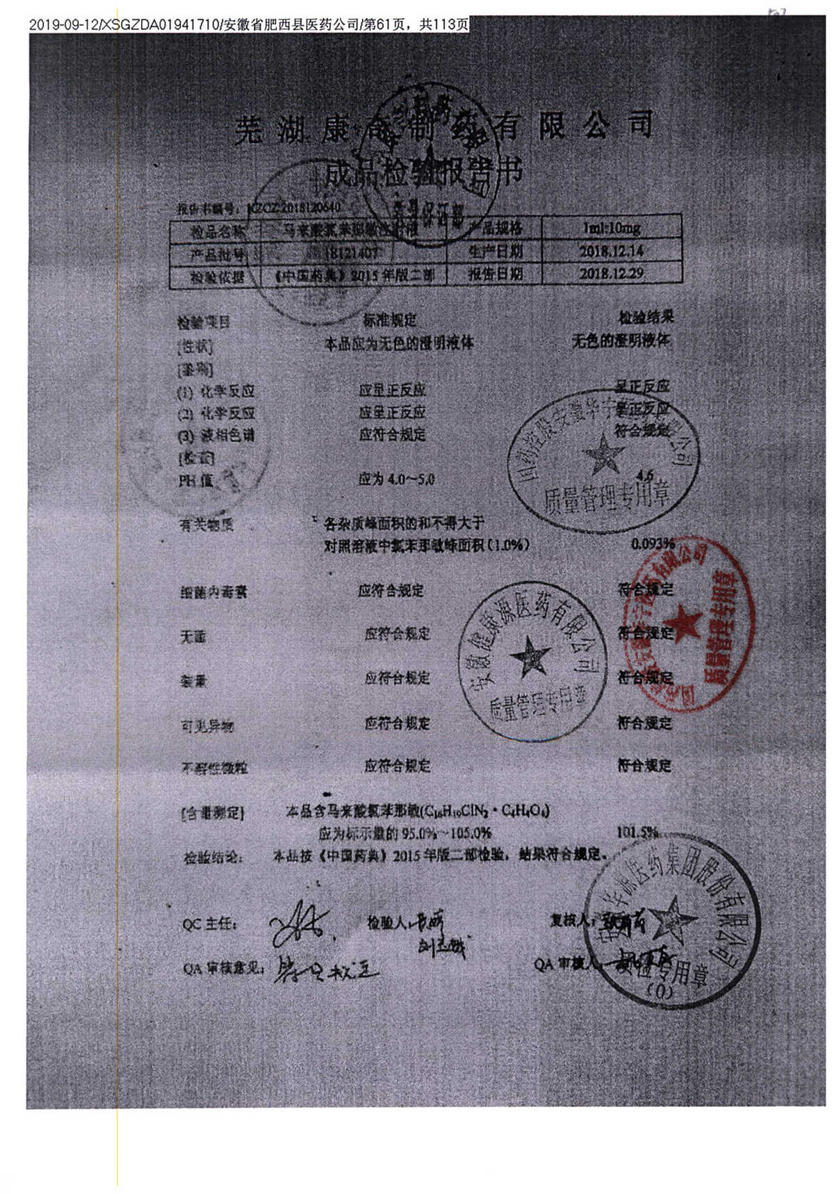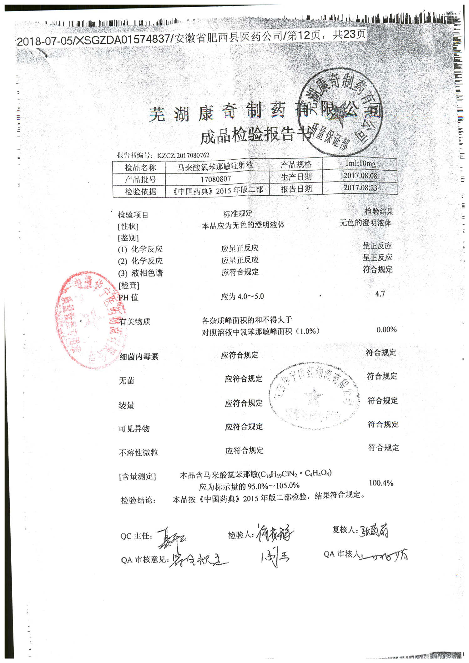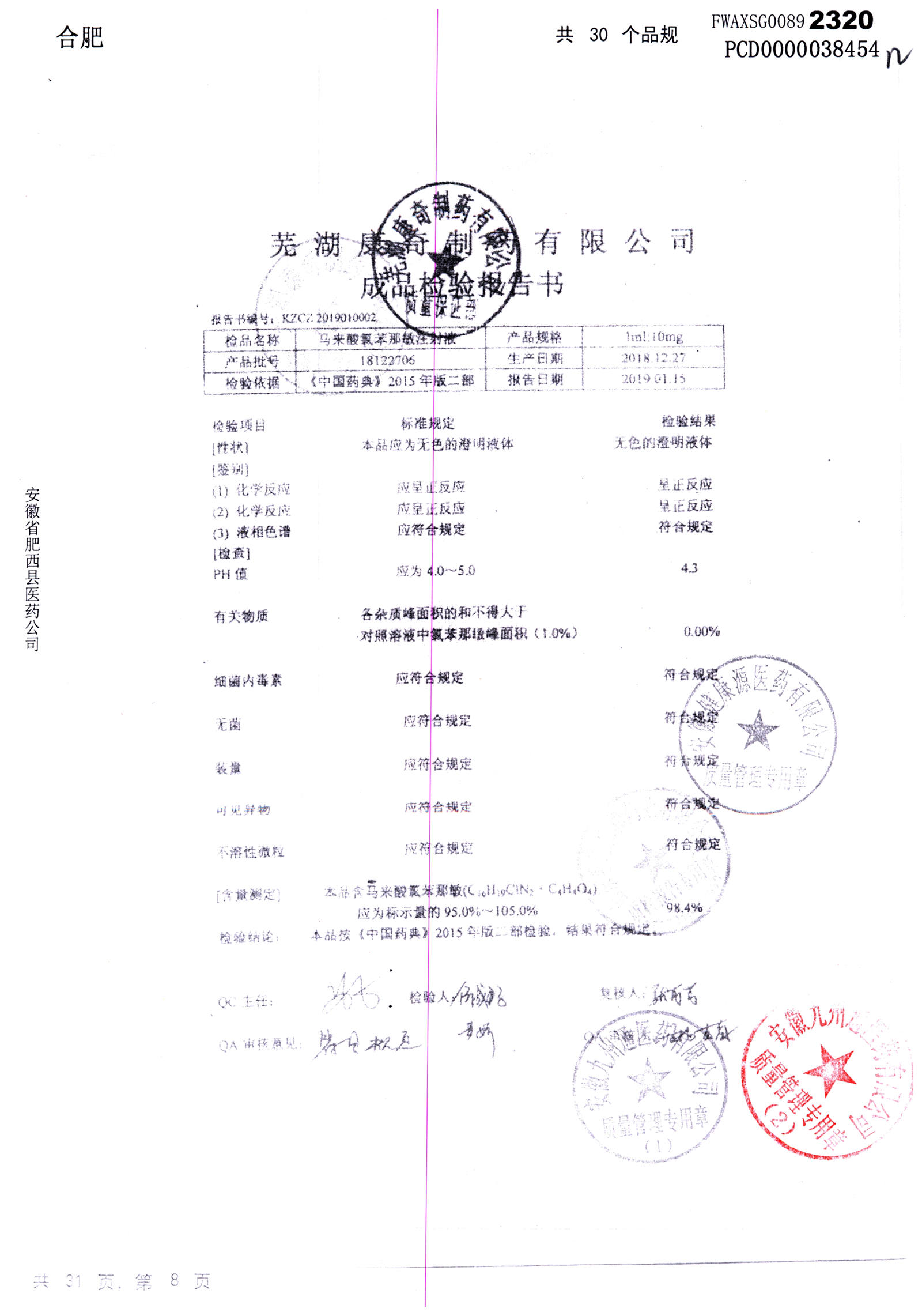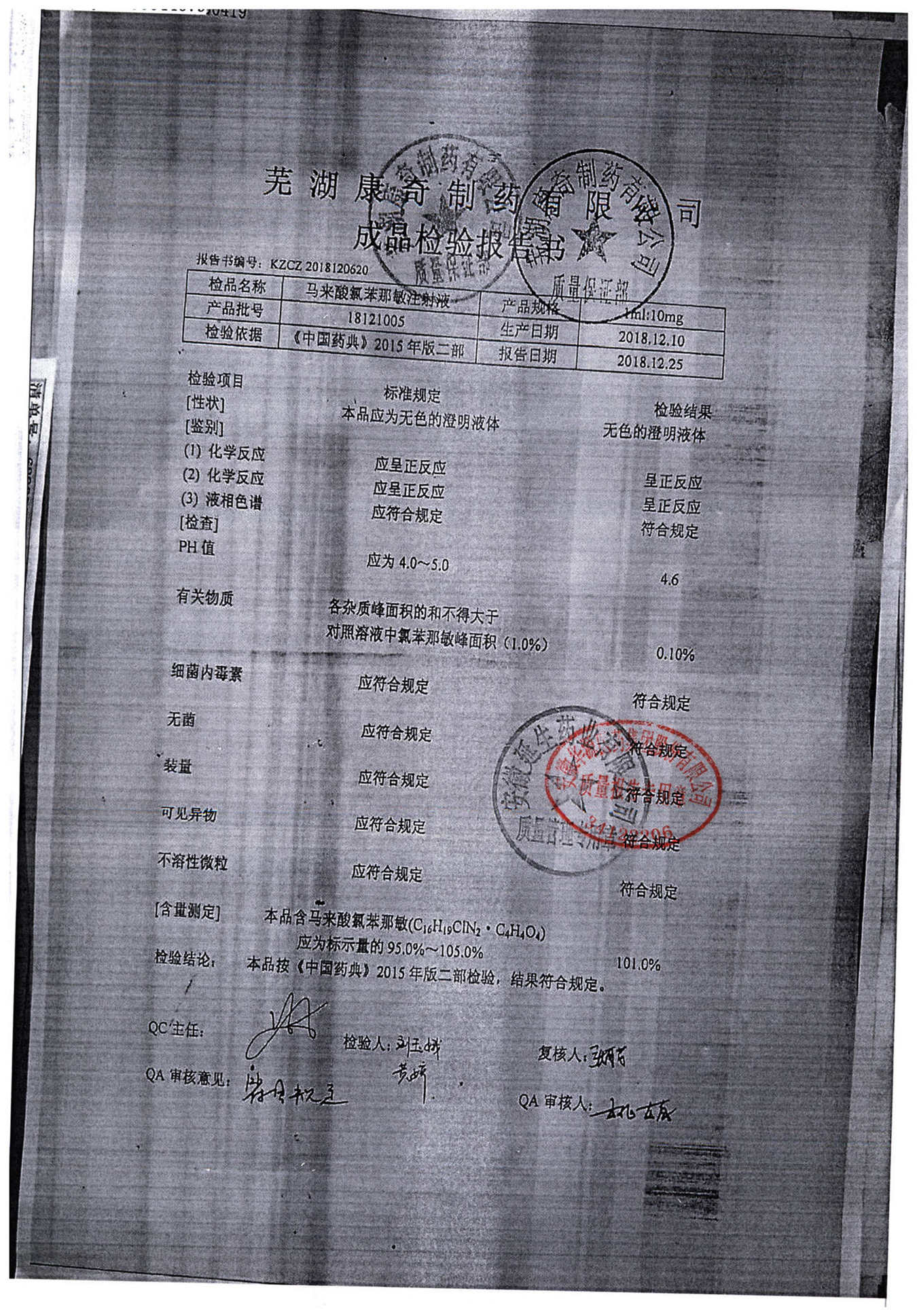 马来酸氯苯那敏注射液 | 1ml:10mg | 18121005 | 查看详情 |