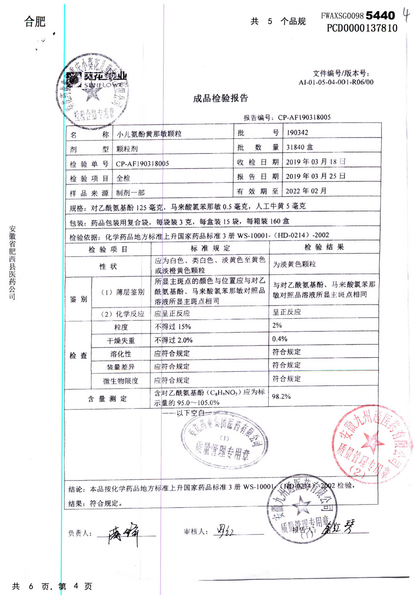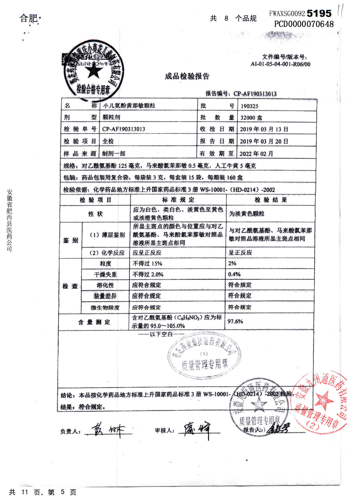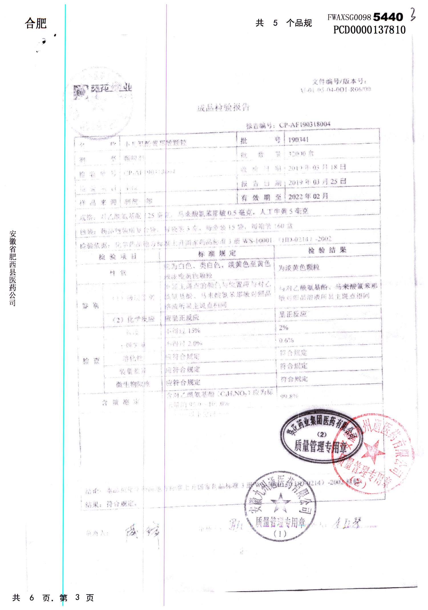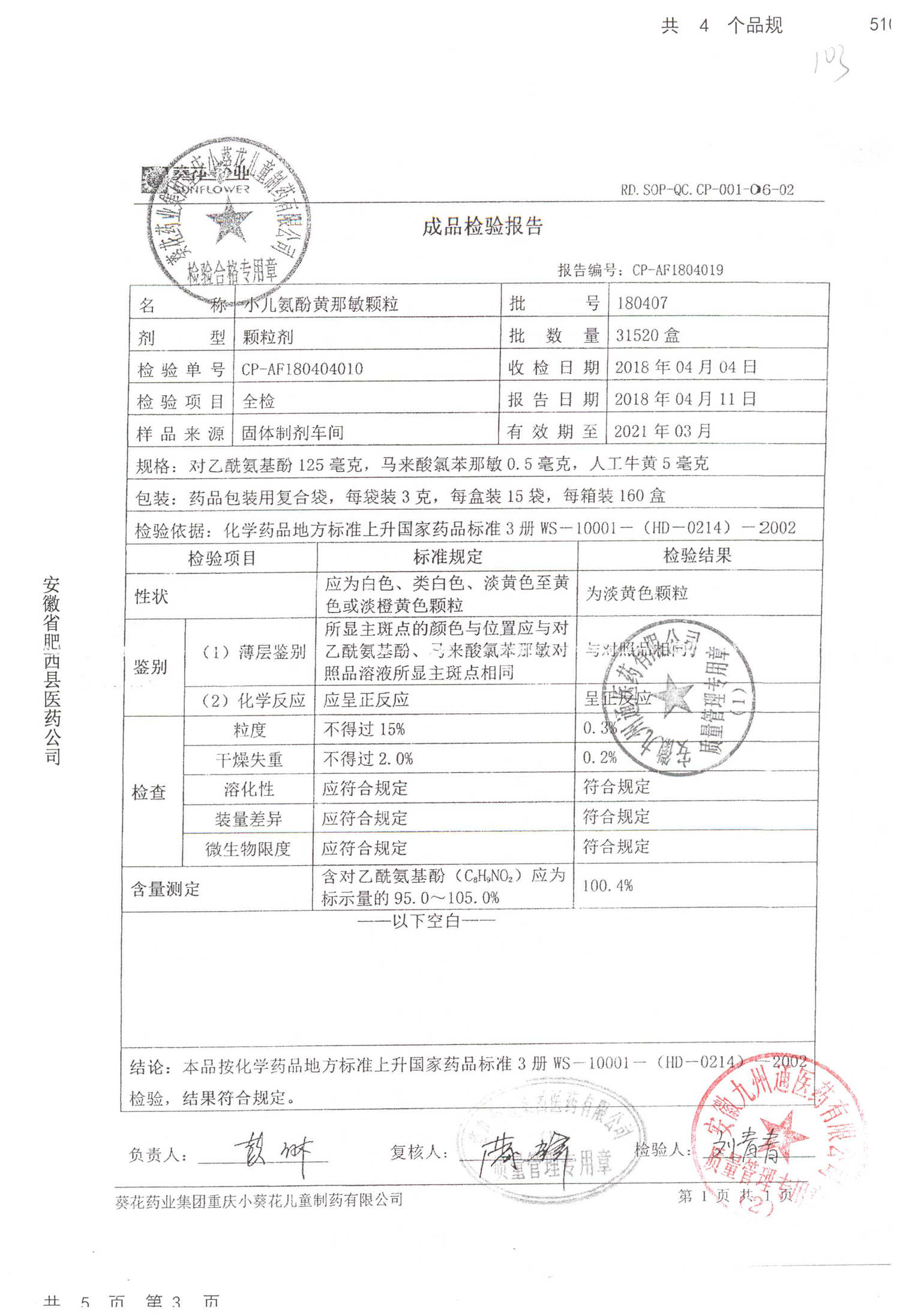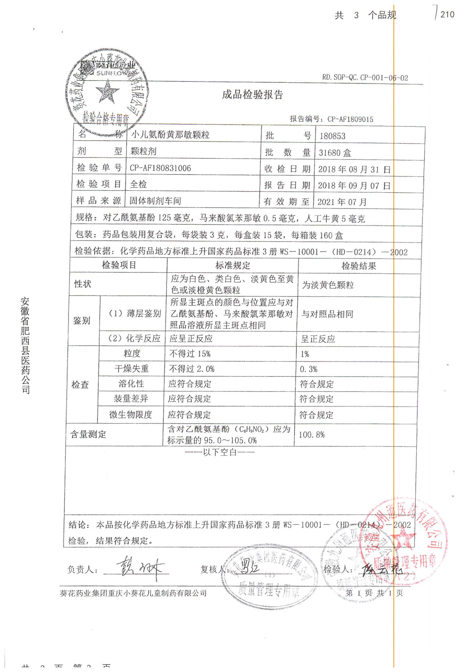 名称 | 规格 | 批号 | 药检报告 |