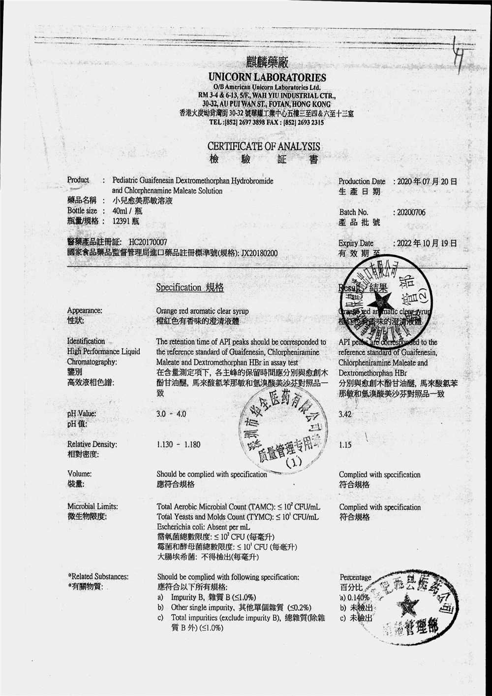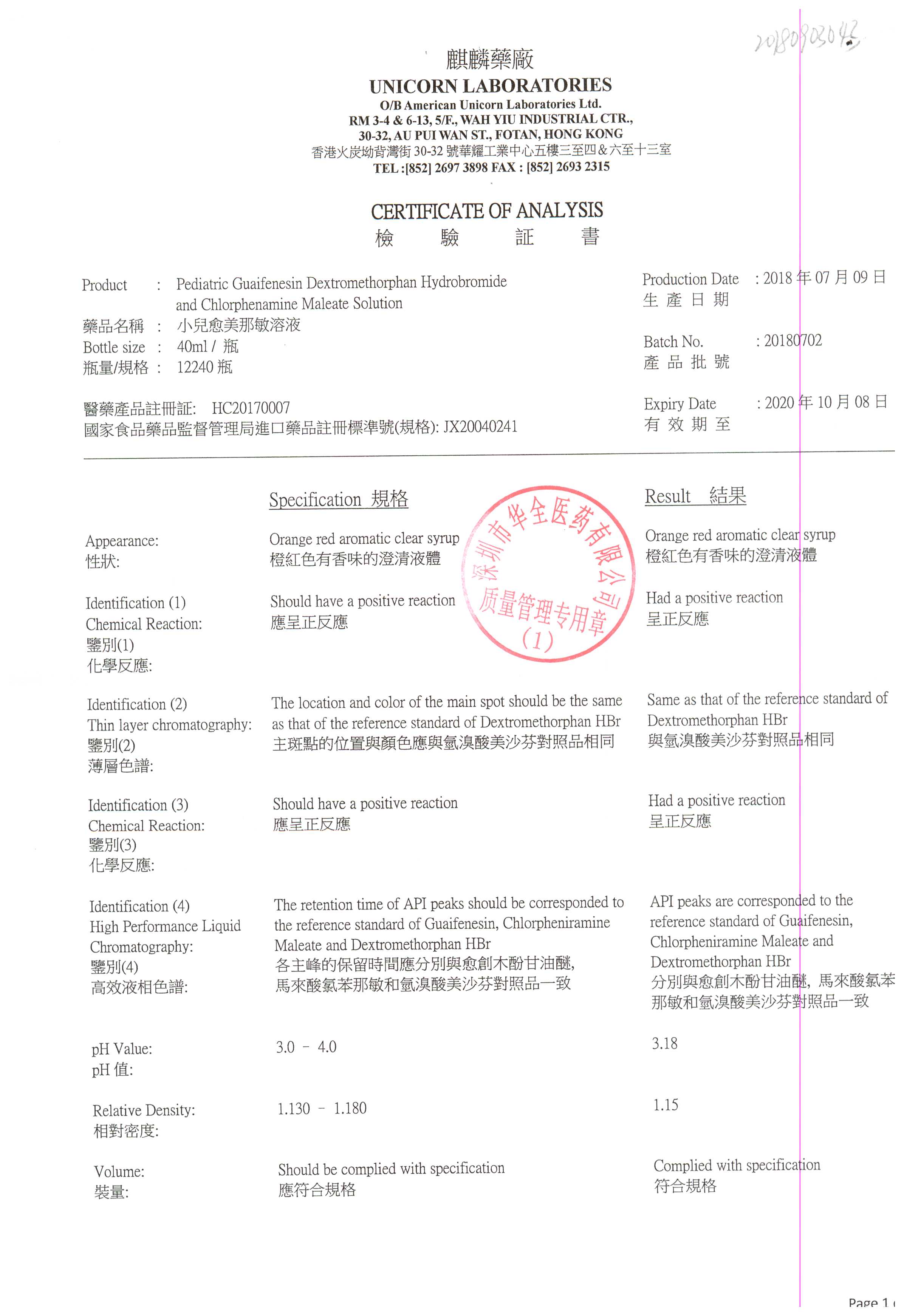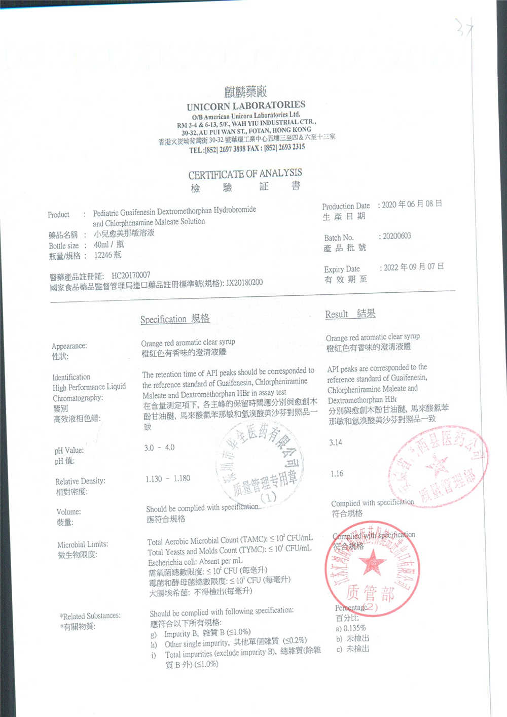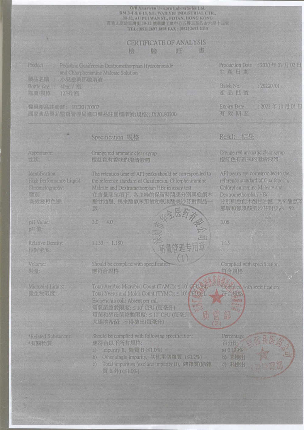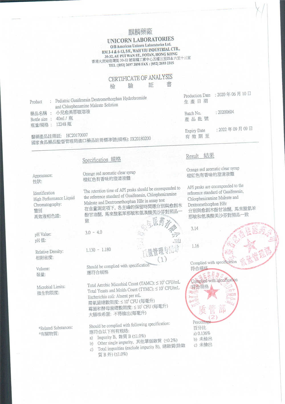 小儿愈美那敏溶液 | 40ml | 20180809(4/4) | 查看详情 |