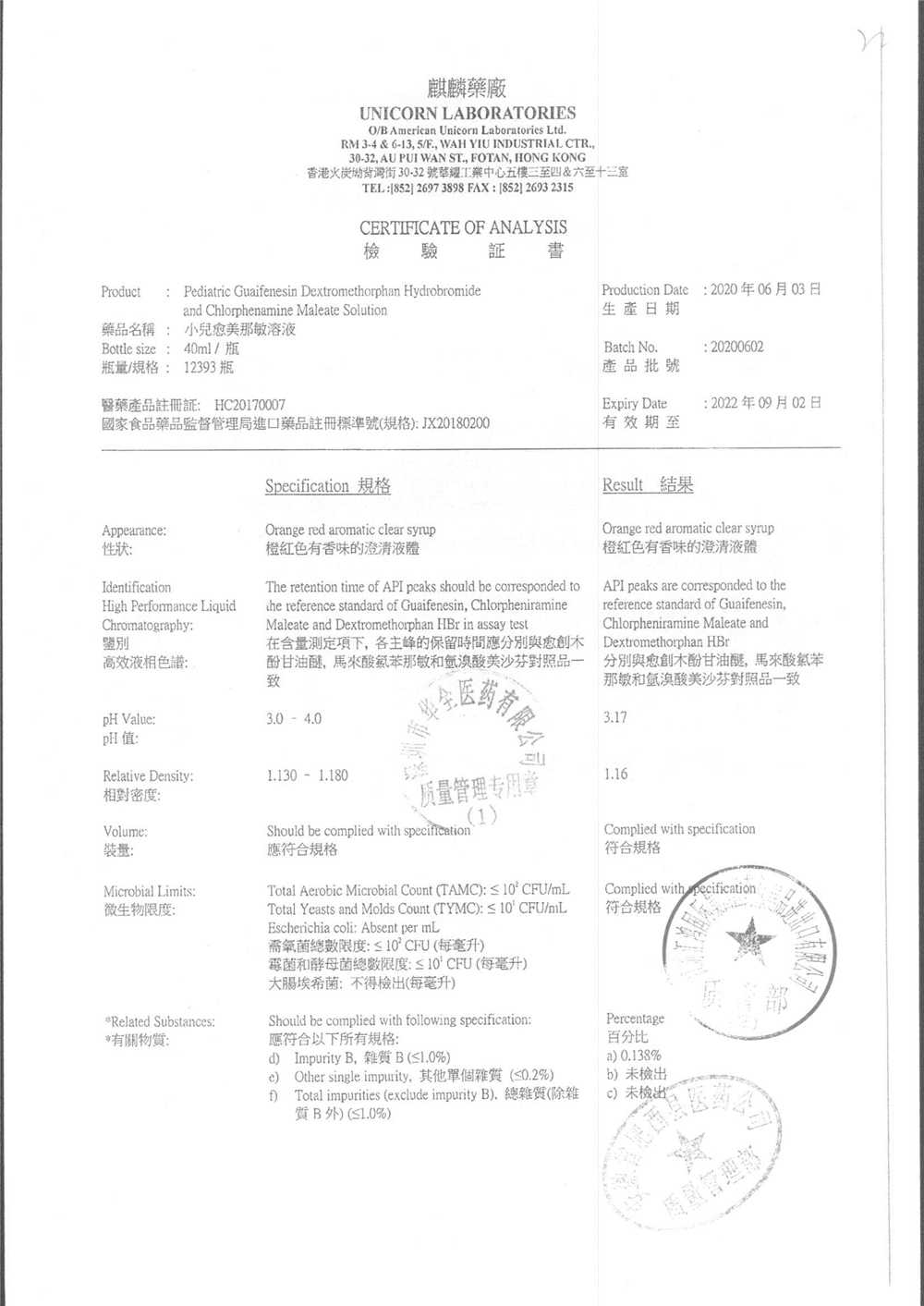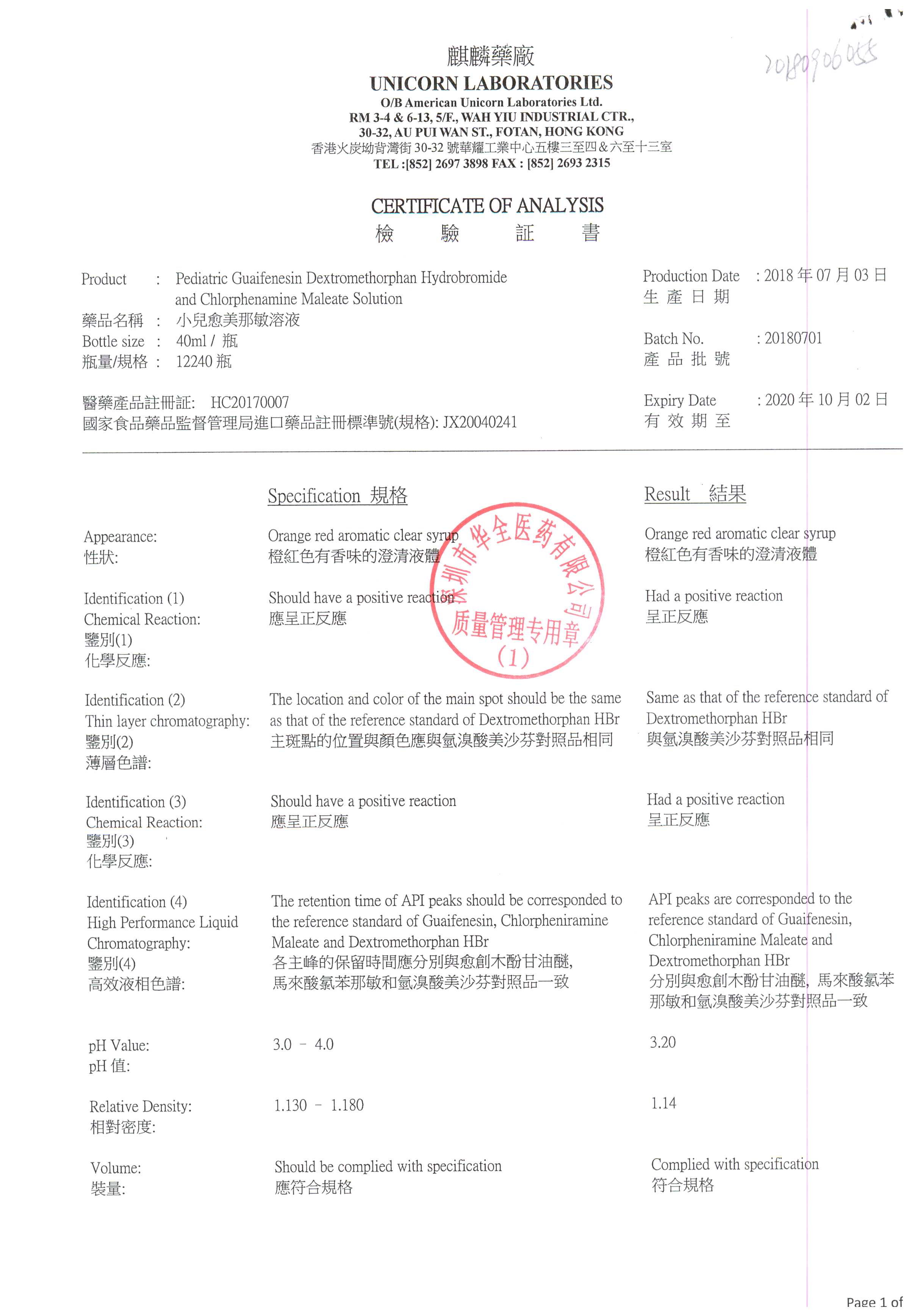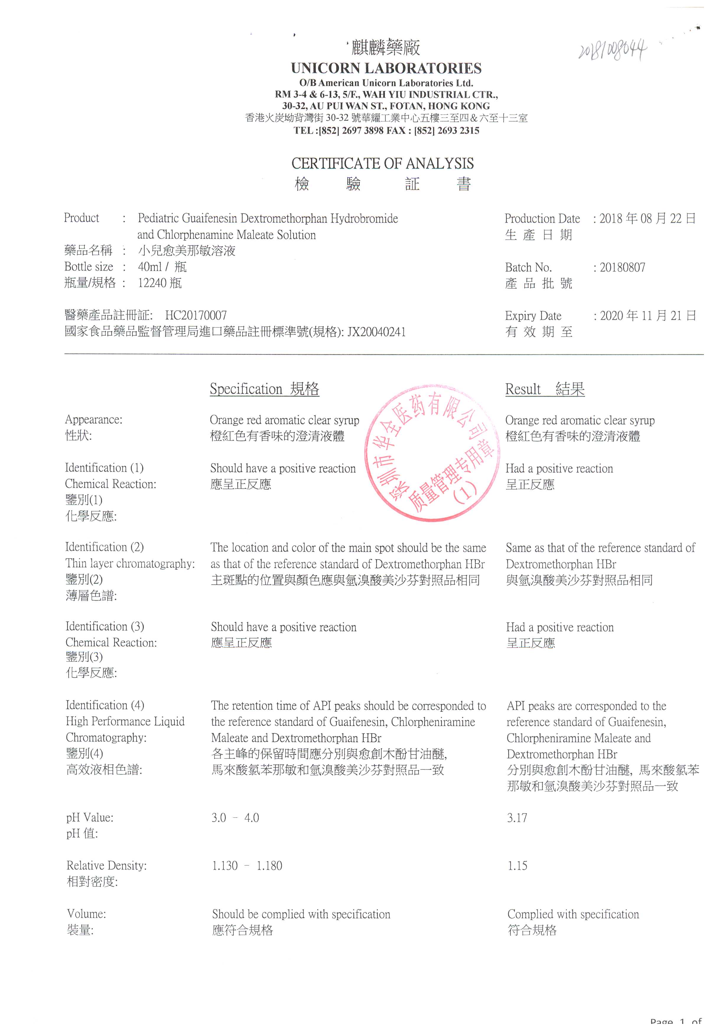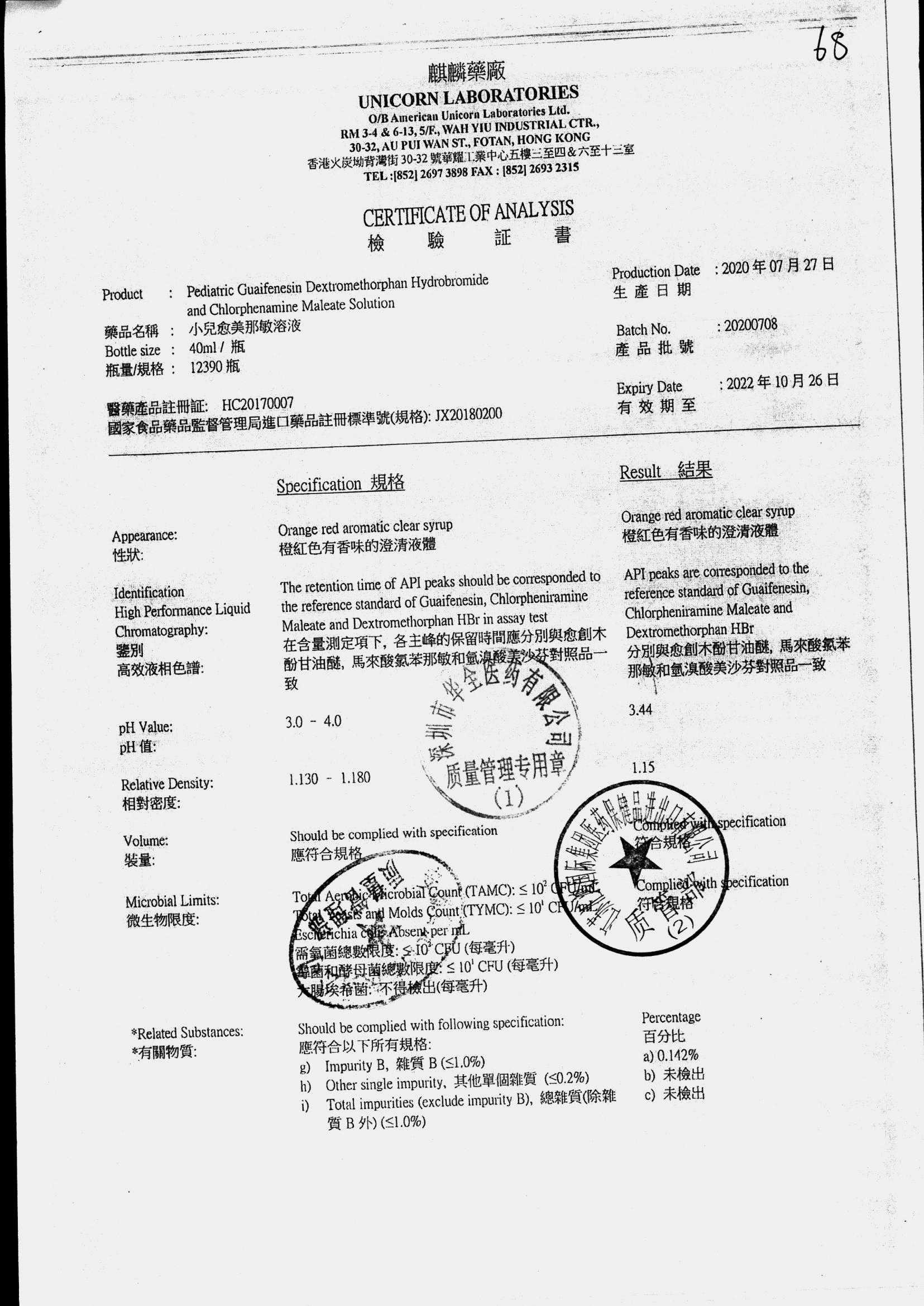 小儿愈美那敏溶液 | 40ml | 20180809(4/4) | 查看详情 |