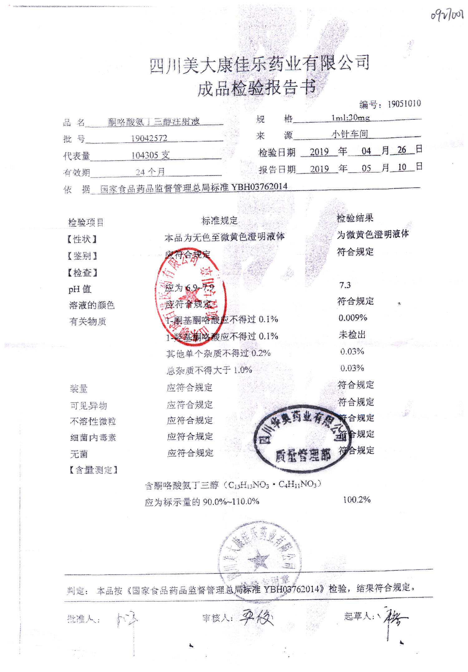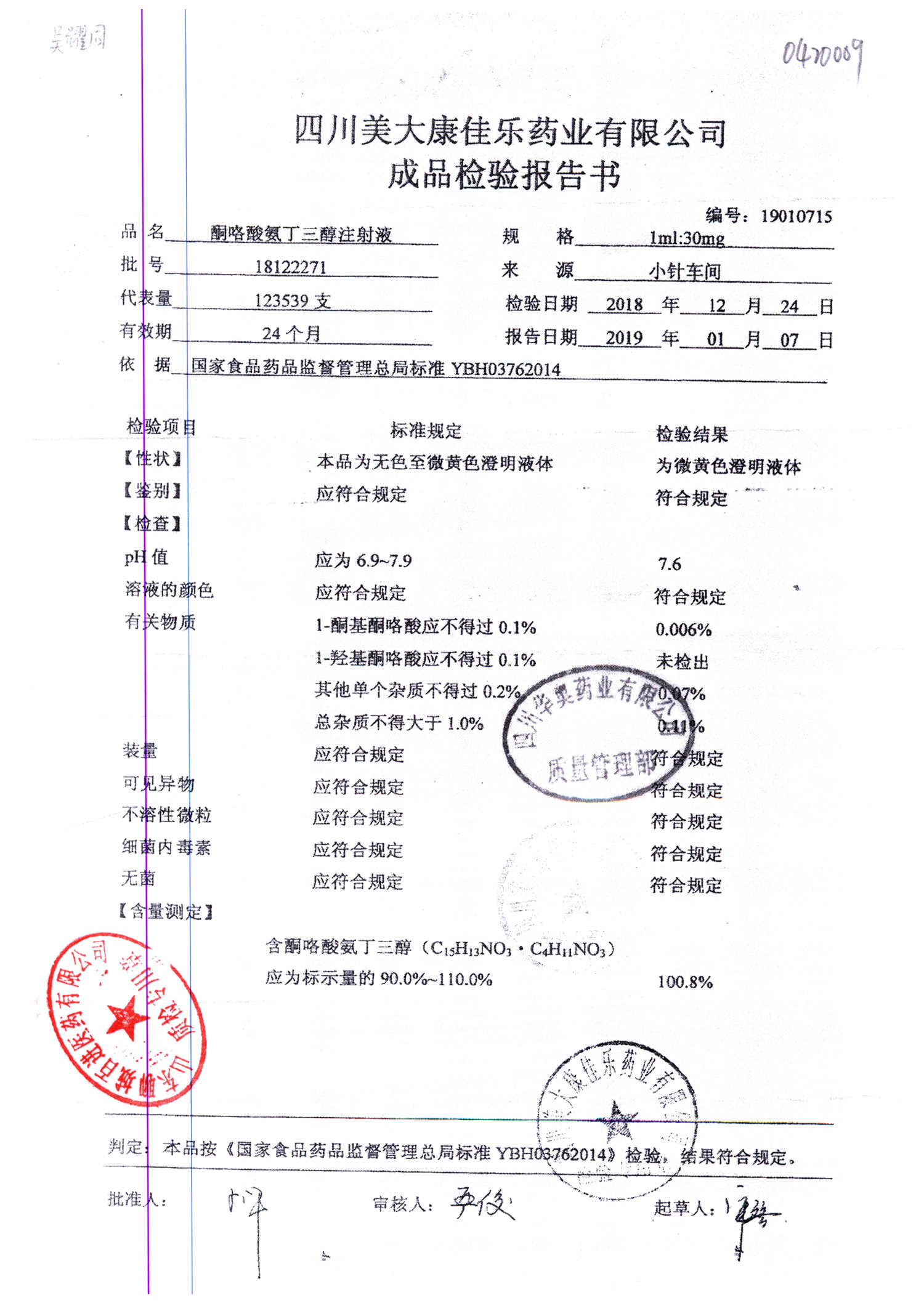 名称 | 规格 | 批号 | 药检报告 |