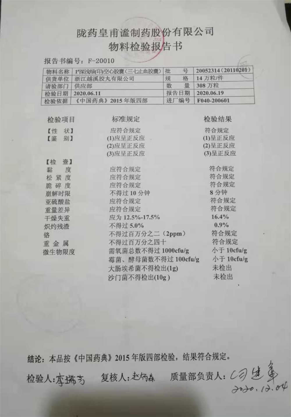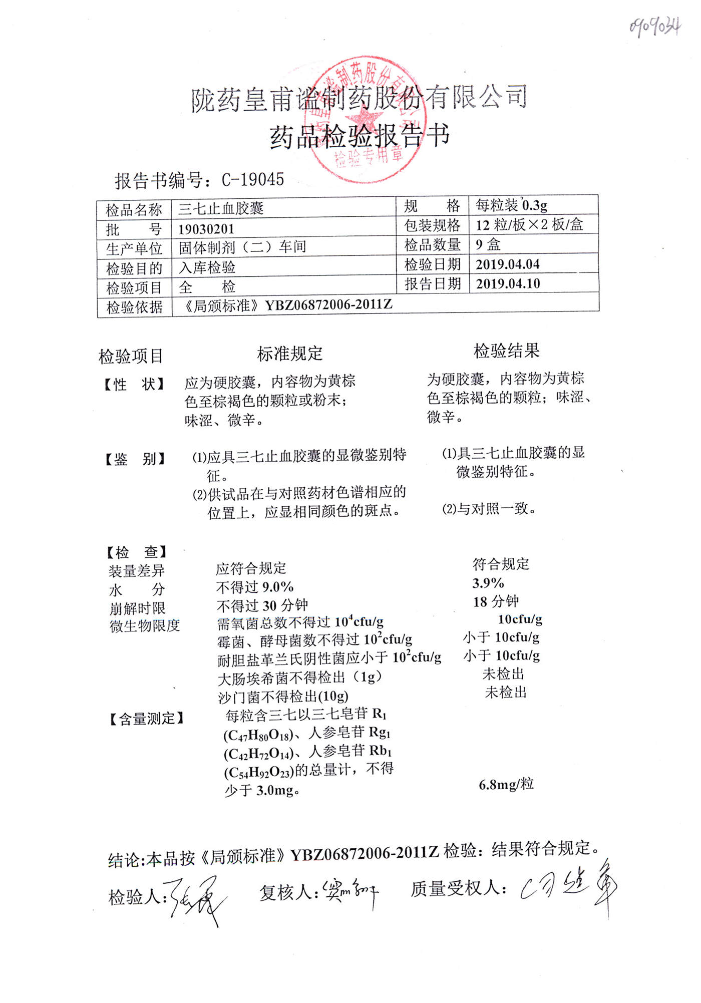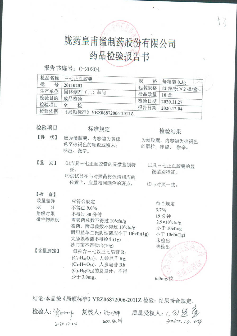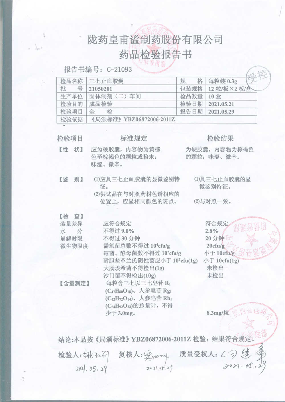 三七止血胶囊 | 0.3g*24粒 | 20110201(2/2) | 查看详情 |