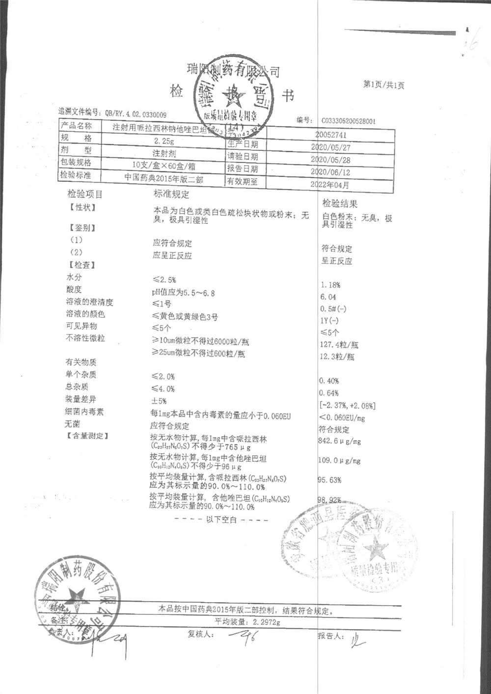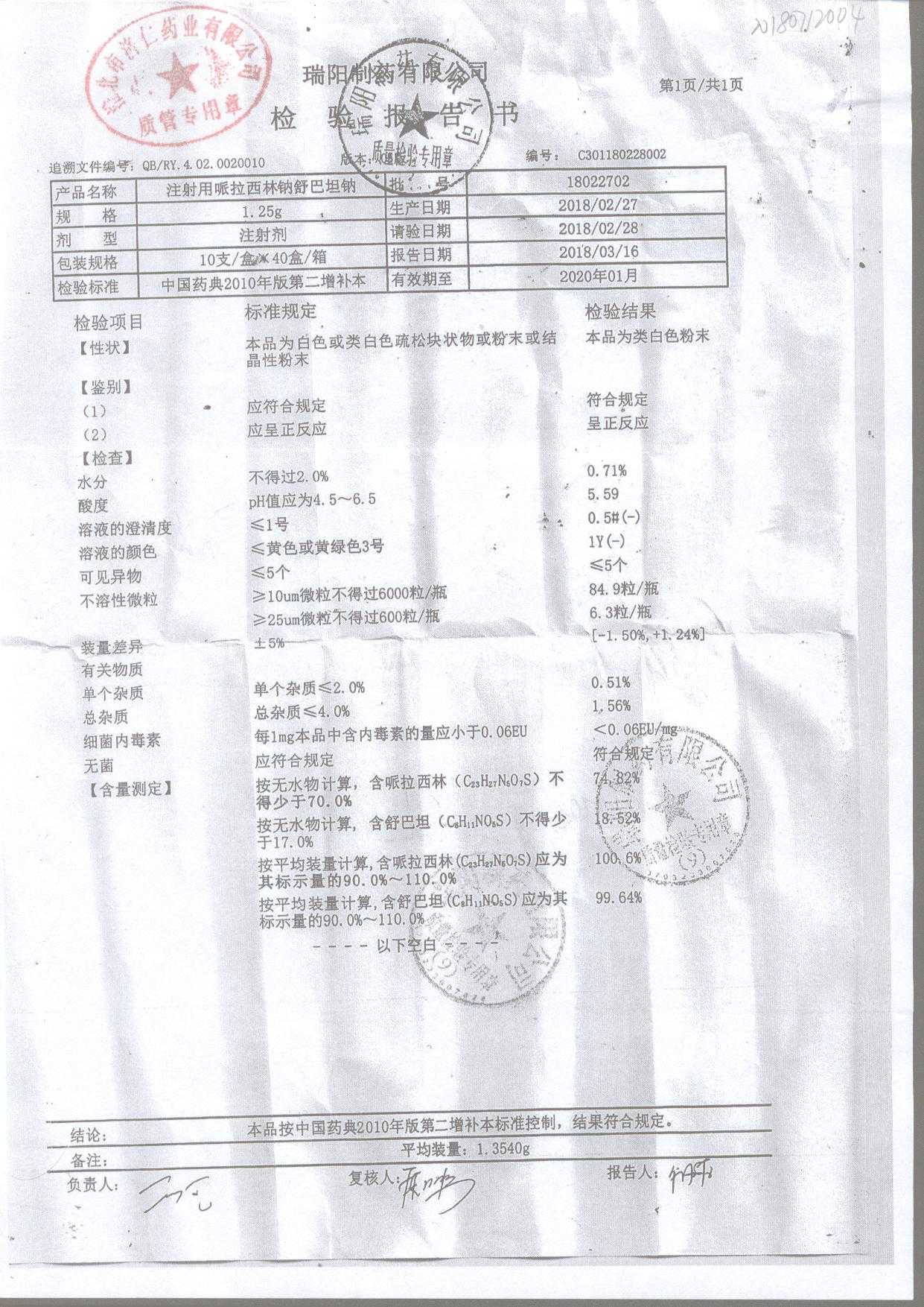 注射用哌拉西林钠舒巴坦钠 | 1.25g | 19010441(2/2) | 查看详情 |