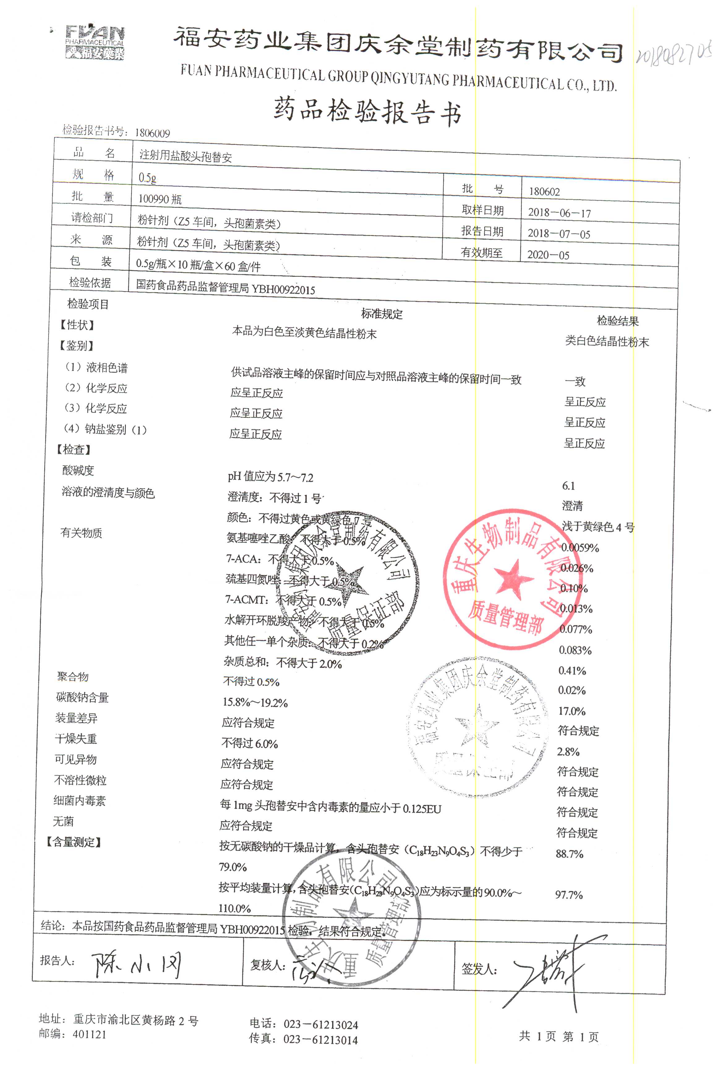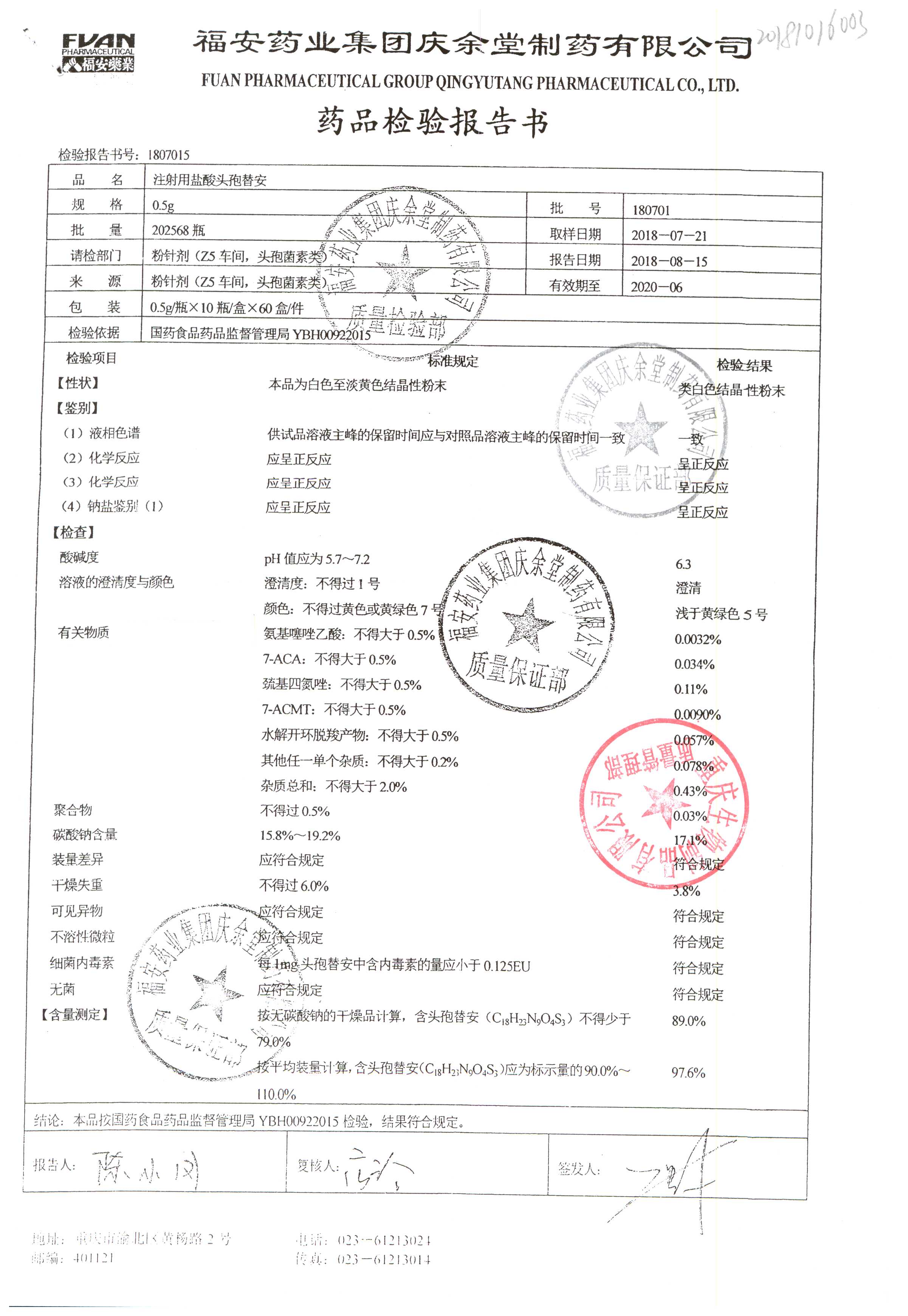 注射用盐酸头孢替安 | 0.5g | 180701 | 查看详情 |