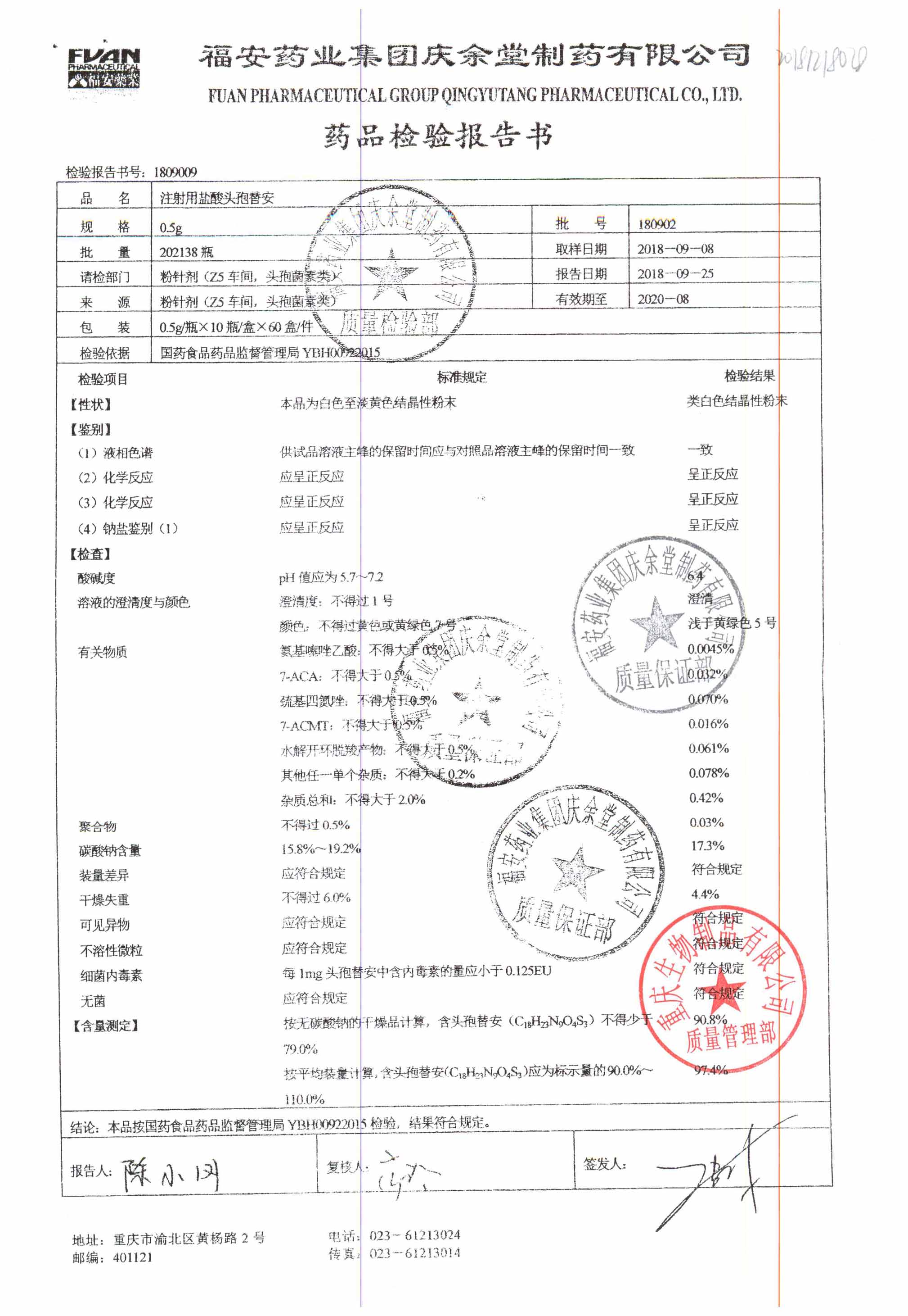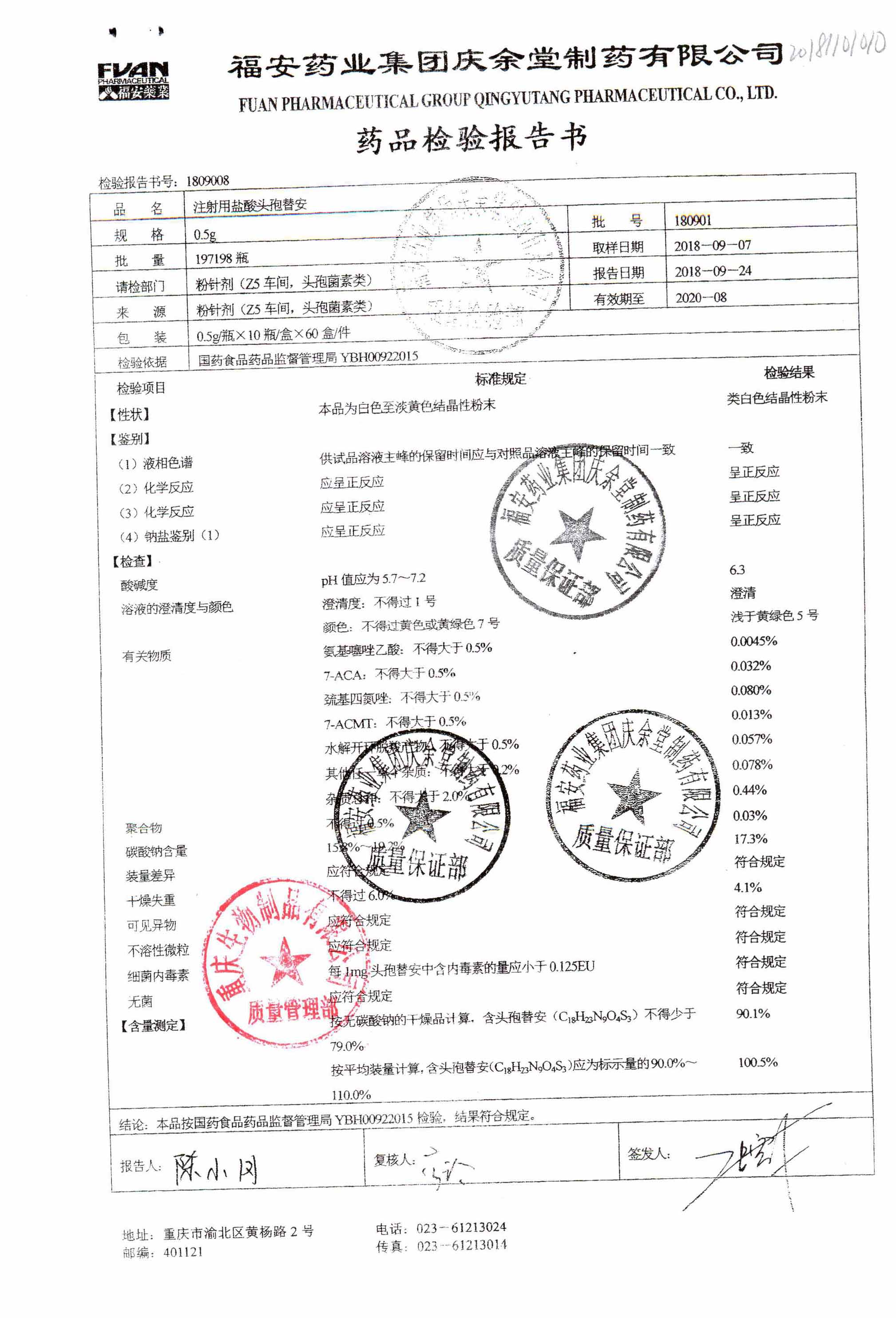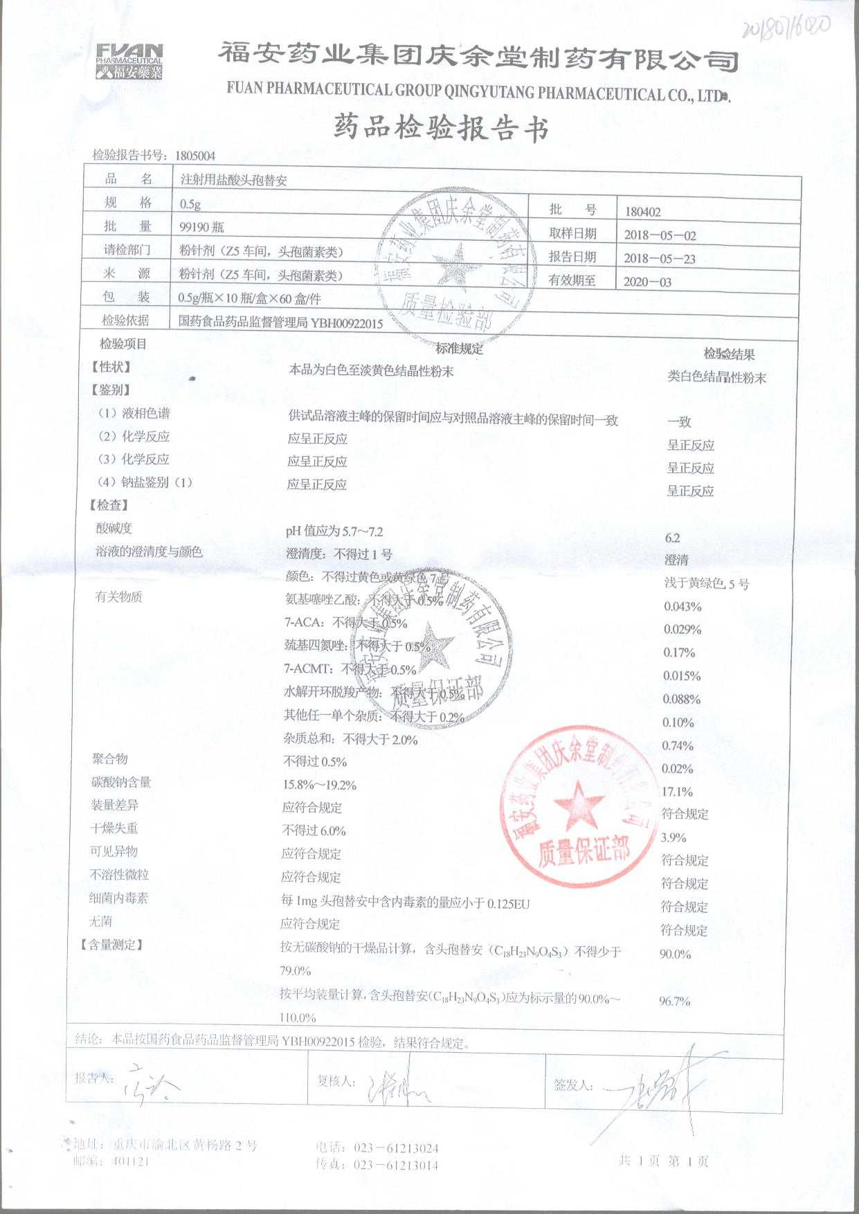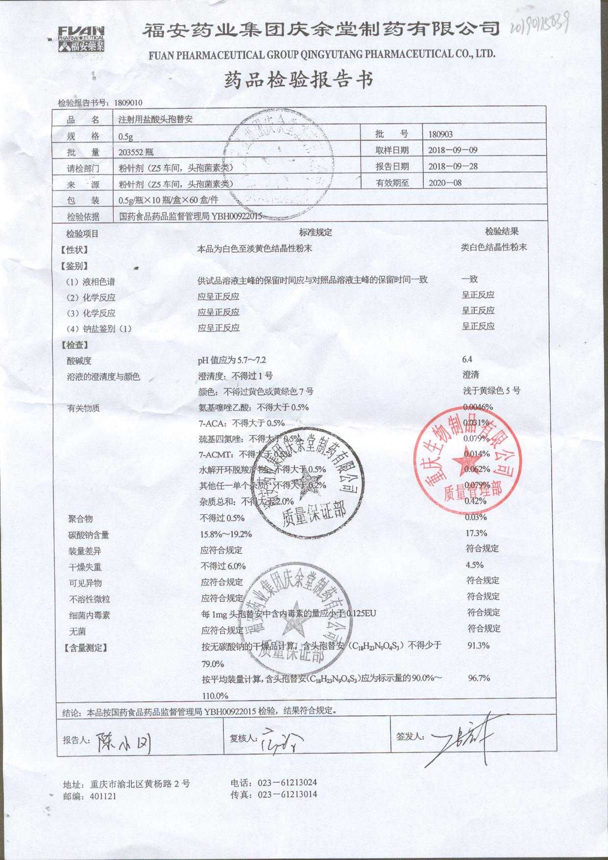 注射用盐酸头孢替安 | 0.5g | 180903 | 查看详情 |