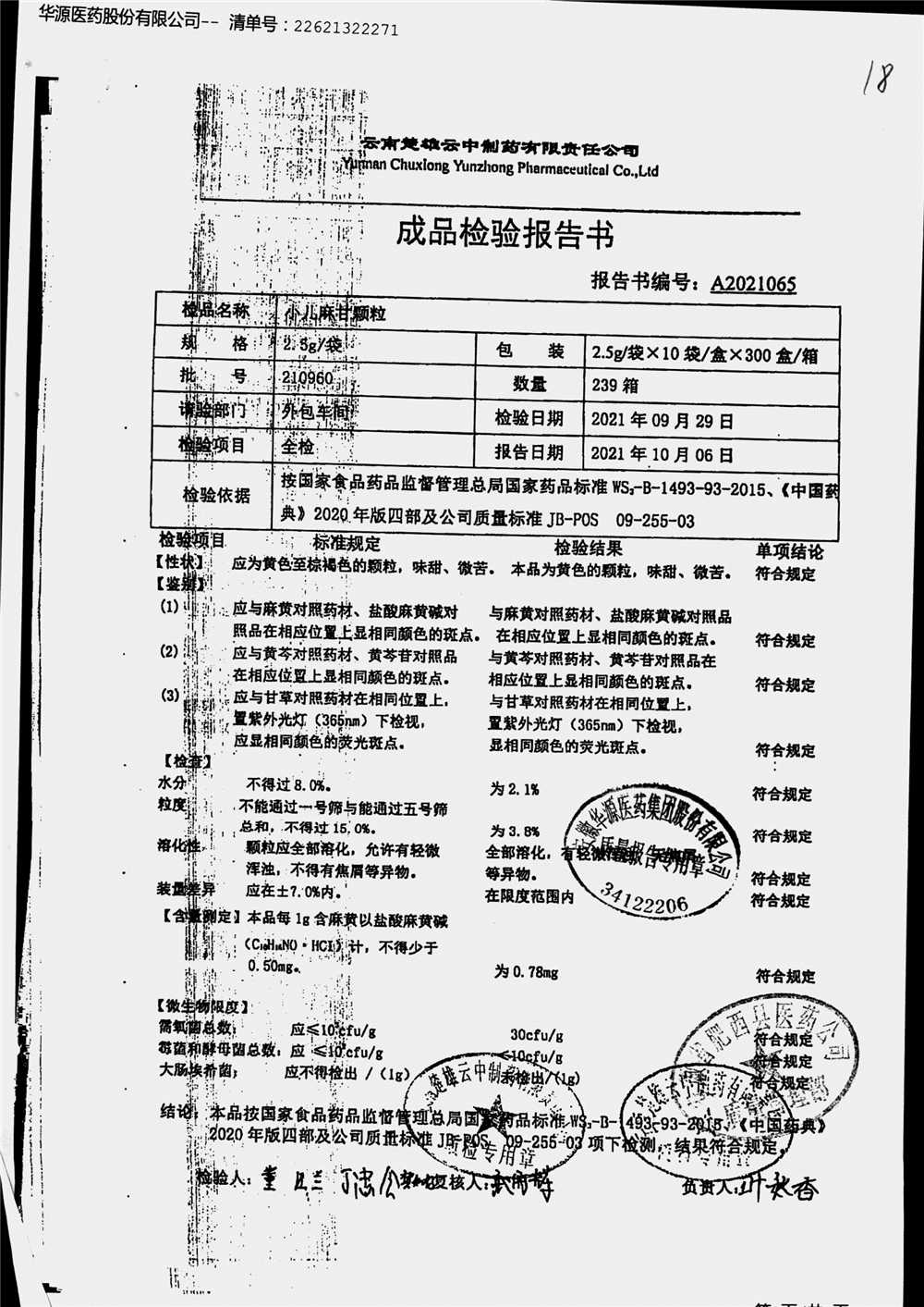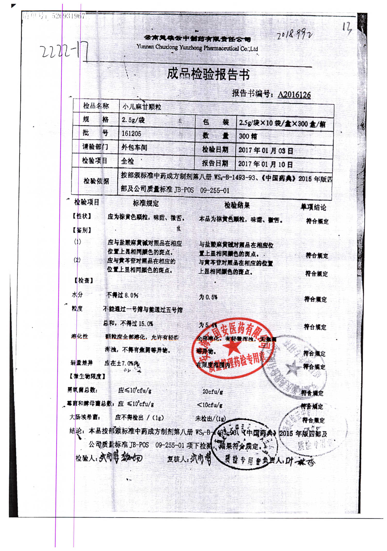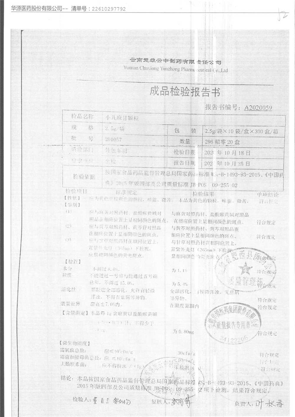 名称 | 规格 | 批号 | 药检报告 |